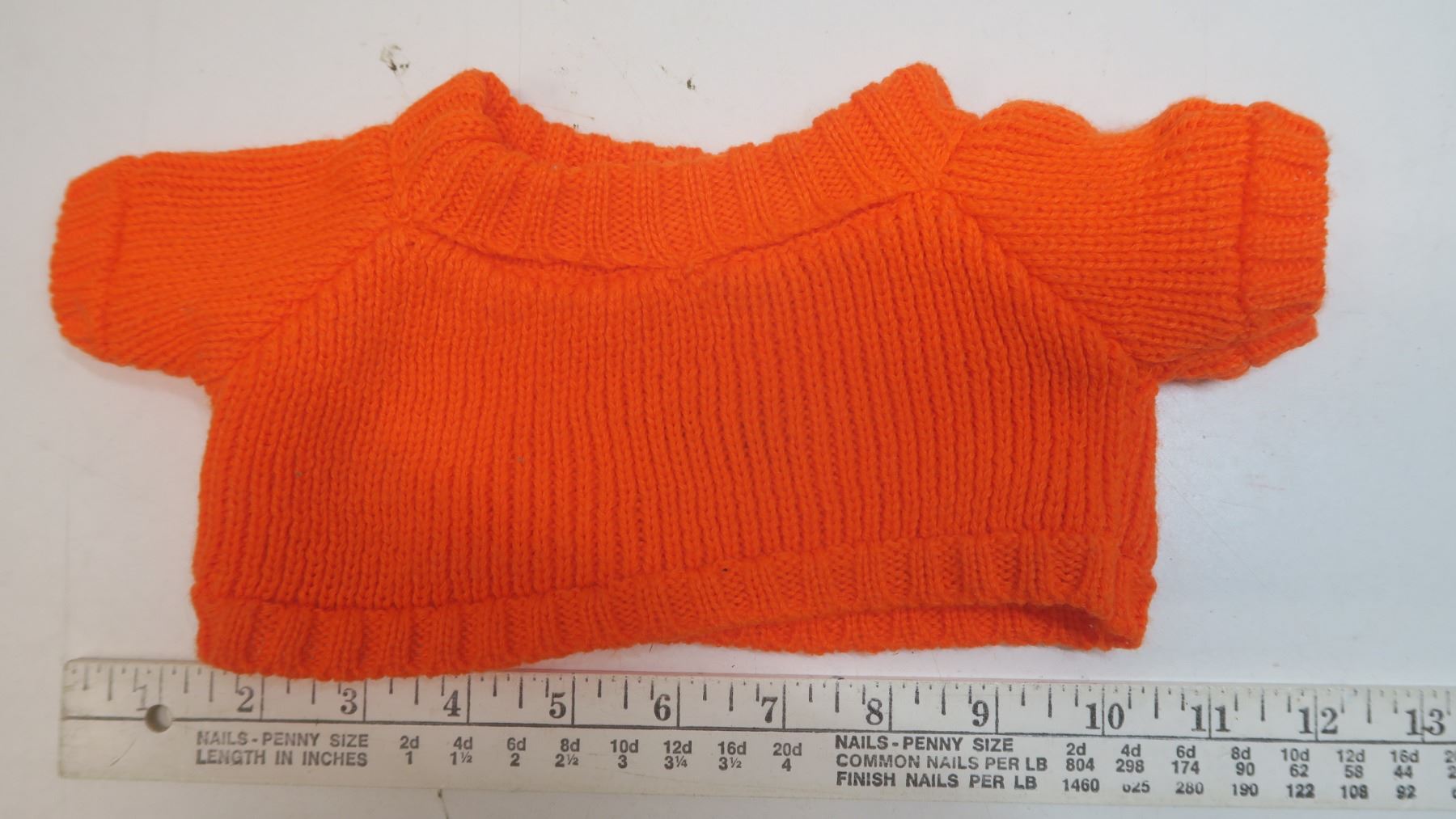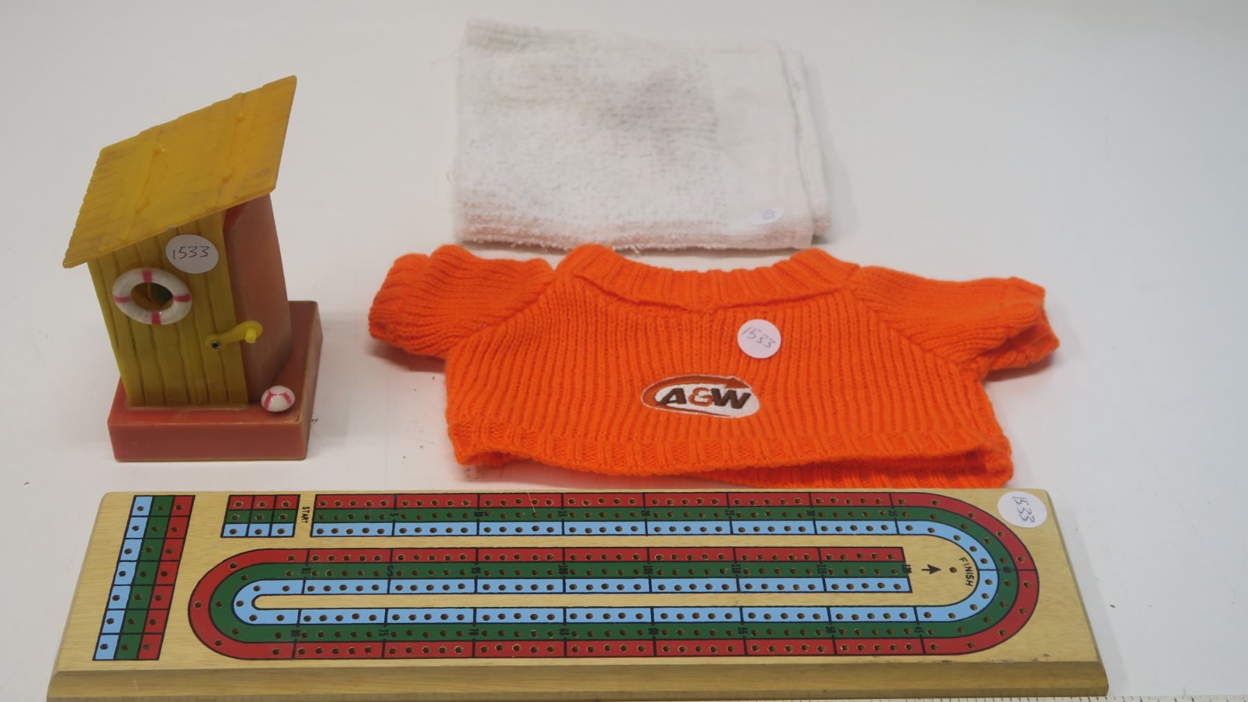 Wooden Cribbage Board + Plastic joke outhouse + Cloth + A&W doll sweater.