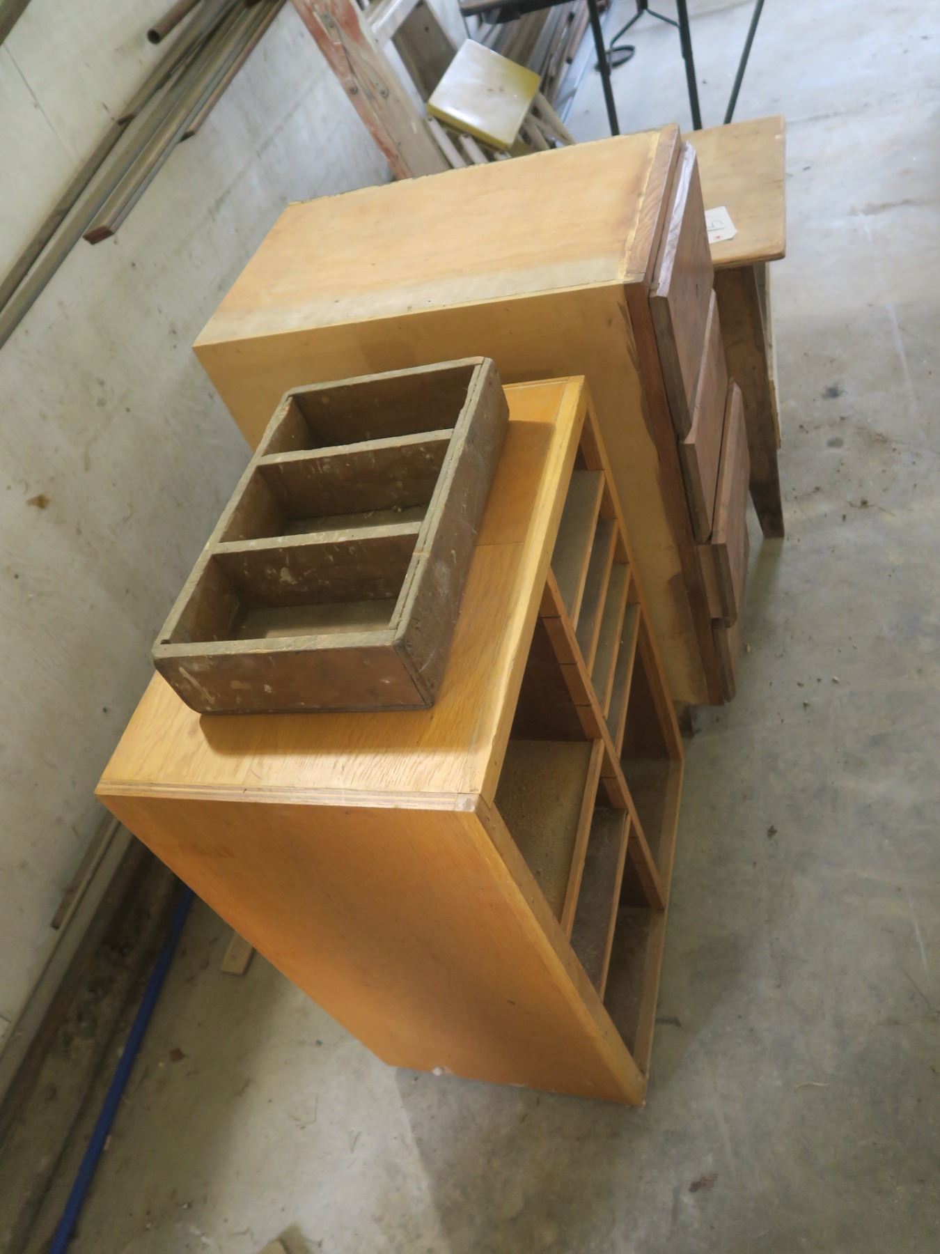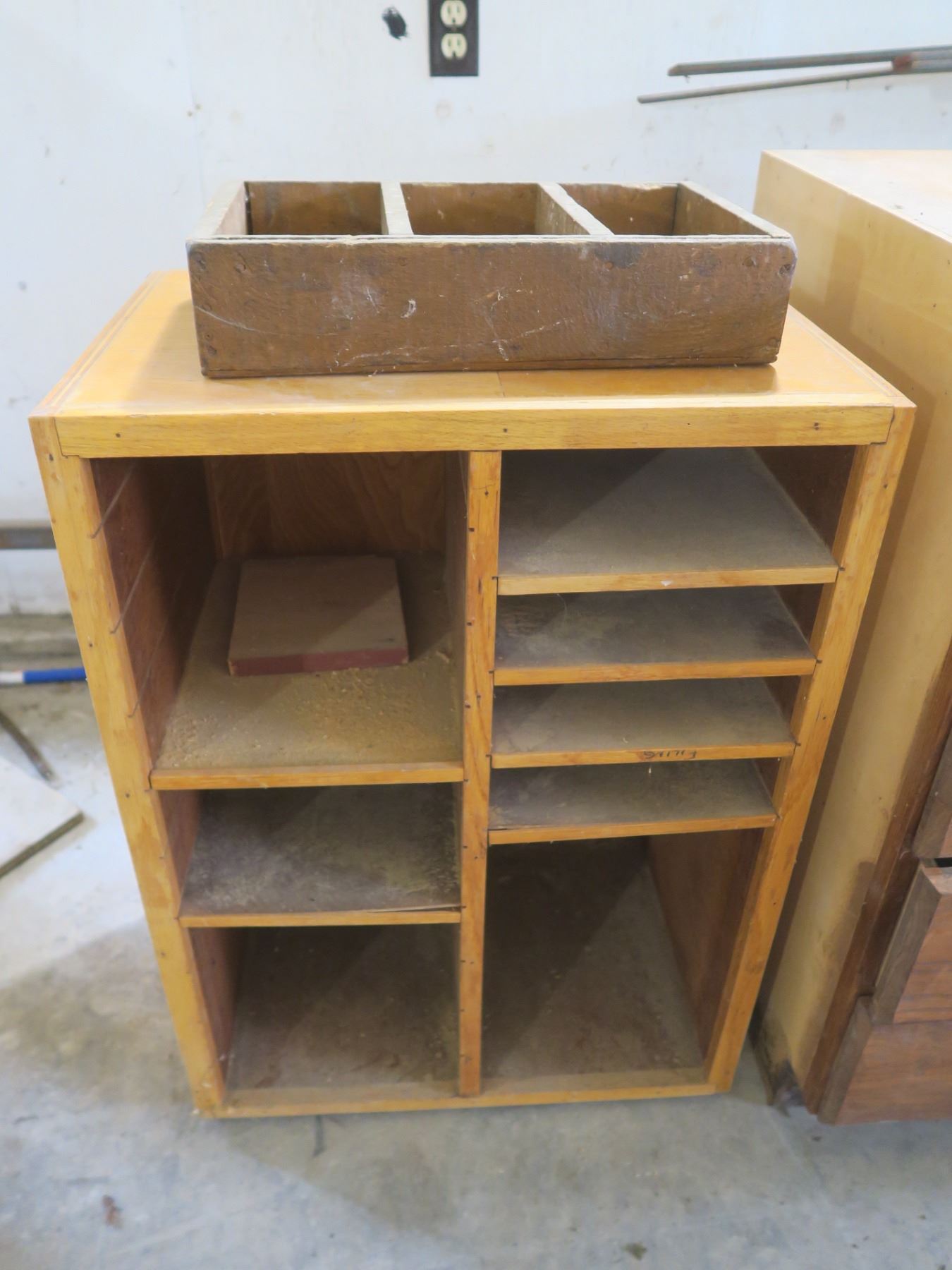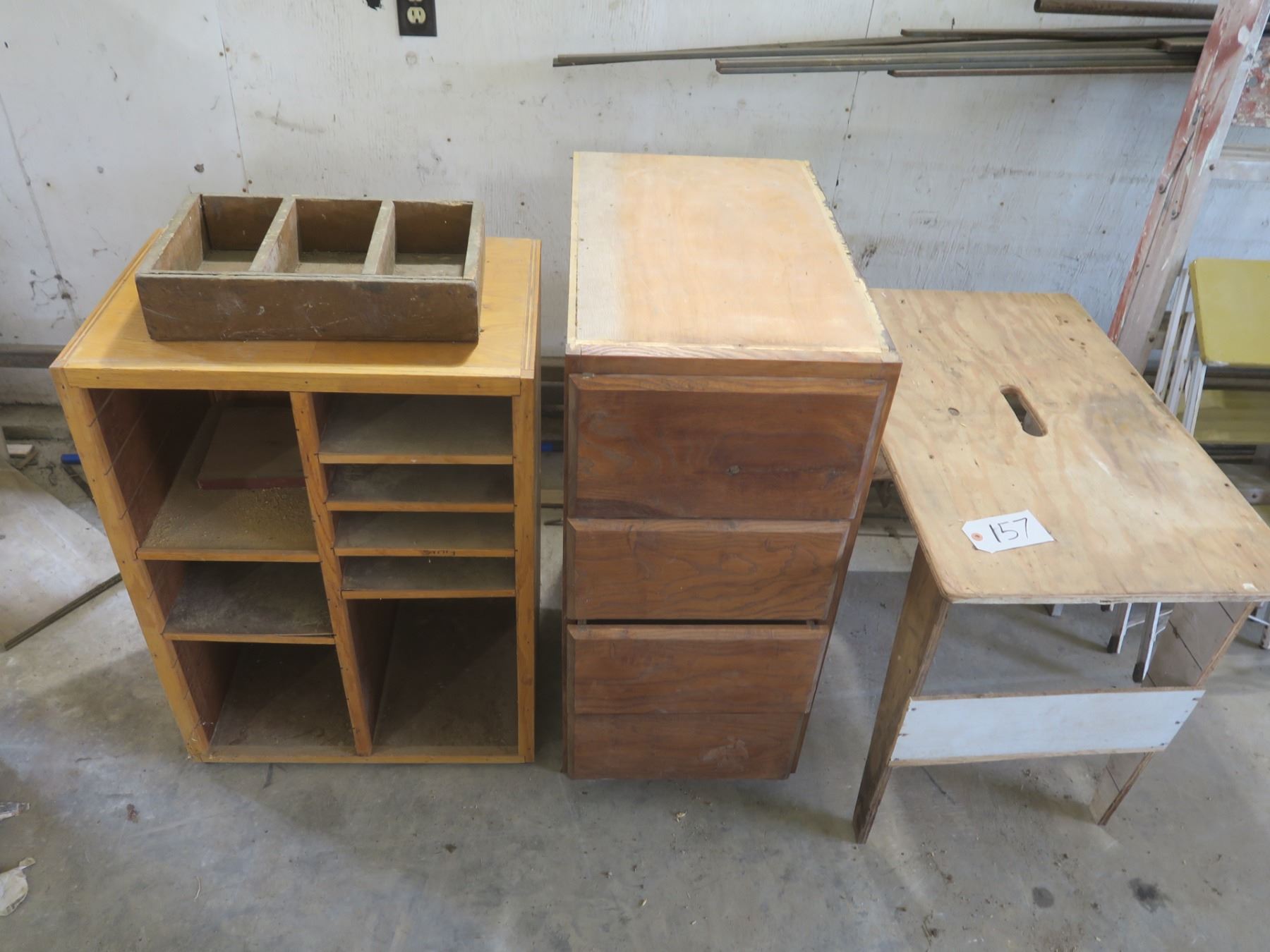 Work Bench 30”x19”x24”, Cabinet 24”x 34”x 14.5”, Shelving unit 22”x 15”x 31”, Hanging shelf 15.5”x 9 3/4”