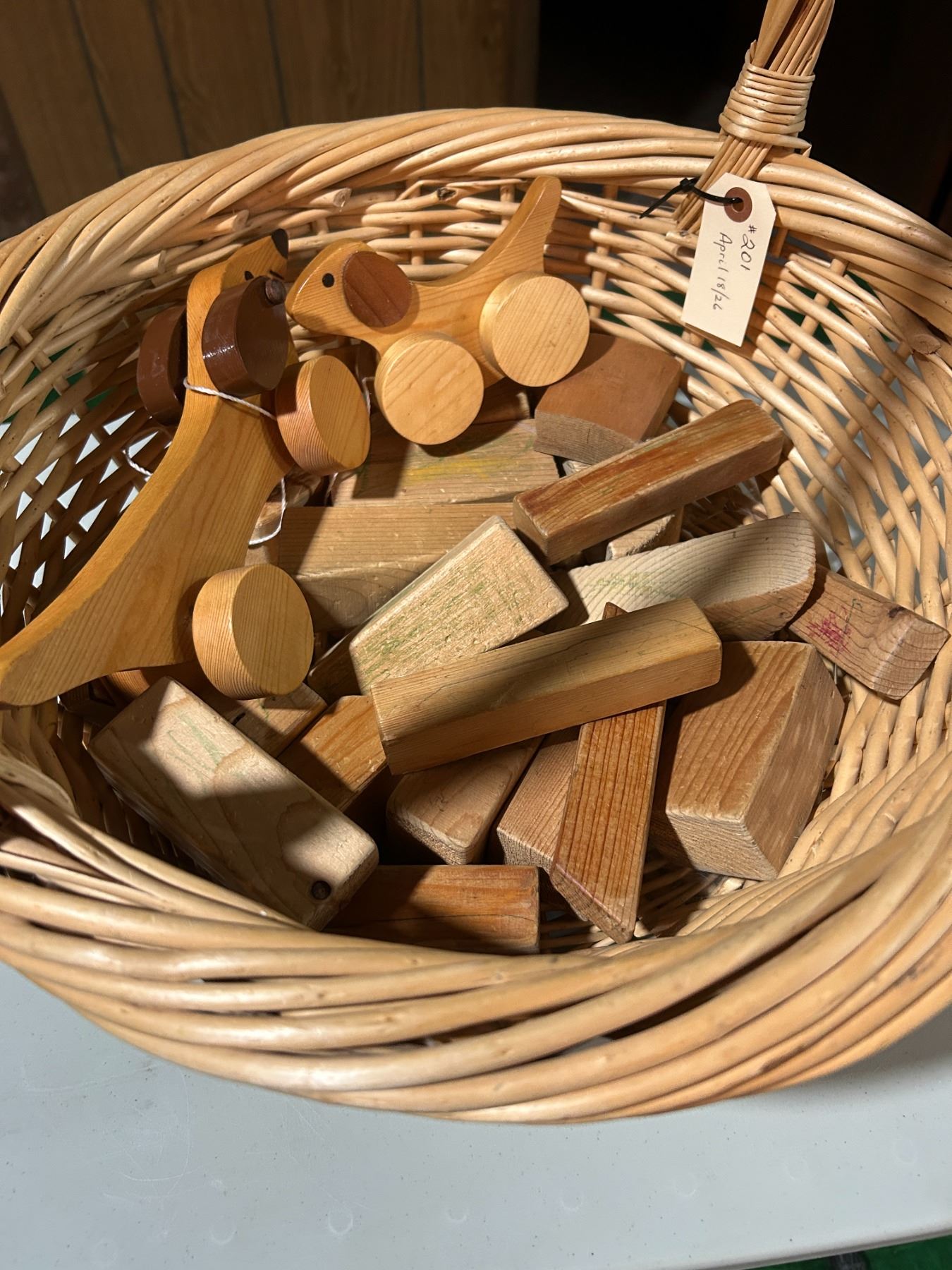 Wooden block toys, pull toys, and wicker basket