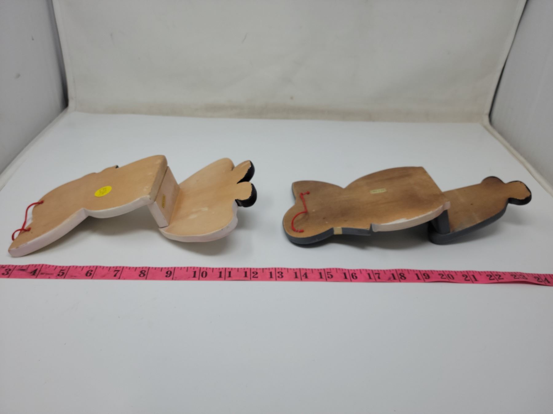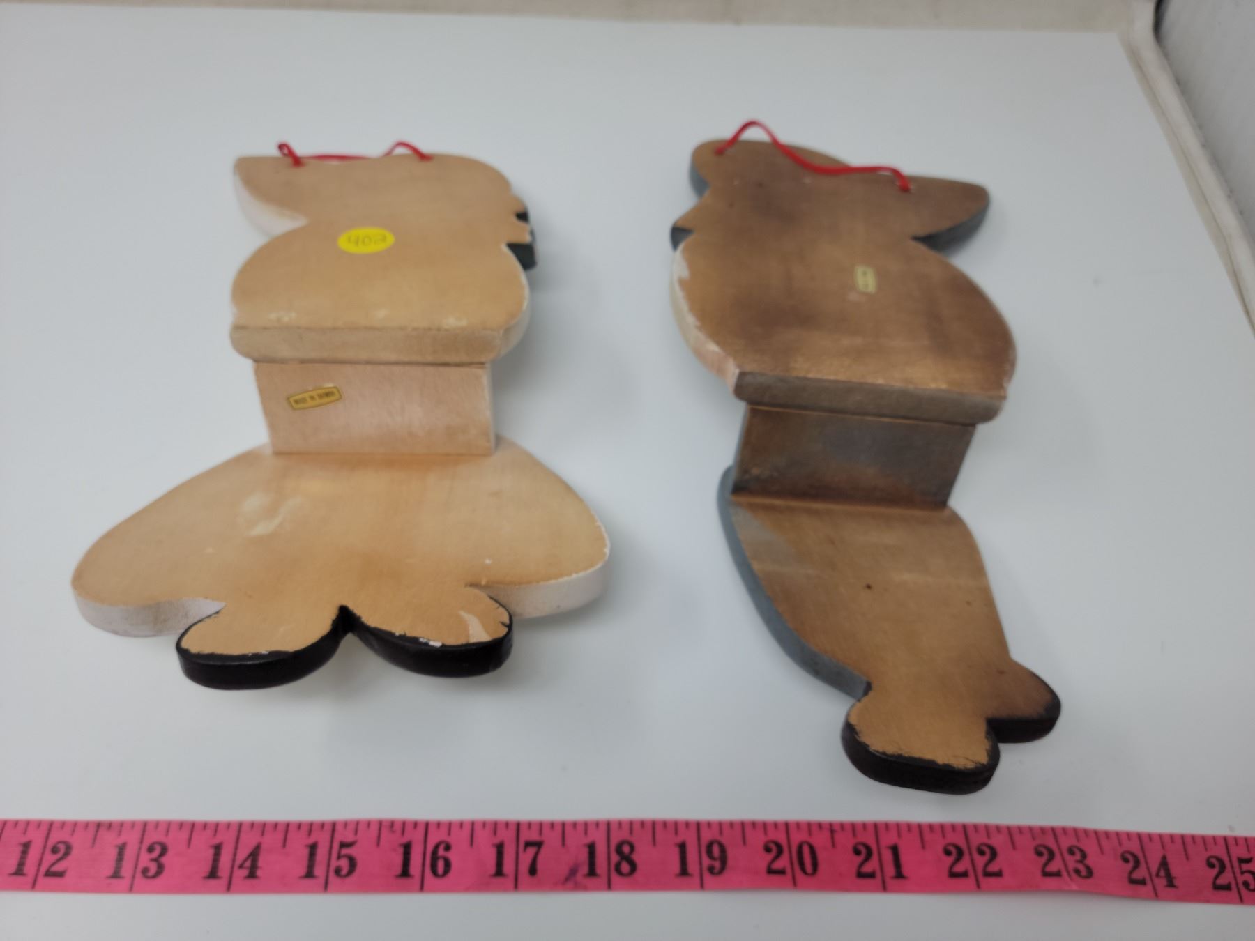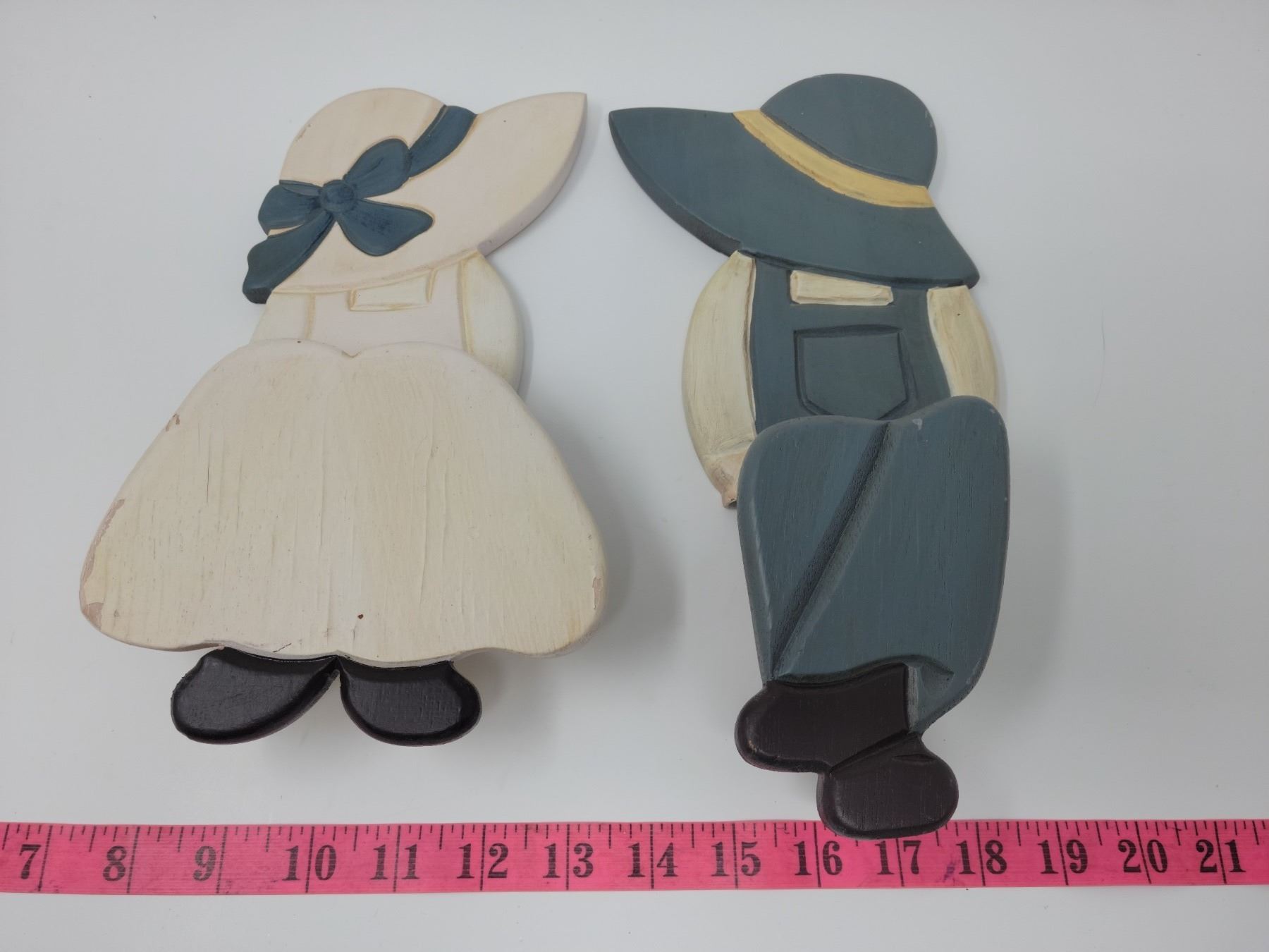 Wooden boy & girl shelf sitters or wall hangings. 11" & 10" tall respectively (sit on edge of shelf)
