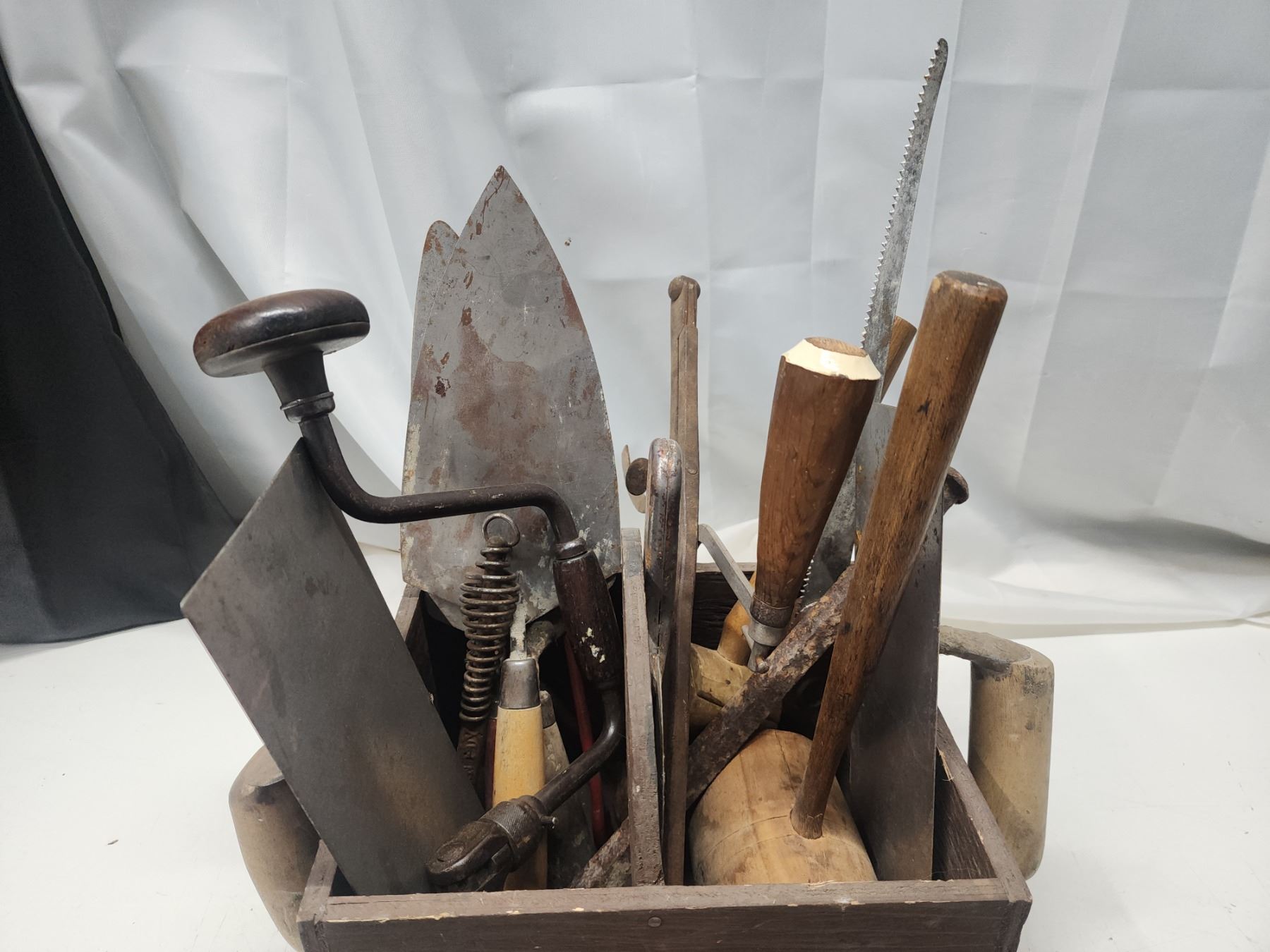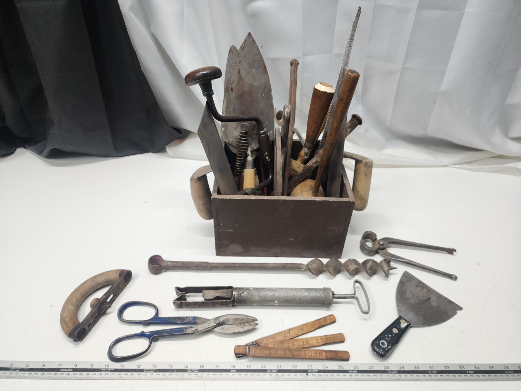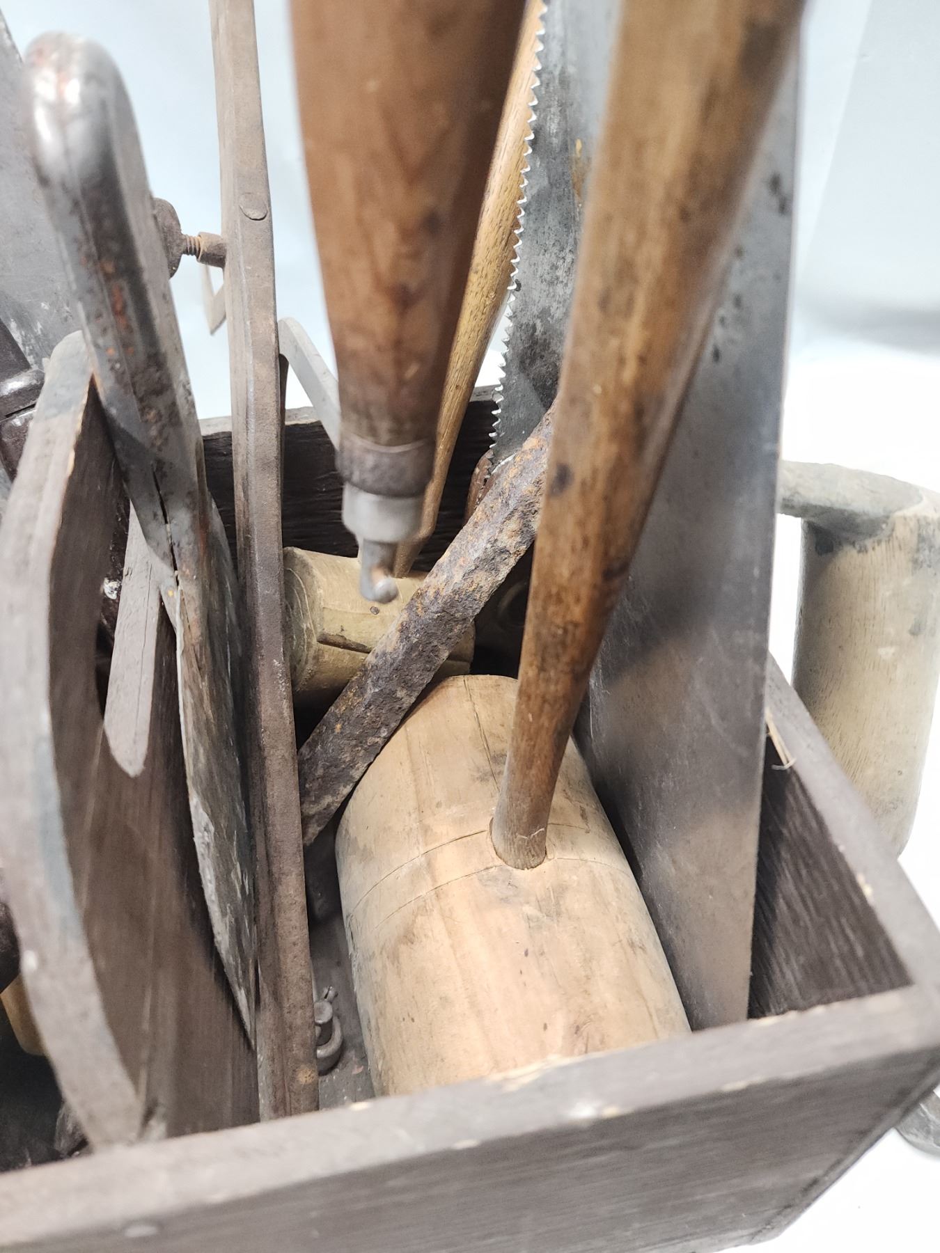 Wooden carry case of vintage tools