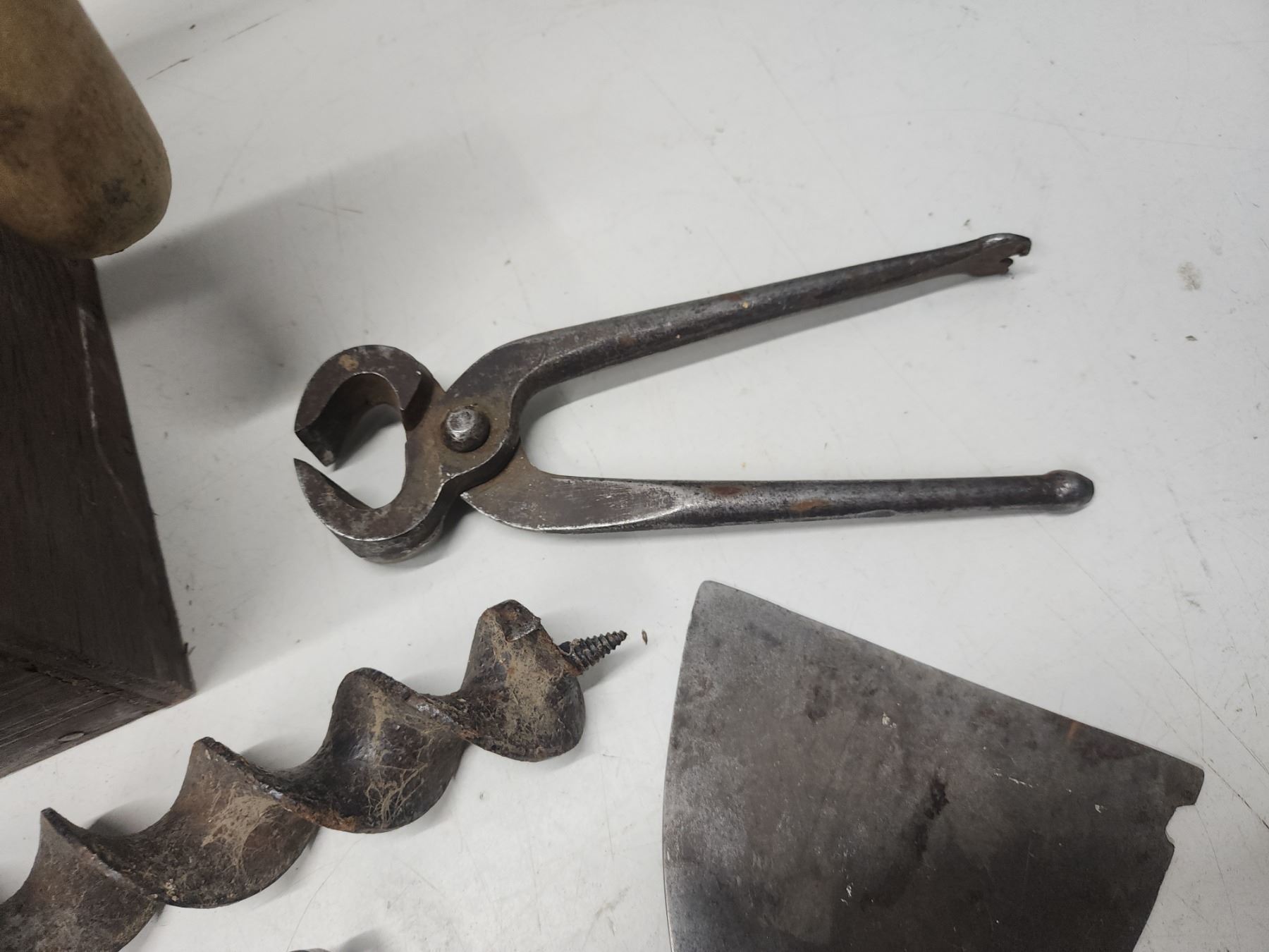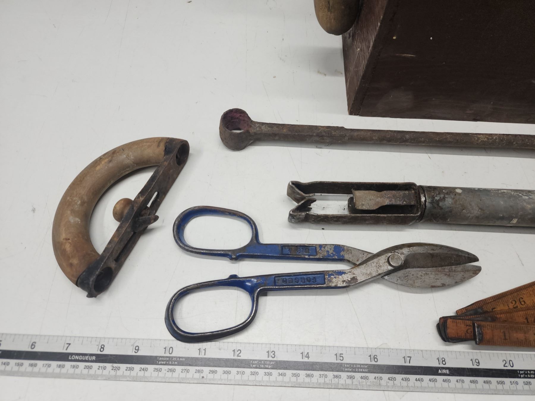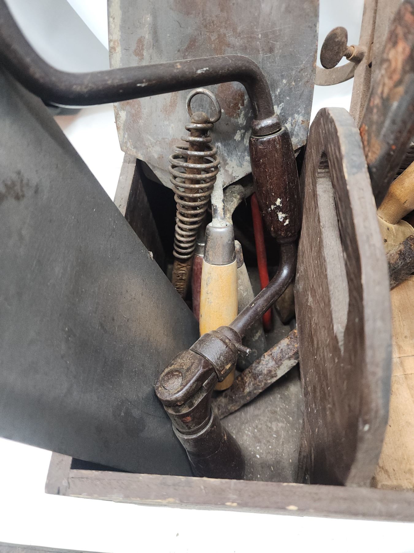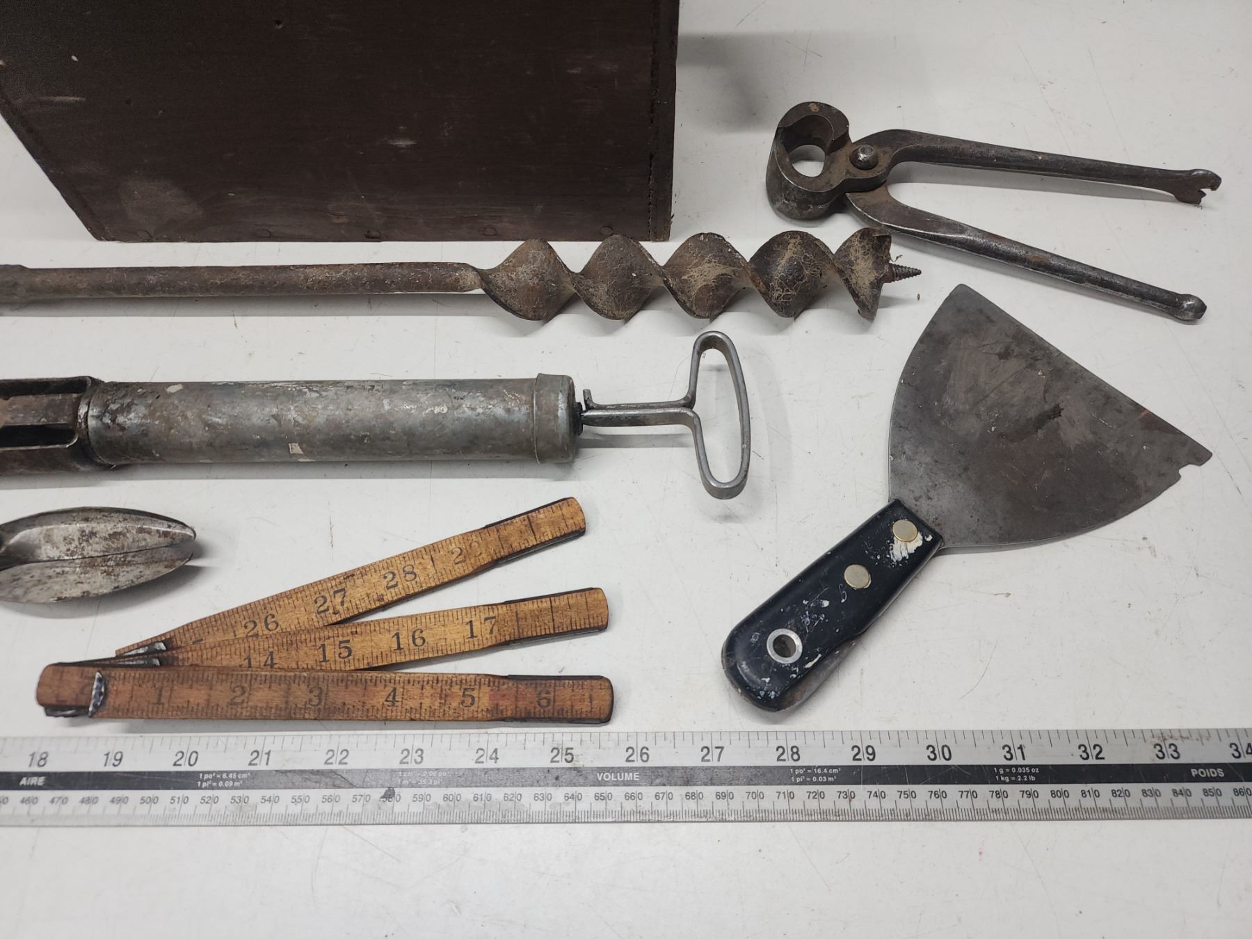 Wooden carry case of vintage tools