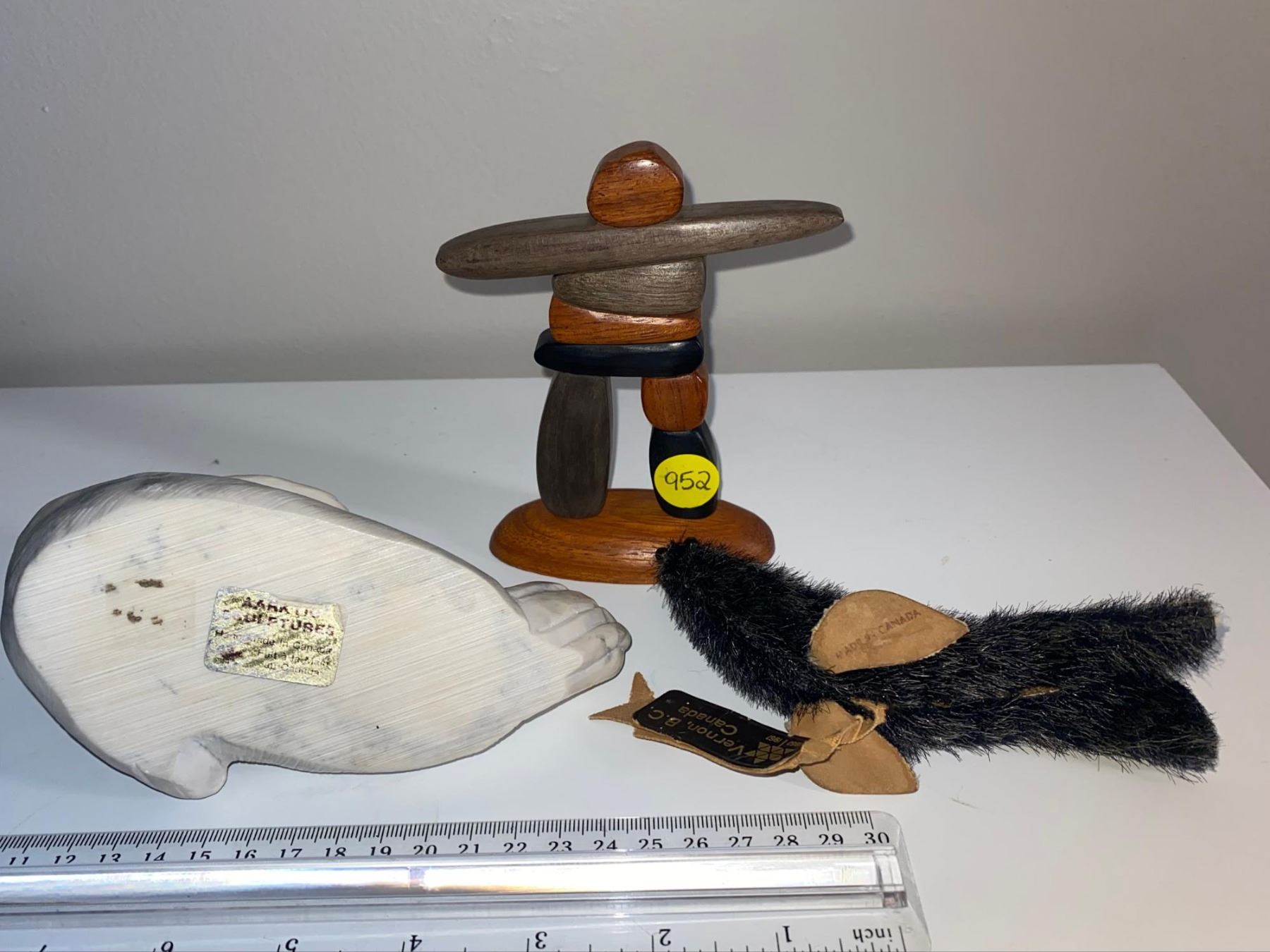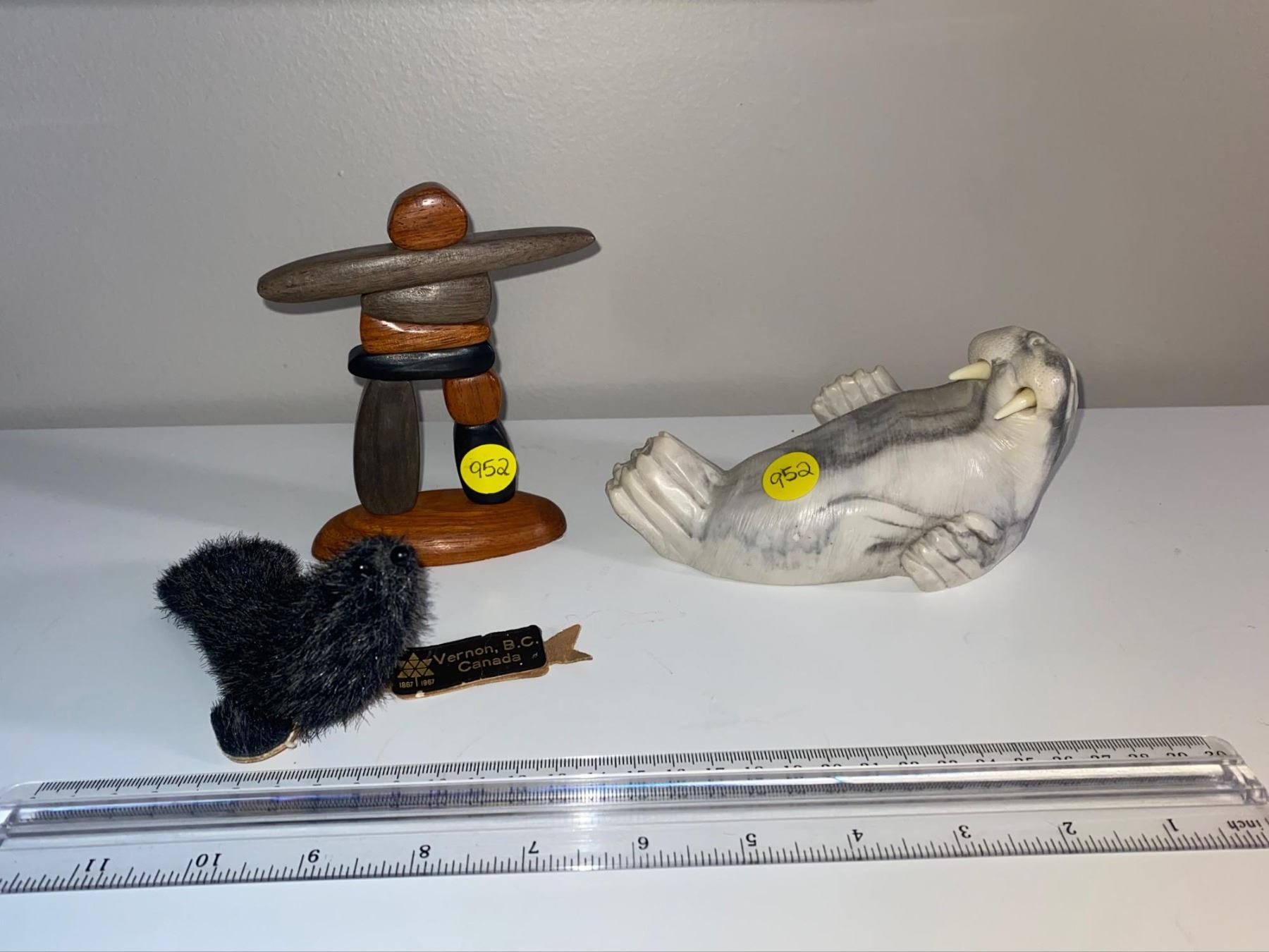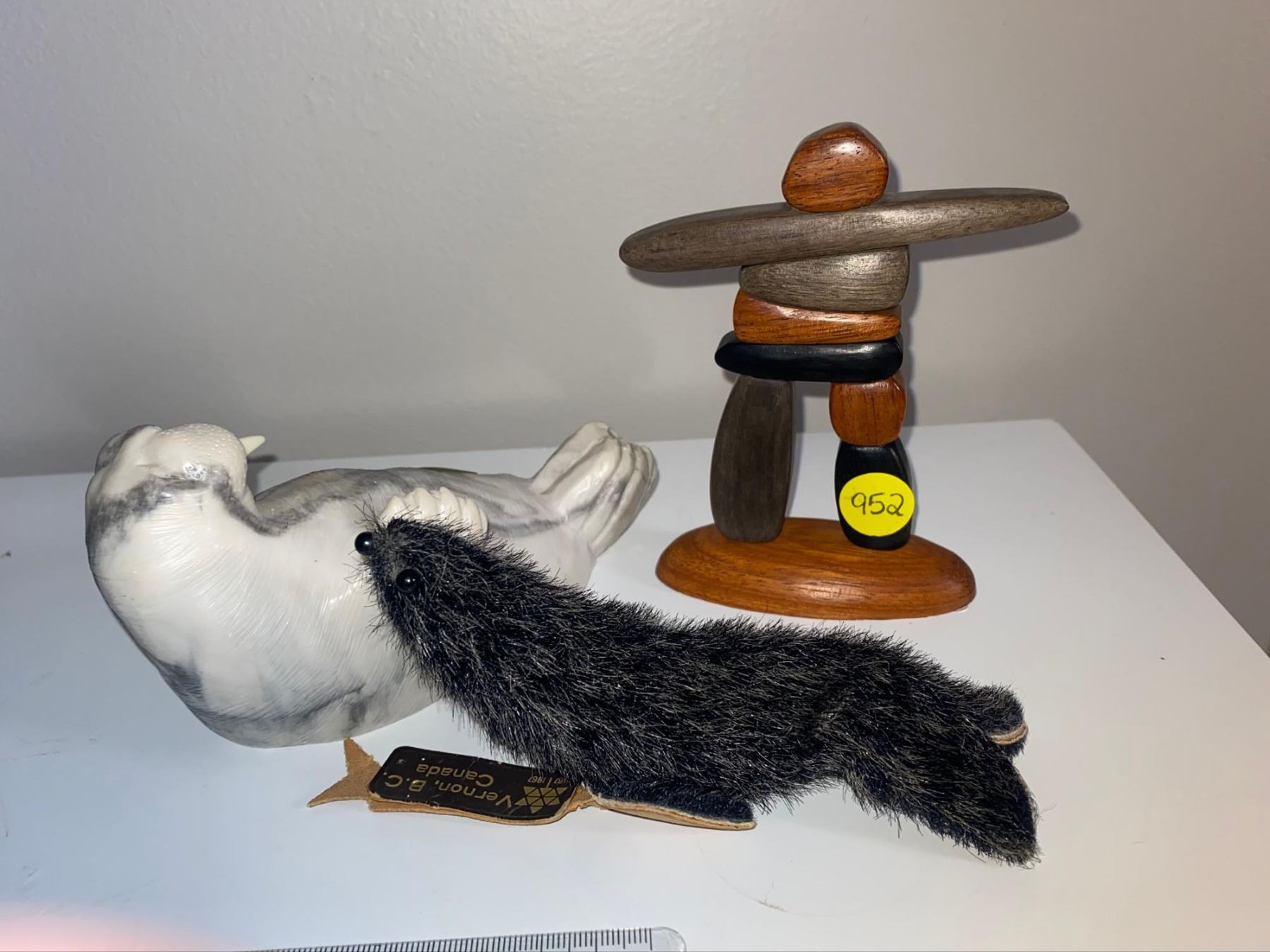 Wooden carved inuksuk, vintage stone carved walrus, and leather/ fur vintage seal.