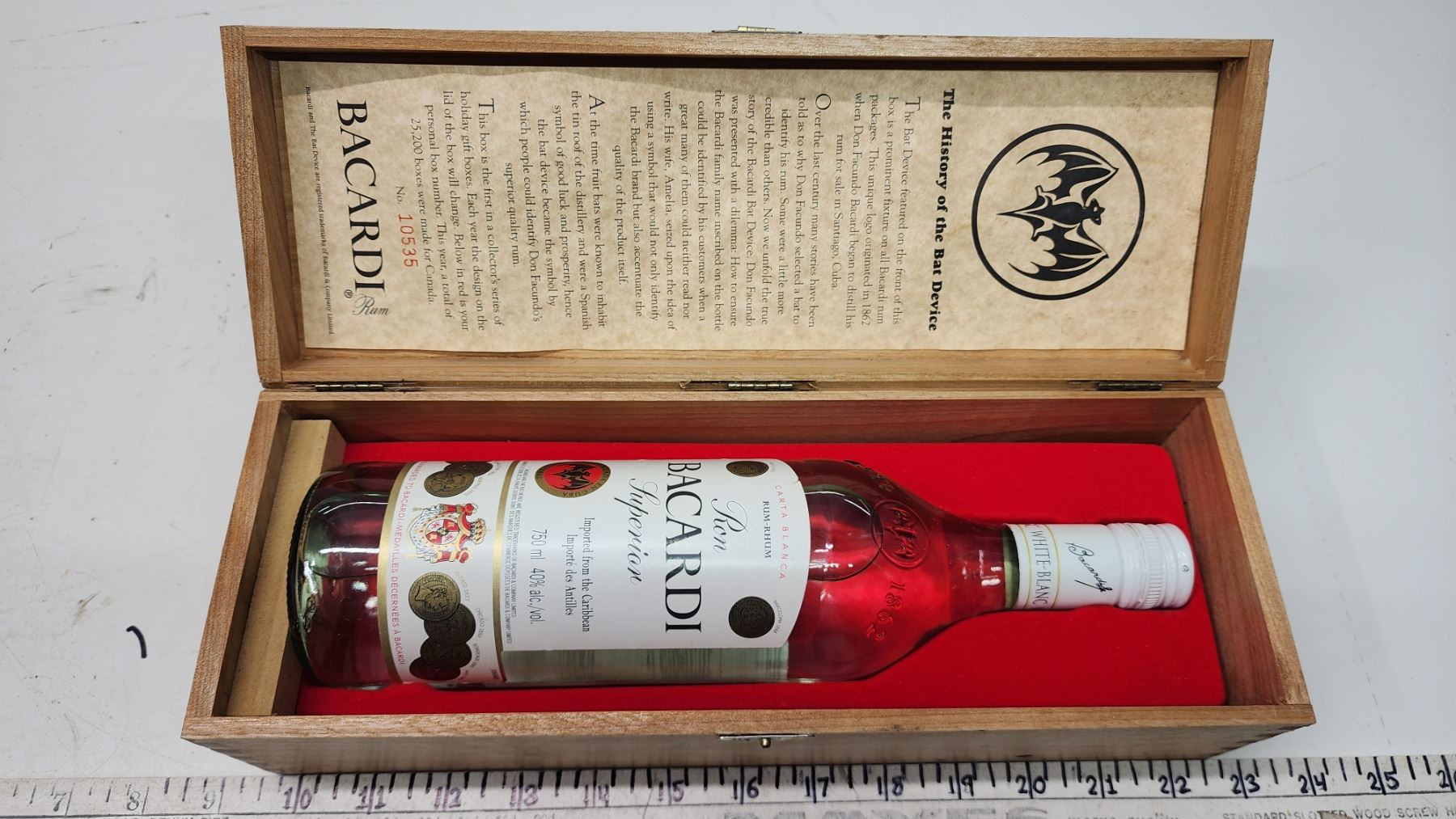 Wooden collectors Barcardi box, comes with 750mL 40% White rum - sealed - #10,535/25,500