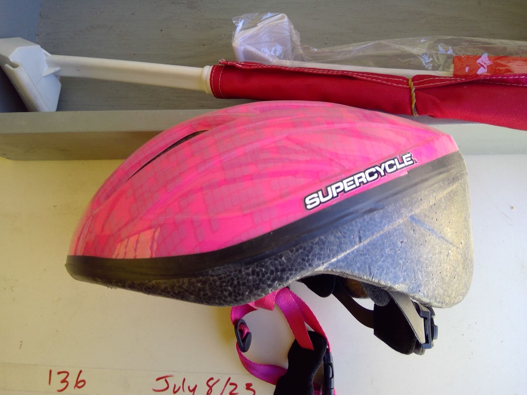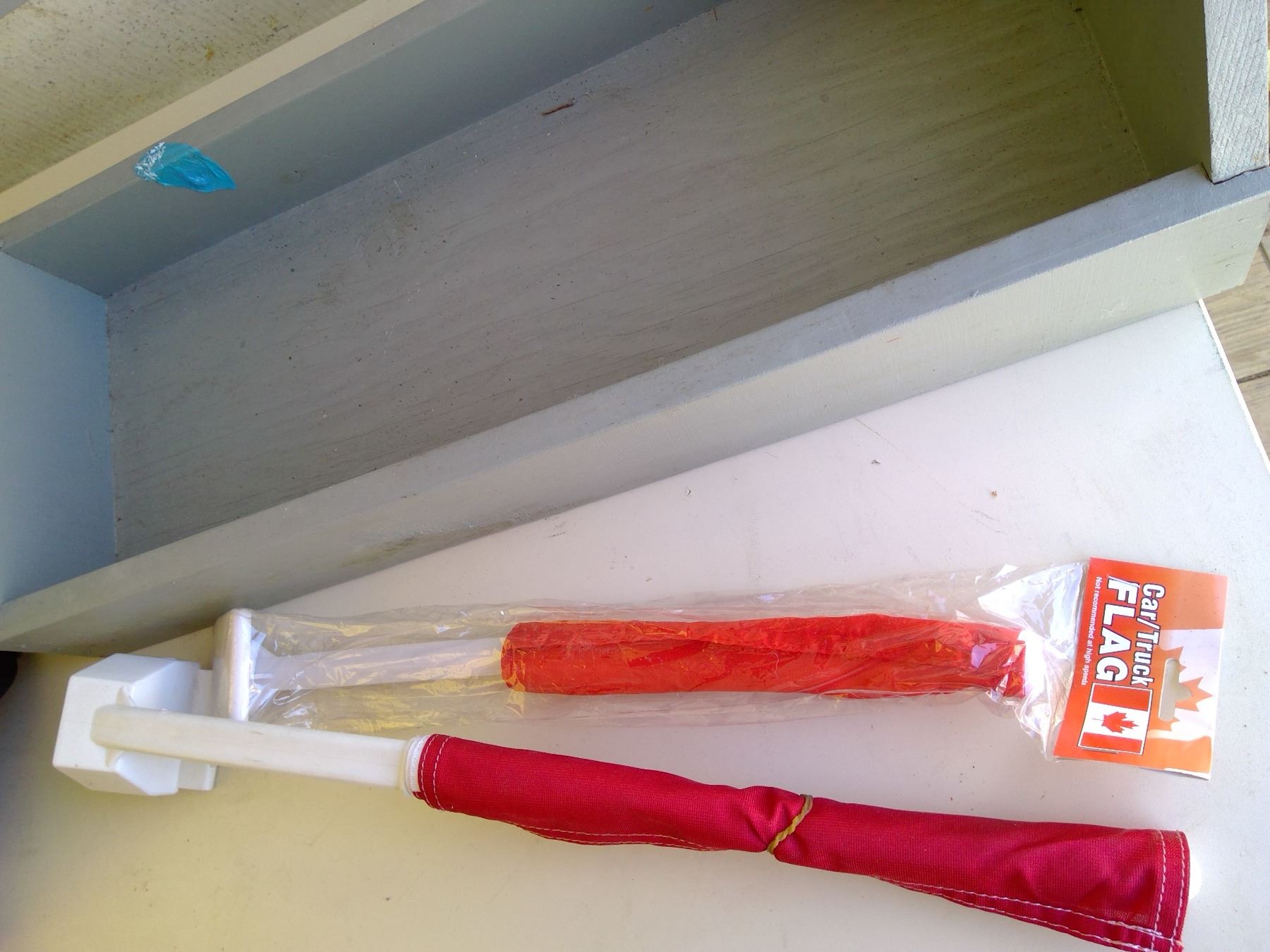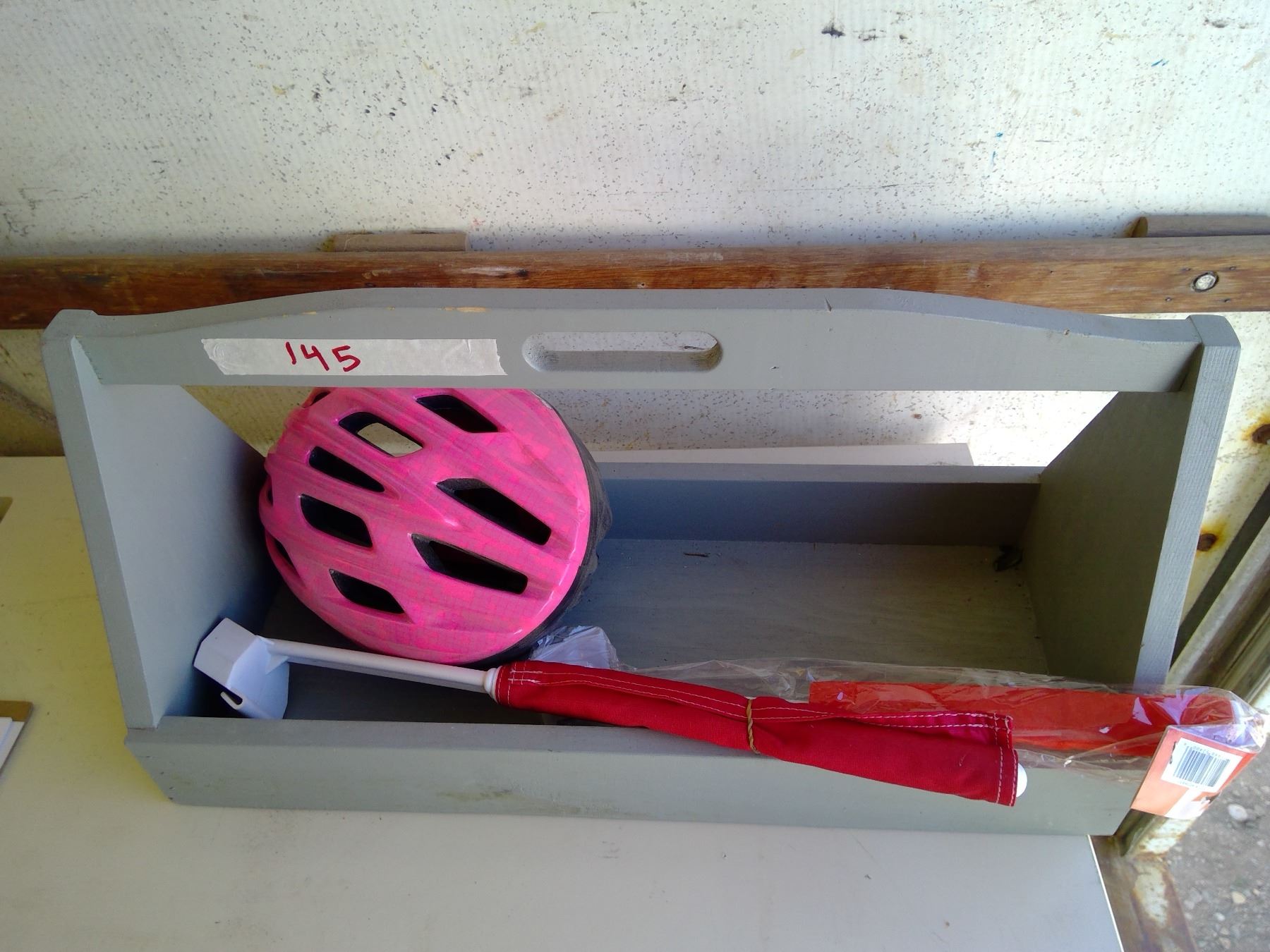 Wooden tote c/w bike helmet and 2 flags