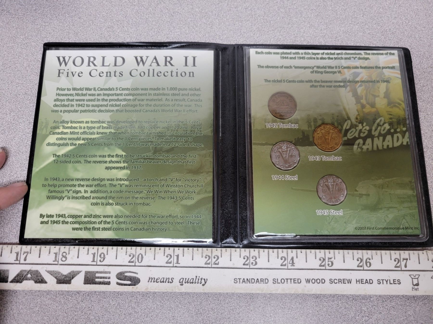 World War II Five Cents Collection. 4 different World War II Five Cents including 1942 Tombac, 1943 Tombac, 1944 Steel & 1945 Steel. Housed in a First Commemorative Mint folder.