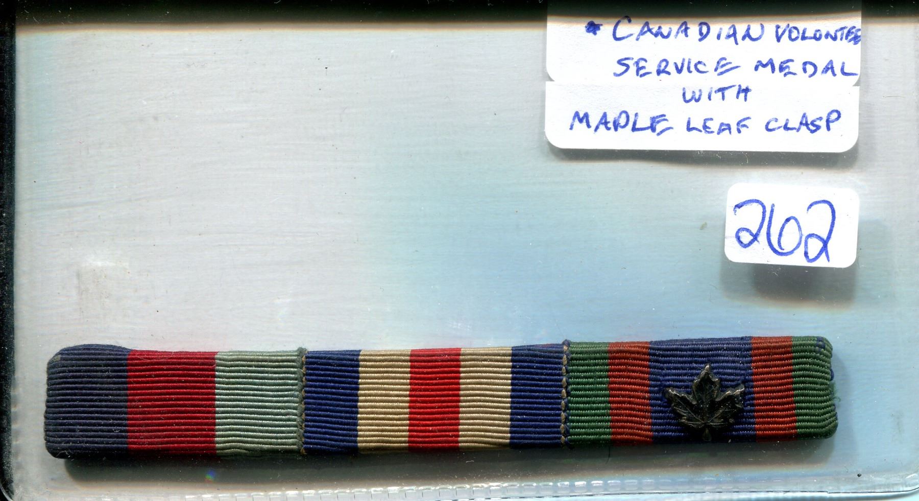 World War II Ribbon Bar. Includes 1939-1945 Star, France & Germany Star and Canadian Volunteer Service Medal with Maple Leaf Clasp for overseas service.