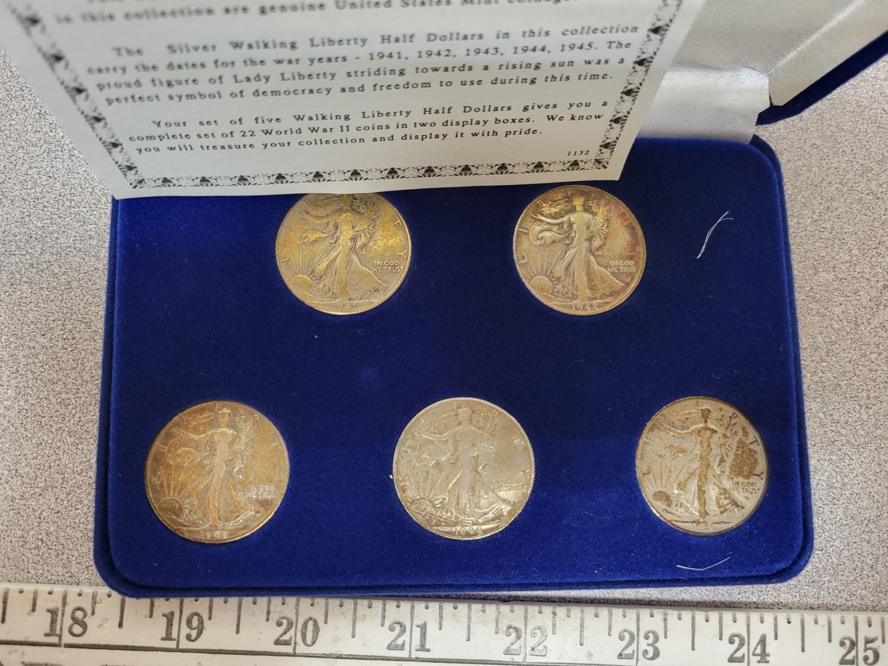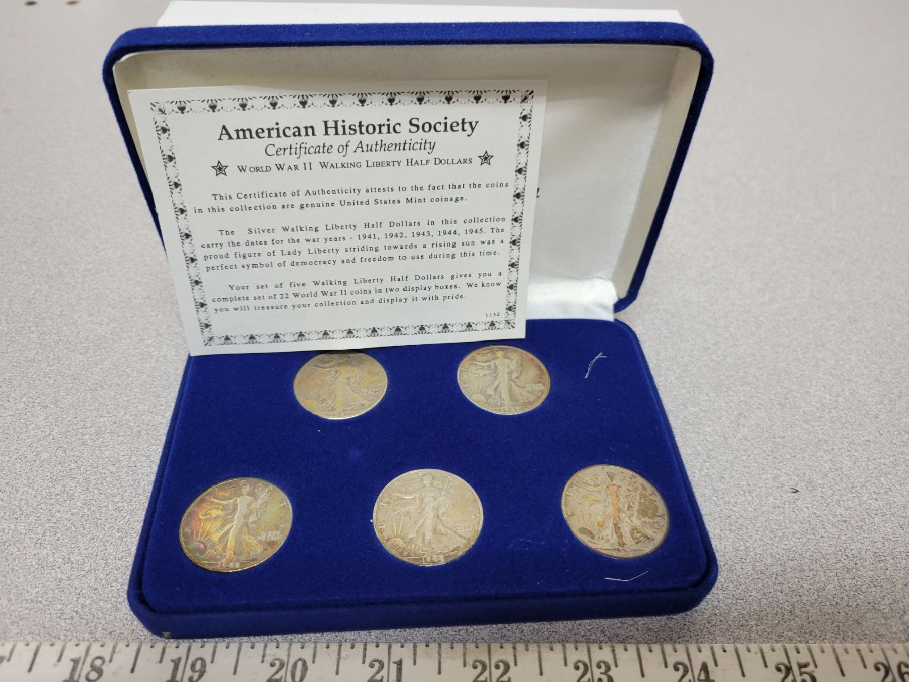 World War II U.S. Coinage Collection. Includes 5 Walking Liberty Silver Half Dollars dated 1941, 1942, 1943, 1944 & 1945. Housed in a case.