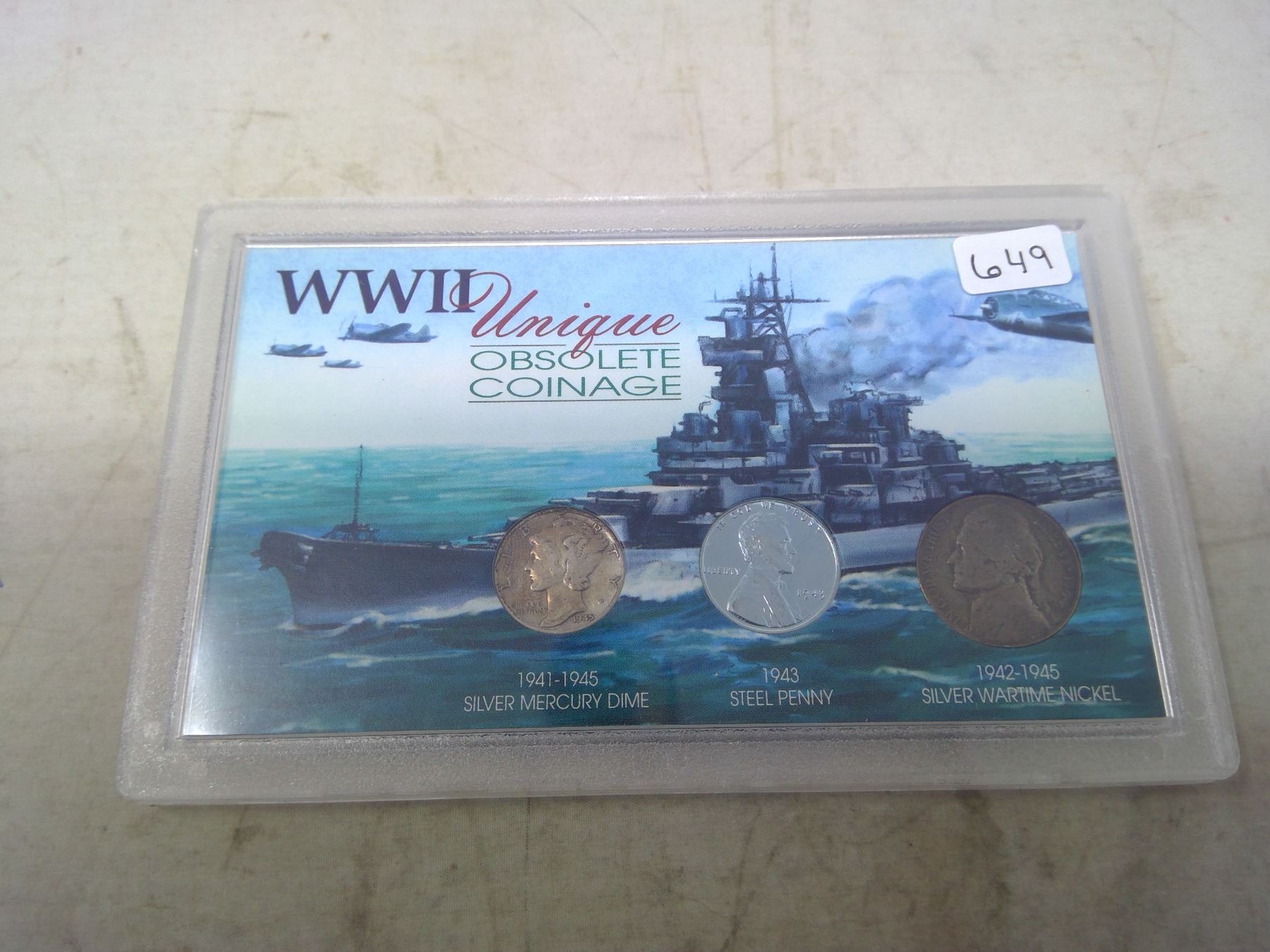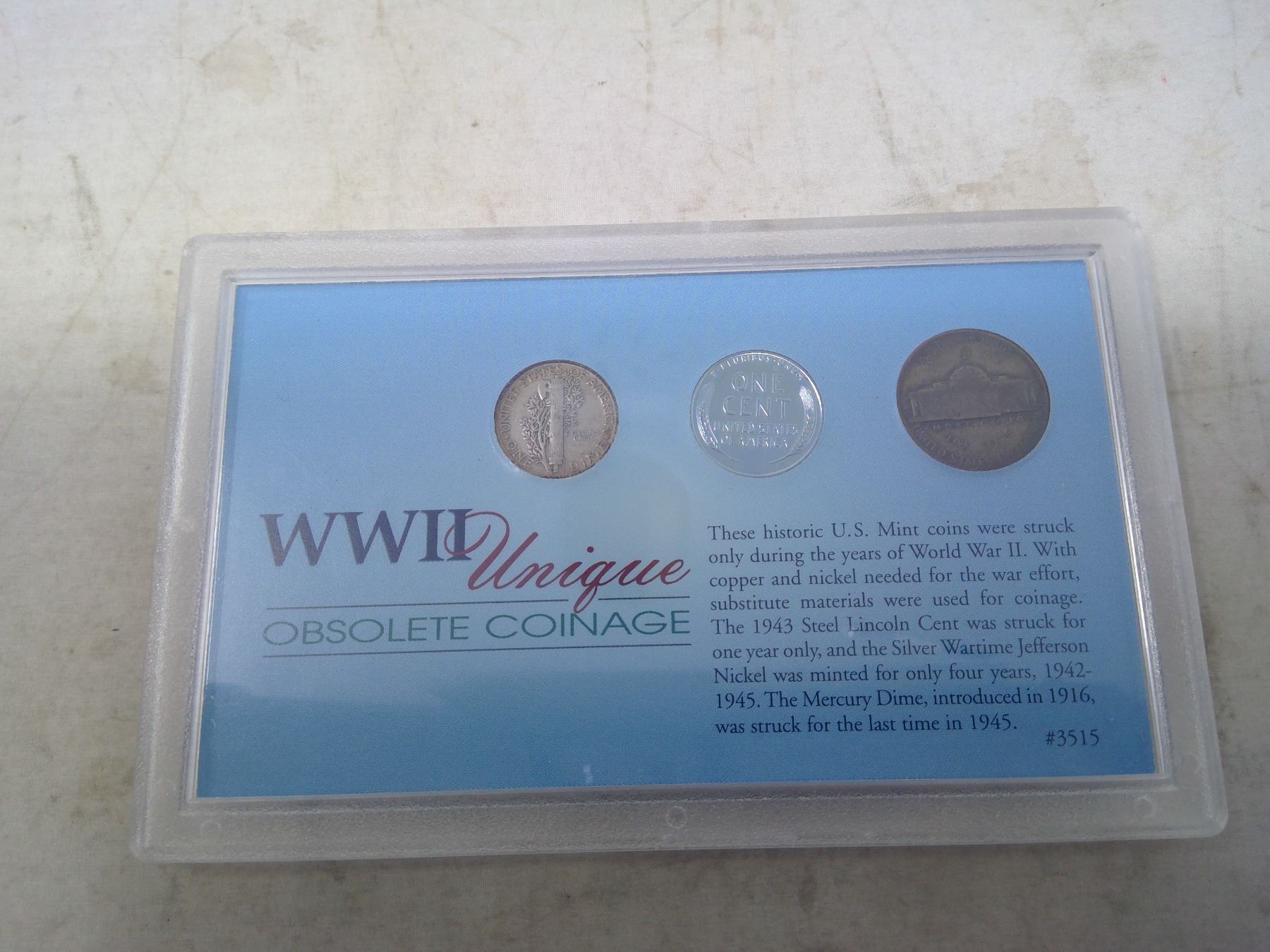 World War II Unique Obsolete Coinage of the U.S. Set of 3 includes Silver Mercury Dime, 1943 Steel Cent and Silver Wartime Jefferson Nickel. Housed in a hard plastic holder.