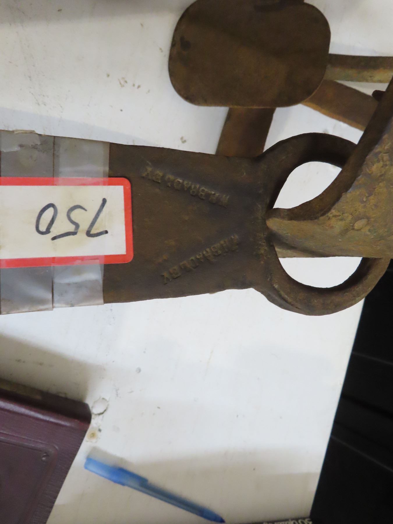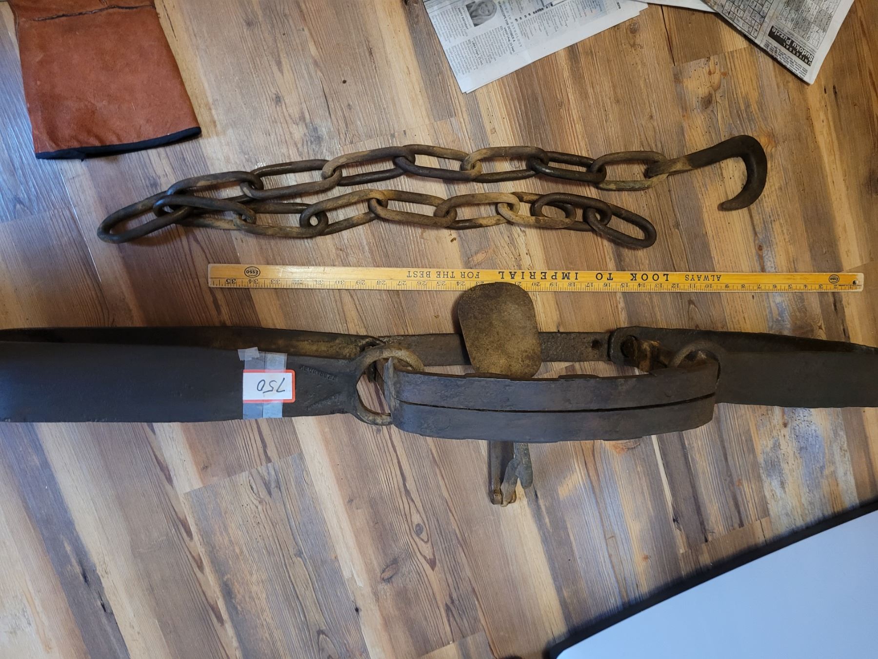 length is 43", jaws sit over 9" off the ground, complete with teeth, chain and hook are also blacksmith forged, very rare find.