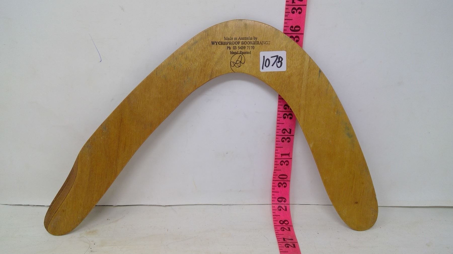 Wycheproof Coachwood hook boomerang made in Australia. Coachwood is the preferred material above all others in Aussie boomerang making. Google 'Wychproof boomerangs Australia' for more information. Width: 13 1/2". Thickness: 3/8". Range: 40m. For a right-handed person.