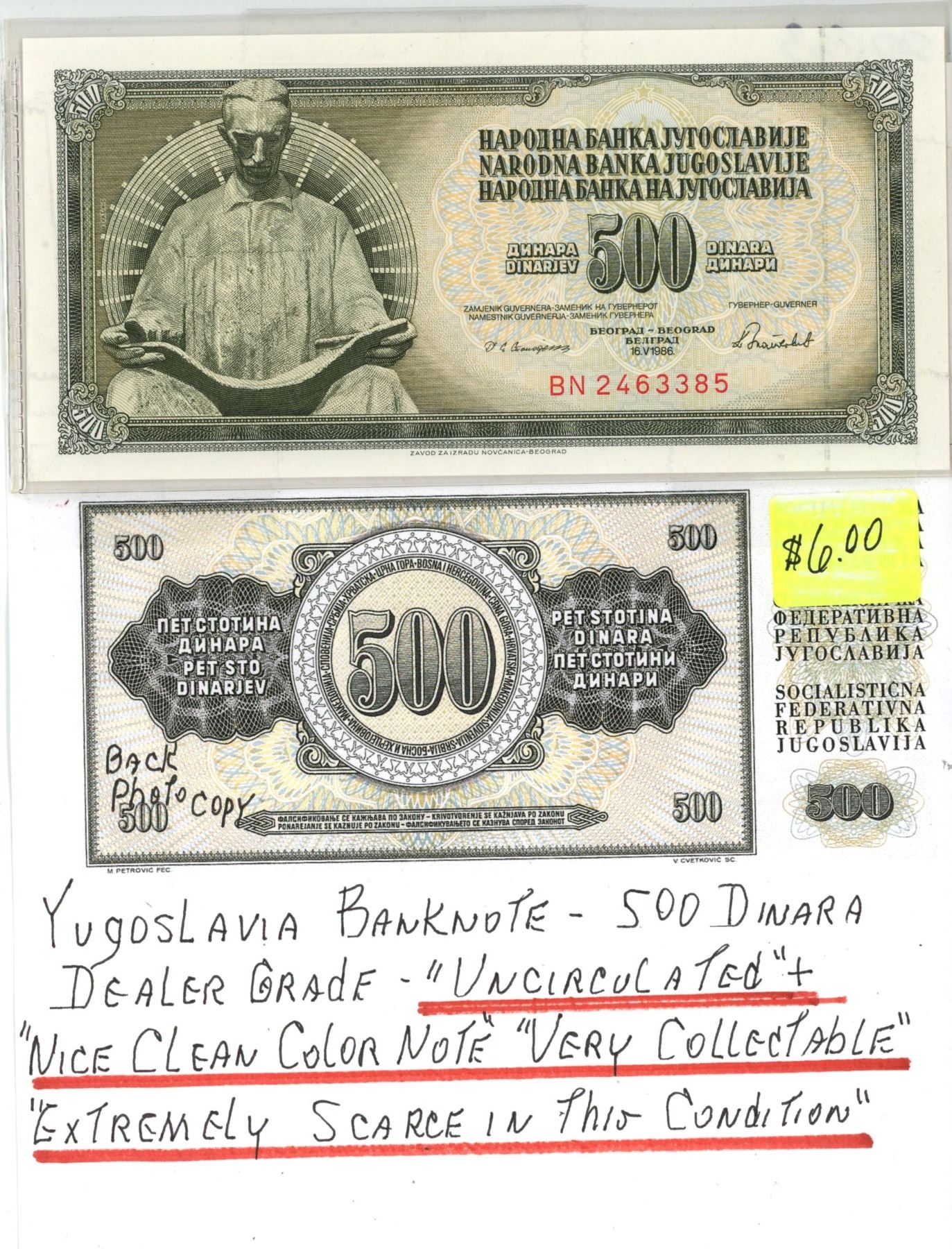 Yugoslavia Banknote -500 Dinara (Uncirculated)