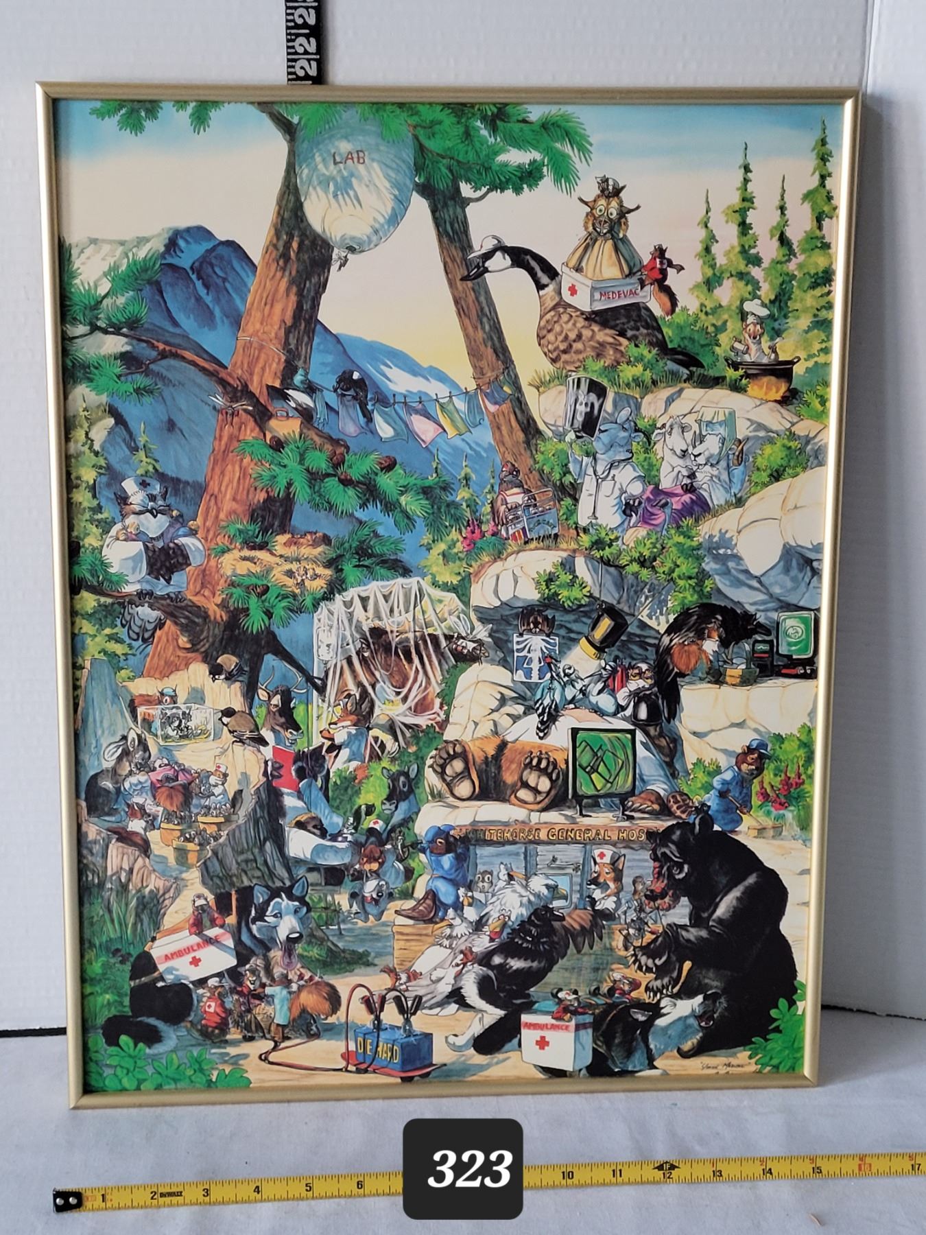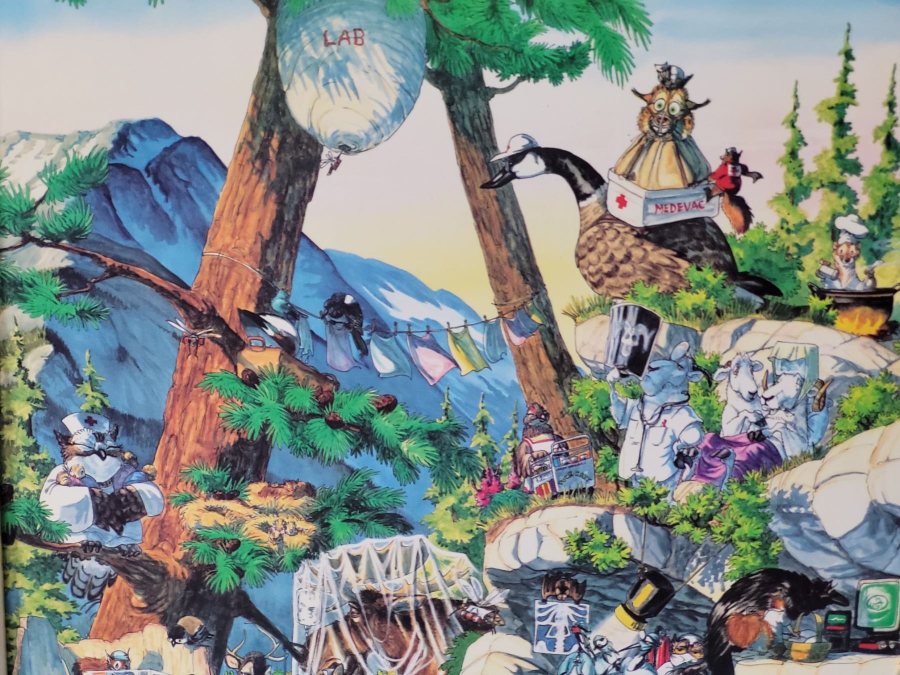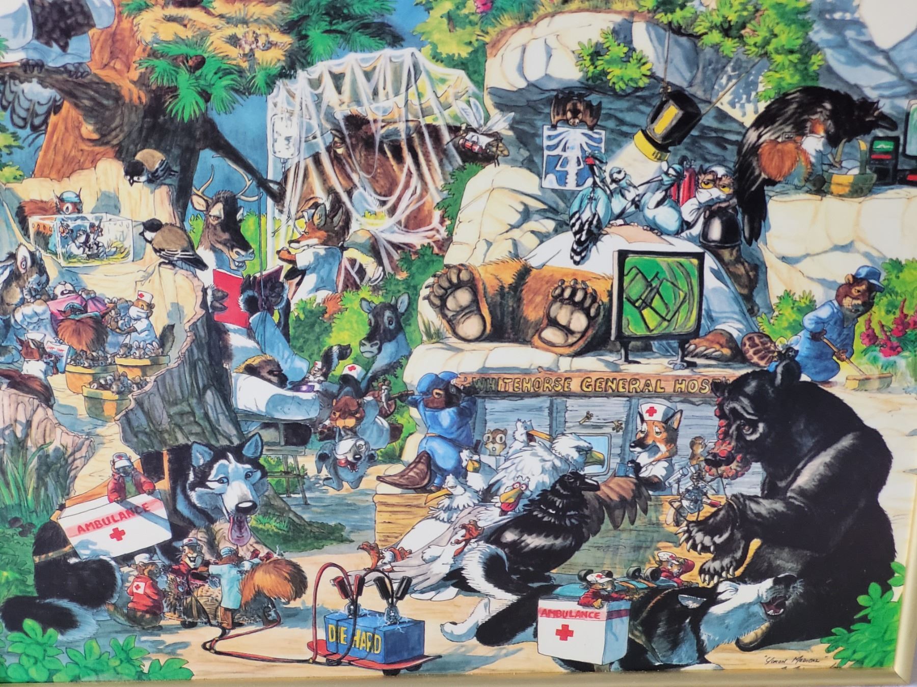 “Yukon Medical” Slapstick humorous art by Chris Caldwell. Depicts funny absurd medical scenes in Yukon setting.