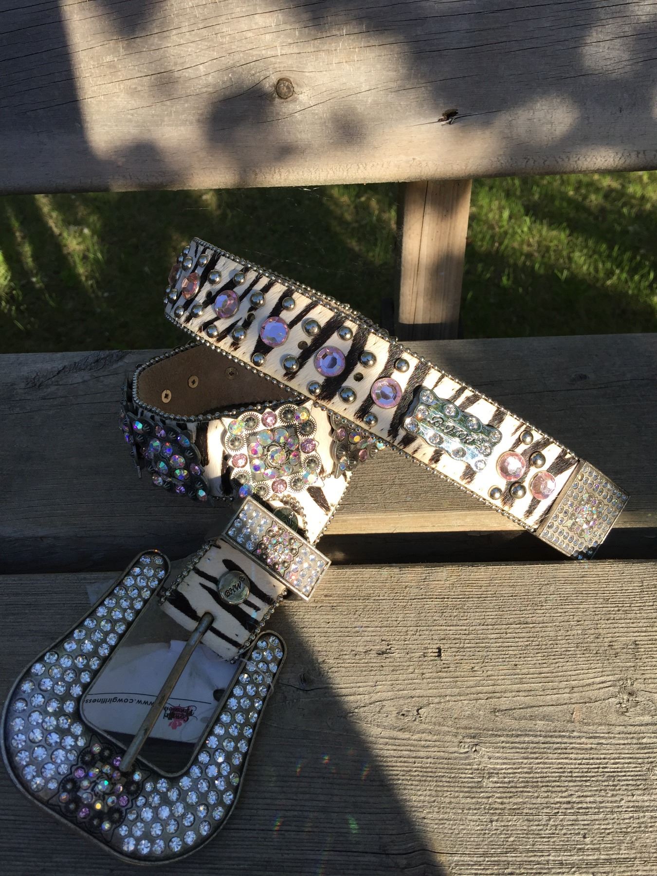 ZEBRA PRINT LEATHER BELT/ PINK CRYSTAL SQUARE CONCHOSSIZE SMALL