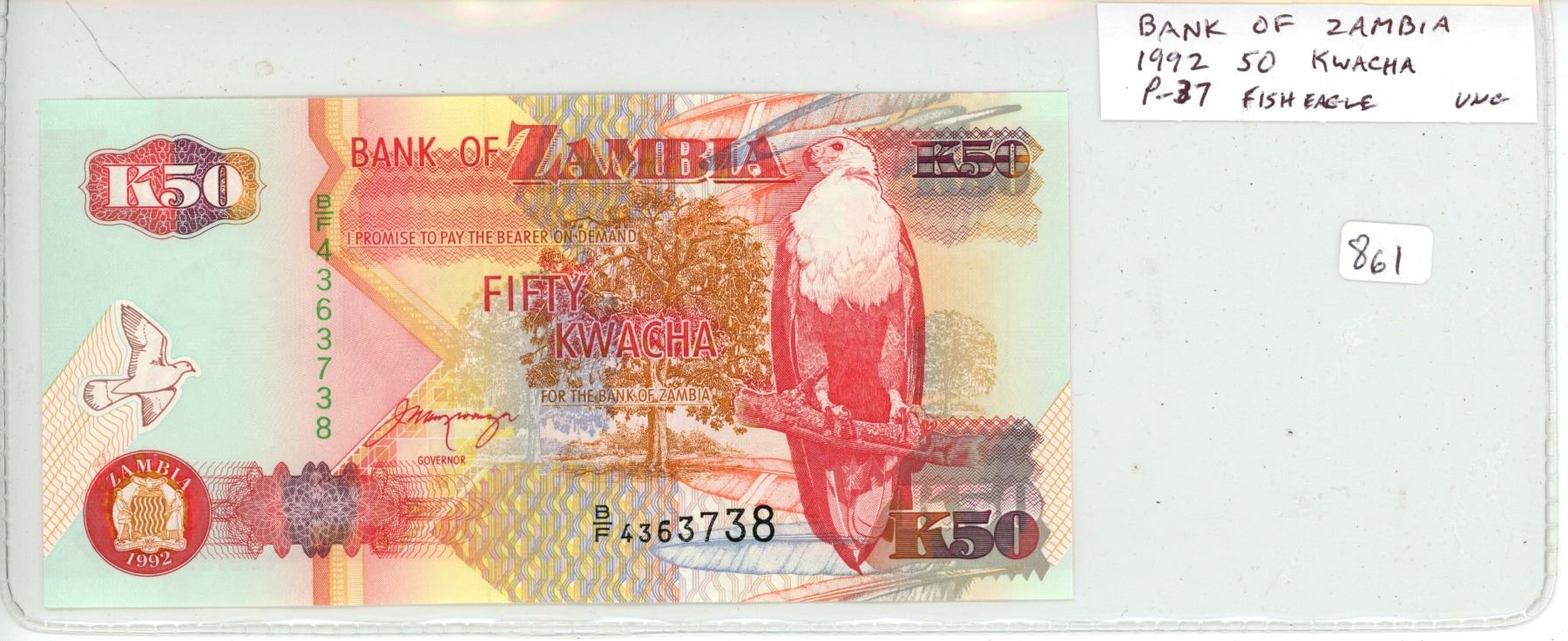 Zambia. Bank of Zambia. 1992 50 Kwacha. African Fish Eagle. P-37. Unc.