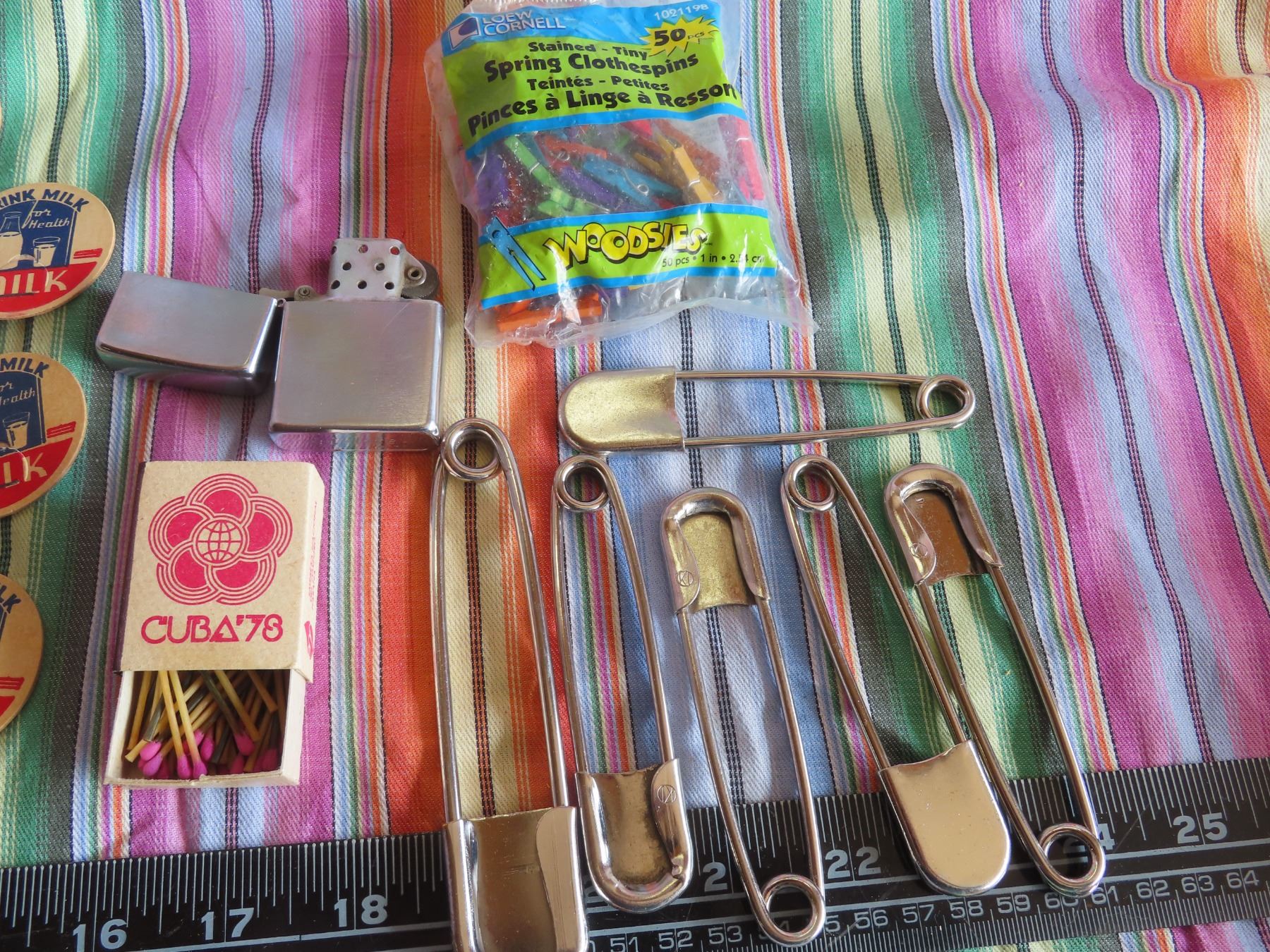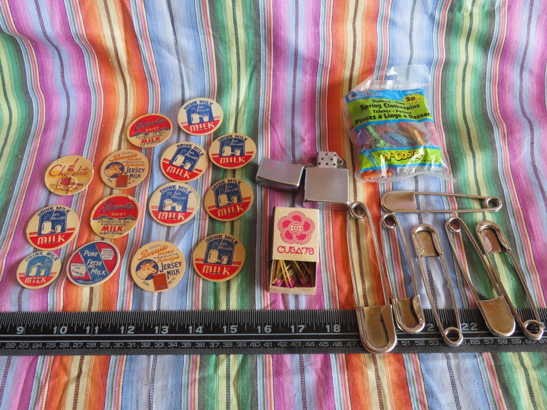 antique milk caps, safety pins, Cuba,match sticks, zippo lighter