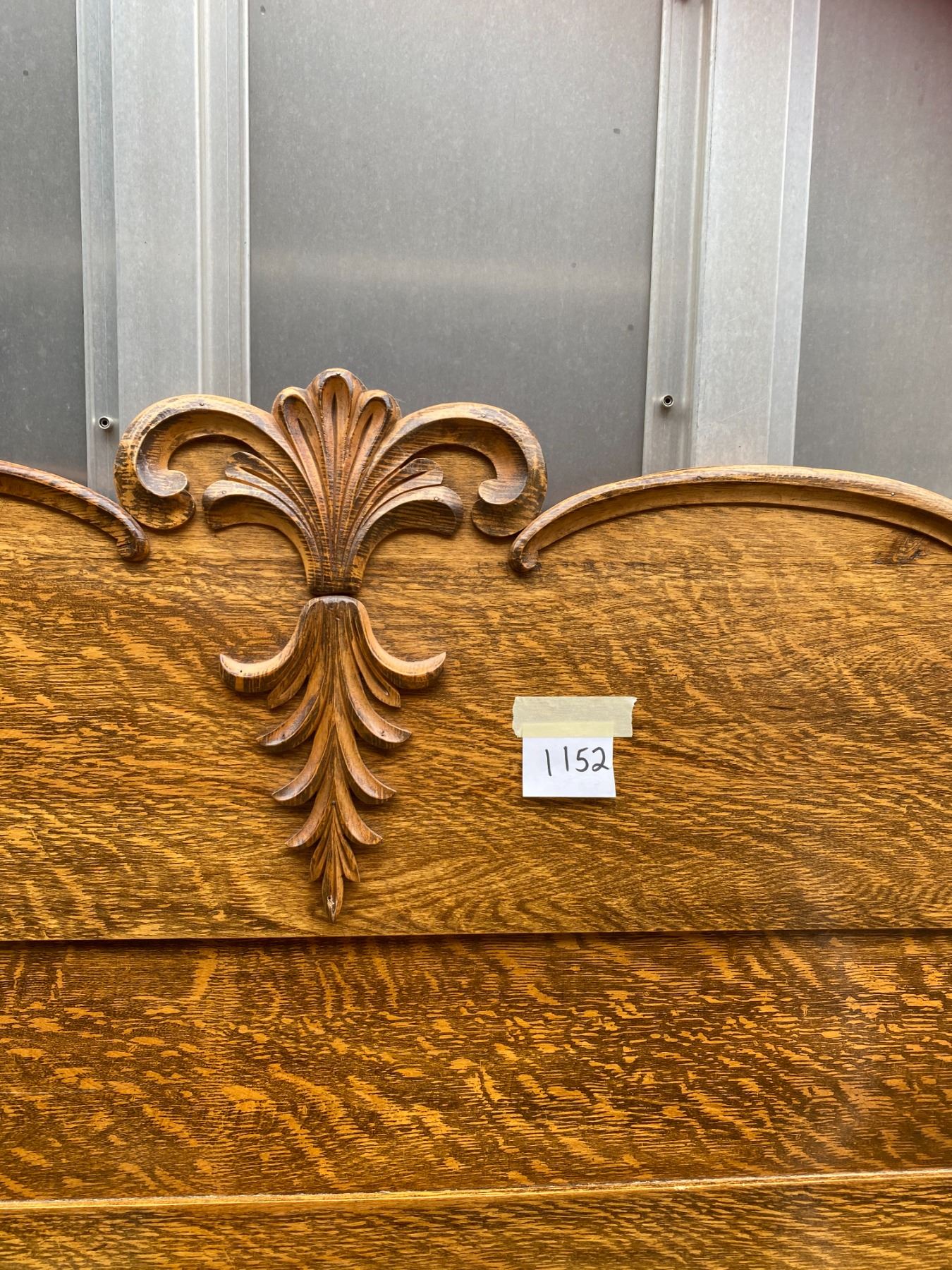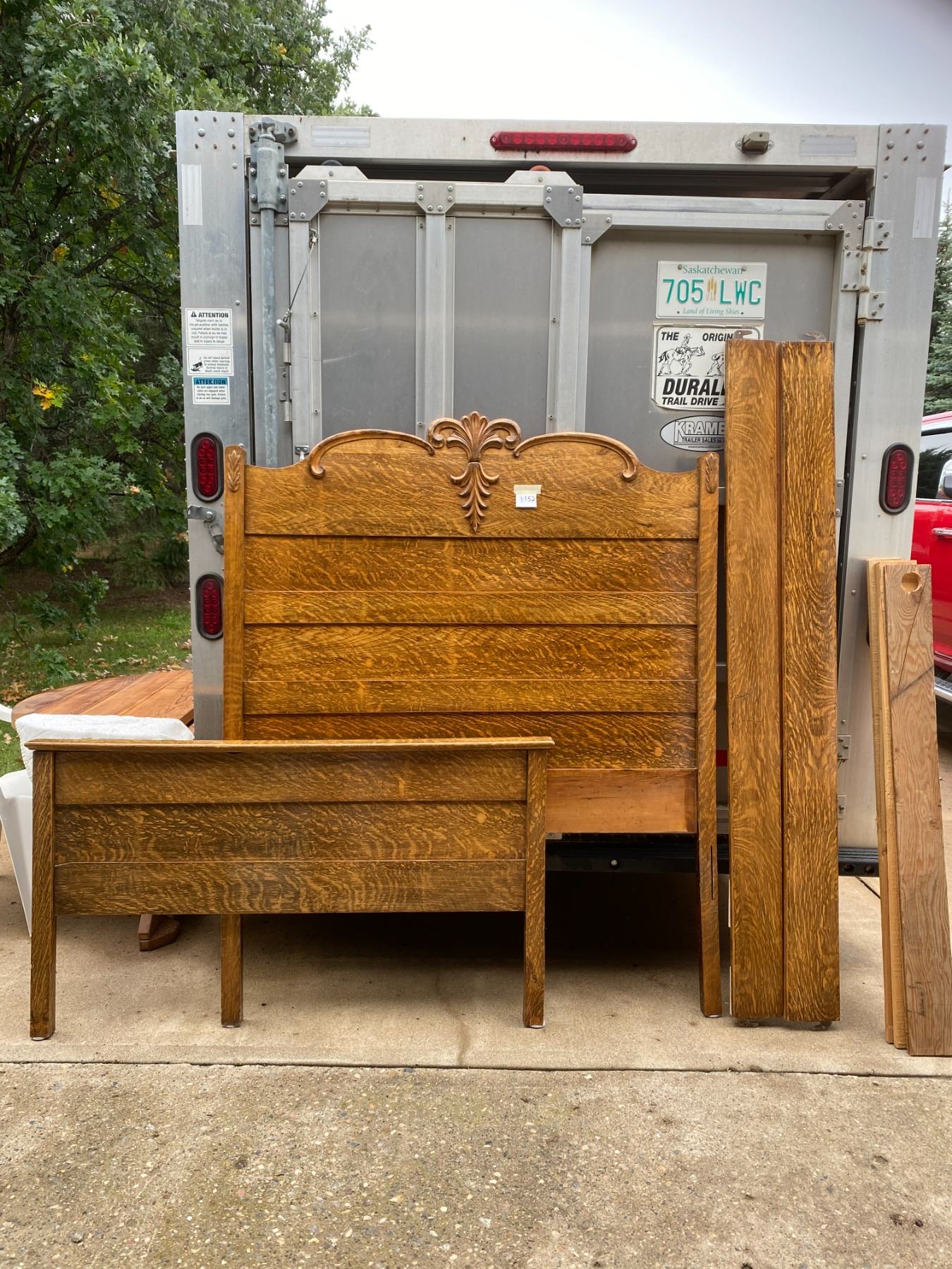 antique solid oak bed 52" headboard, 65"tall, complete with side rails & mattress boards, great condition