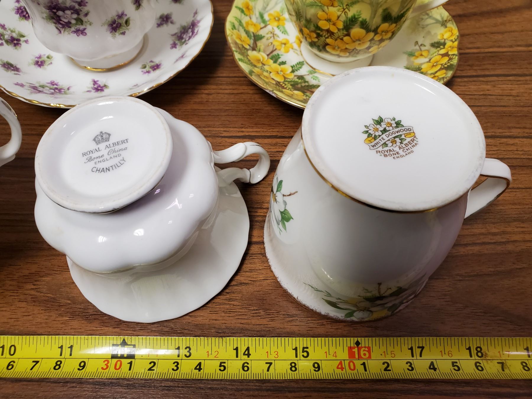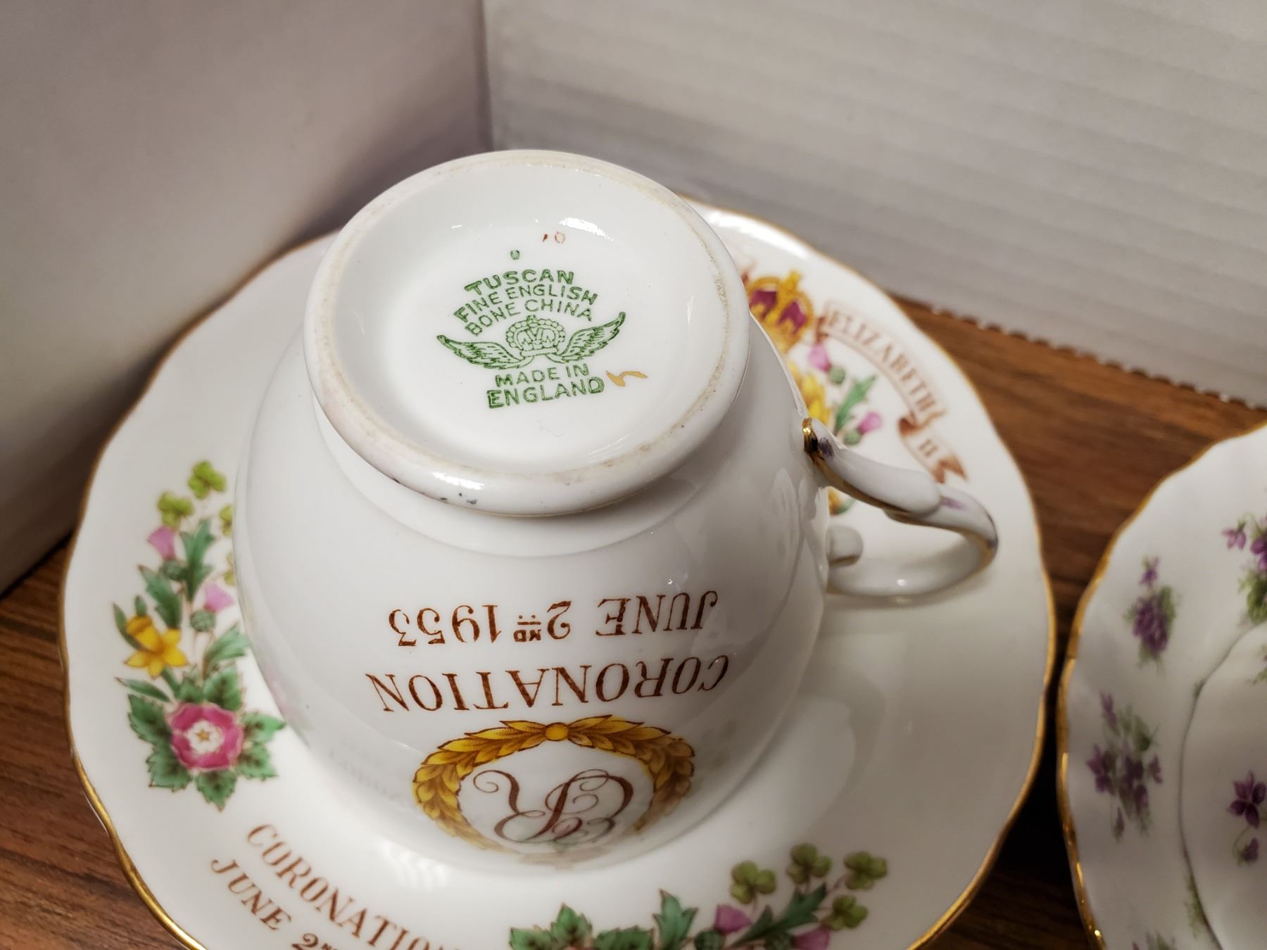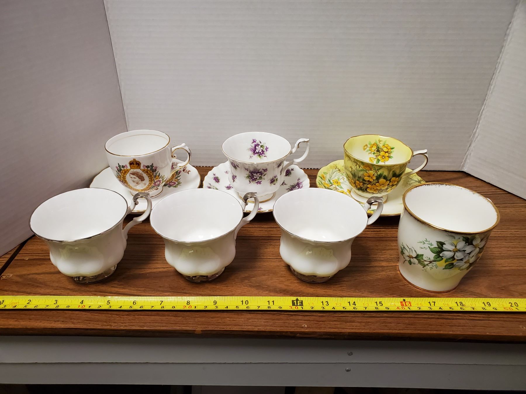 Sweet Violets cup & saucer, Partidge Pea cup & saucer, 3 Chantilly cups, Queen Elizabeth II coronation cup & saucer, White Dogwood cup