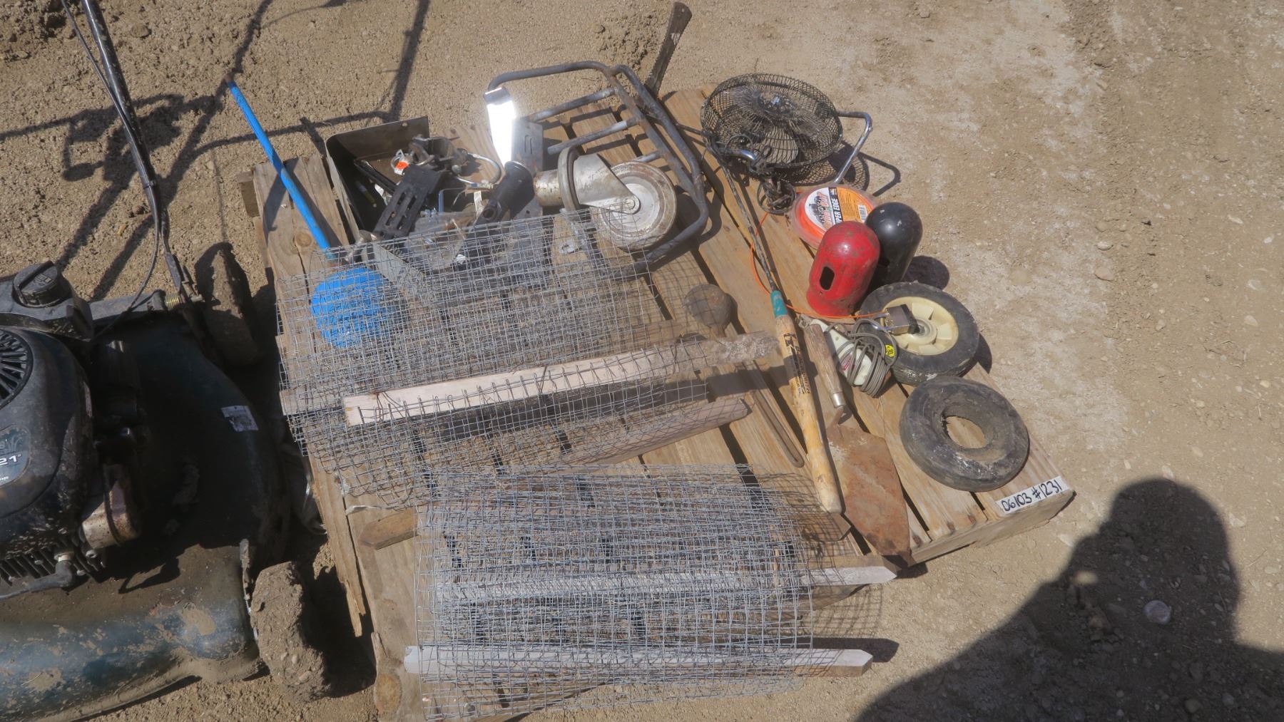 assorted pallet - wire fence, acetylene tank caps, large caster, tools, etc.