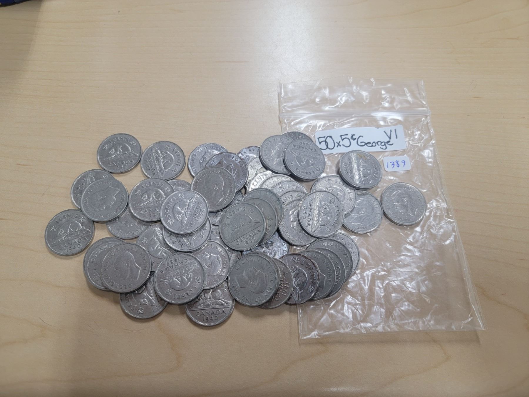 bag of 50 King George VI Canadian five cent pieces