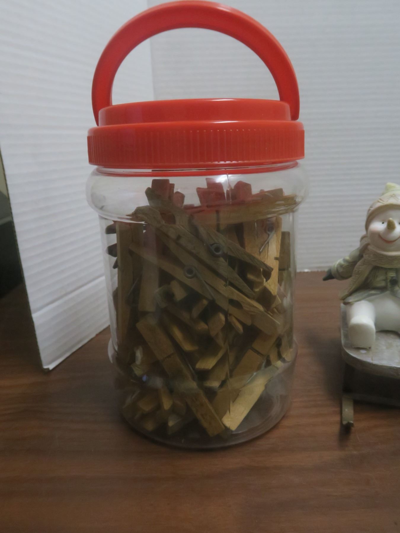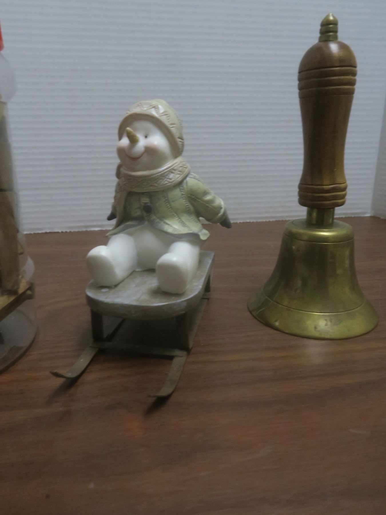 bell, snowman on sleigh and old clothes pins