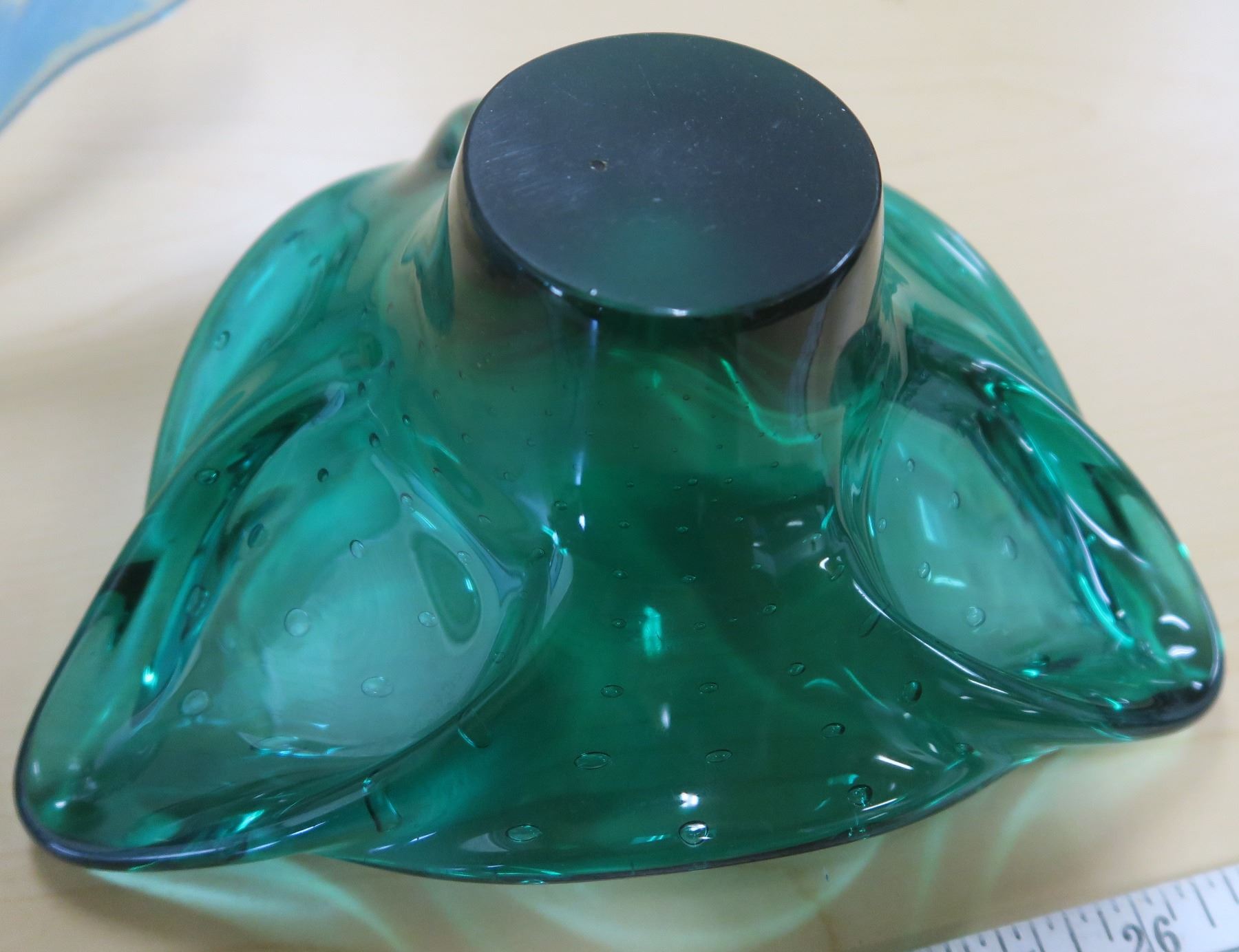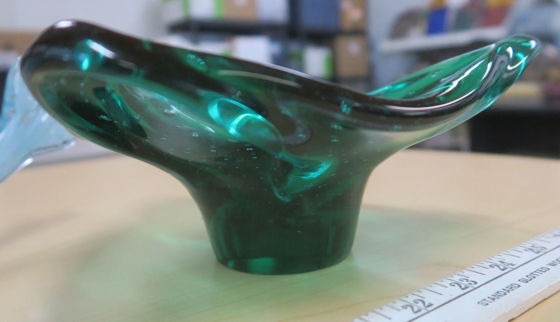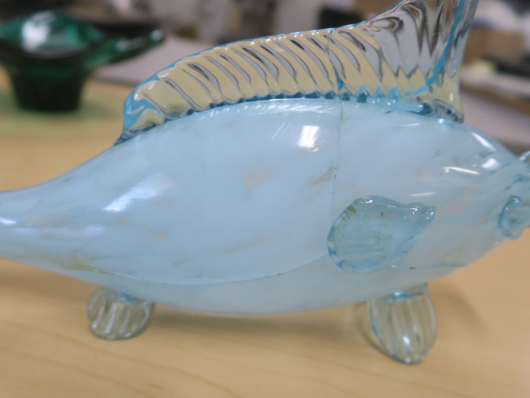 blue blown glass fish (cracked, see pics) and green glass decorative bowl