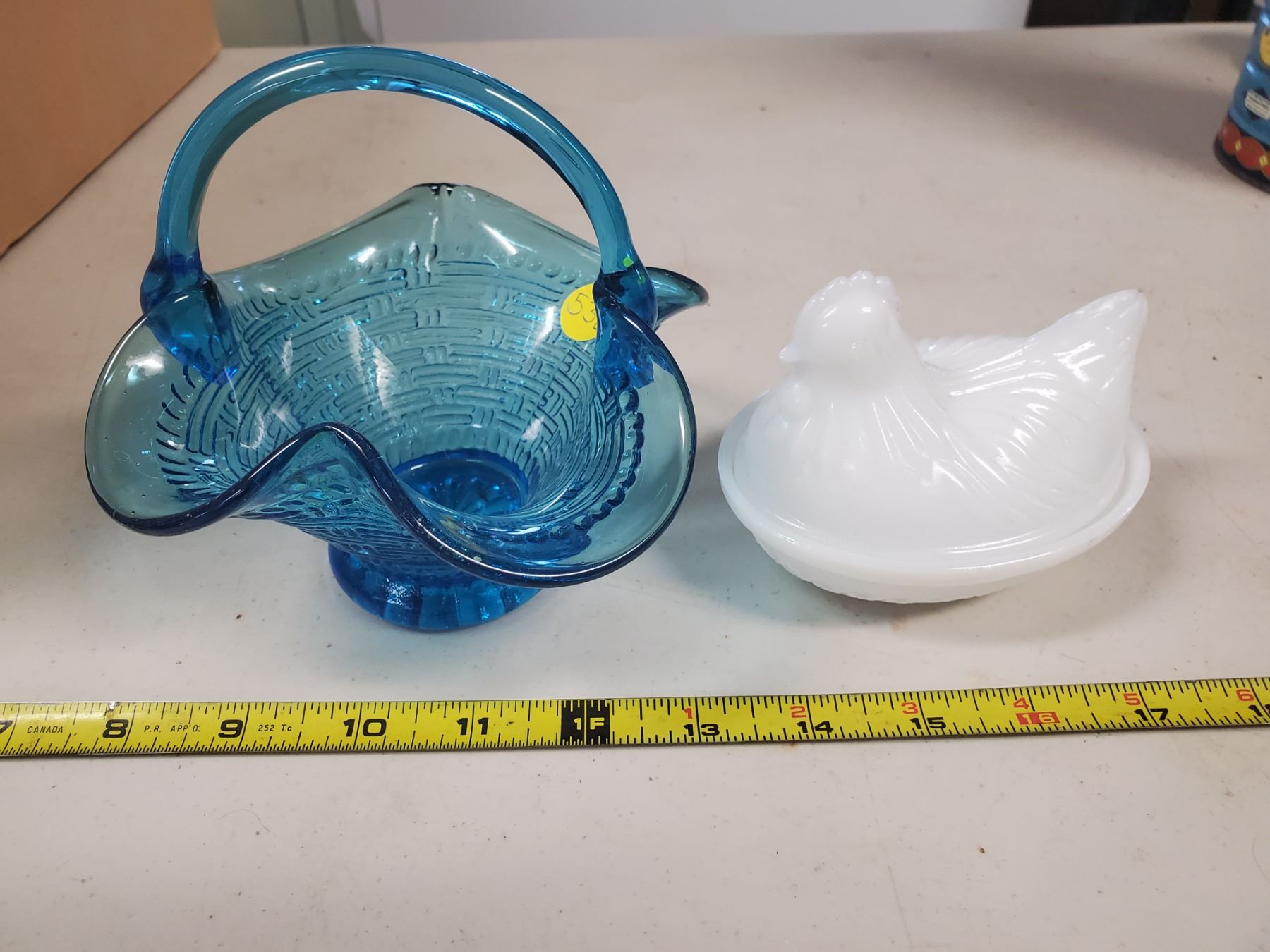 blue glass basket candy dish & milk glass hen on a nest