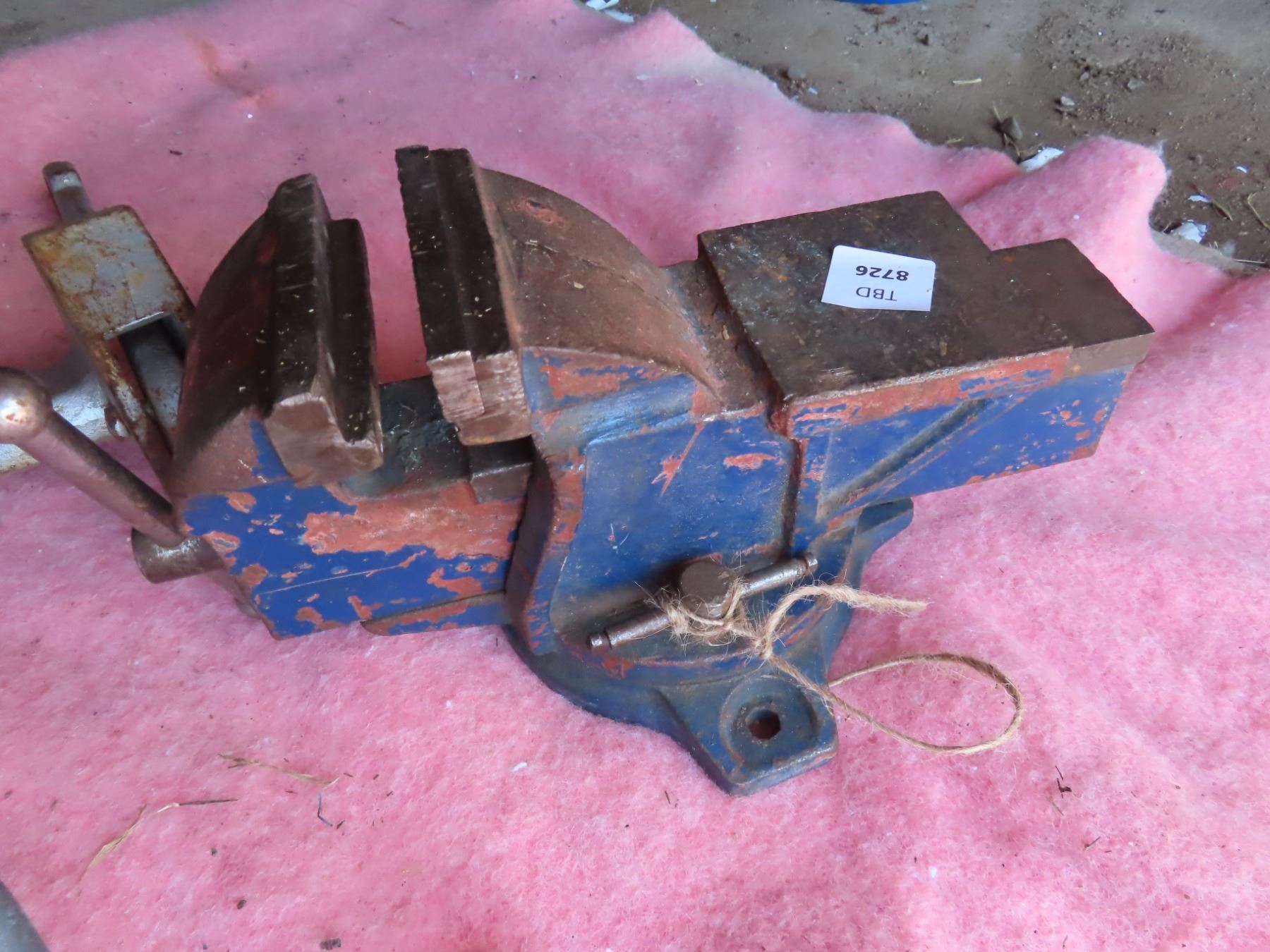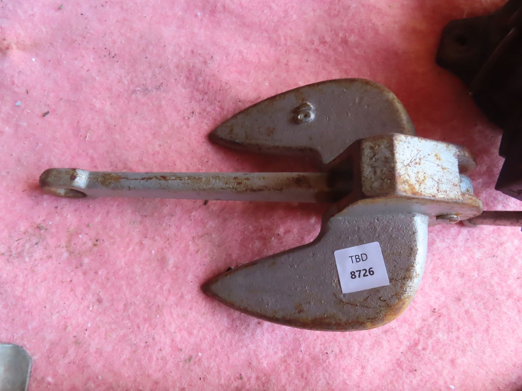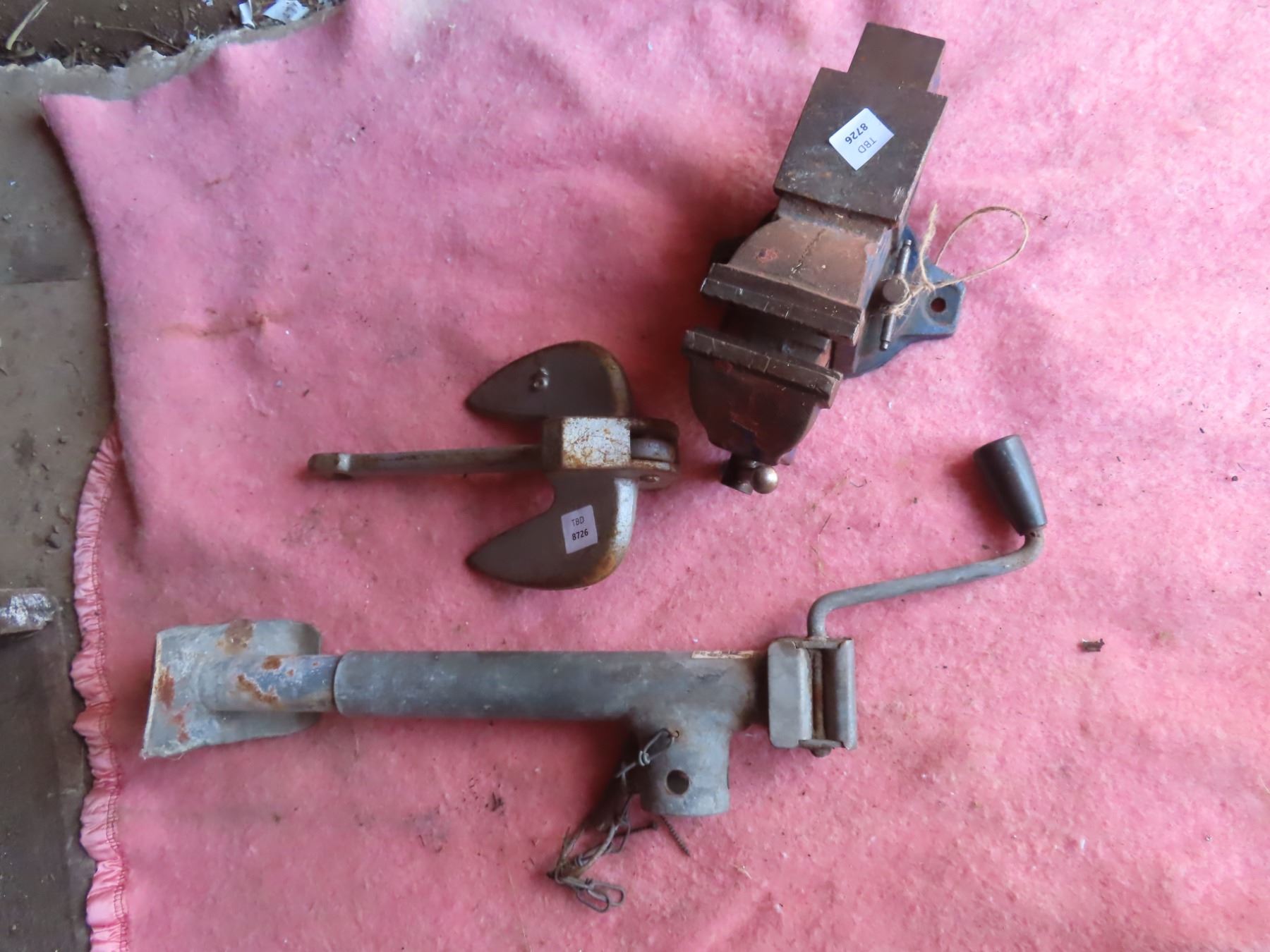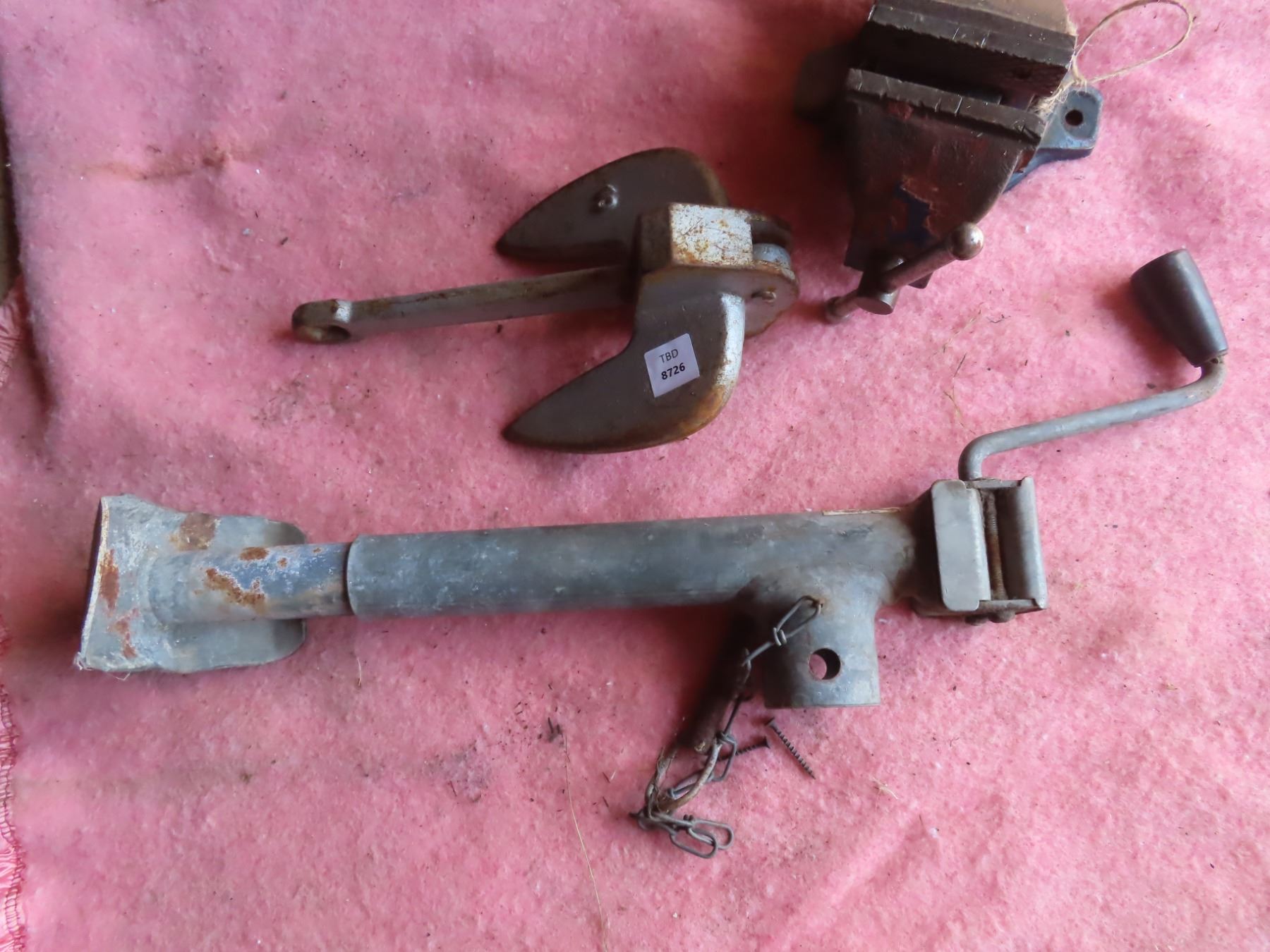 boat anchor, bench vise, and trailer jack
