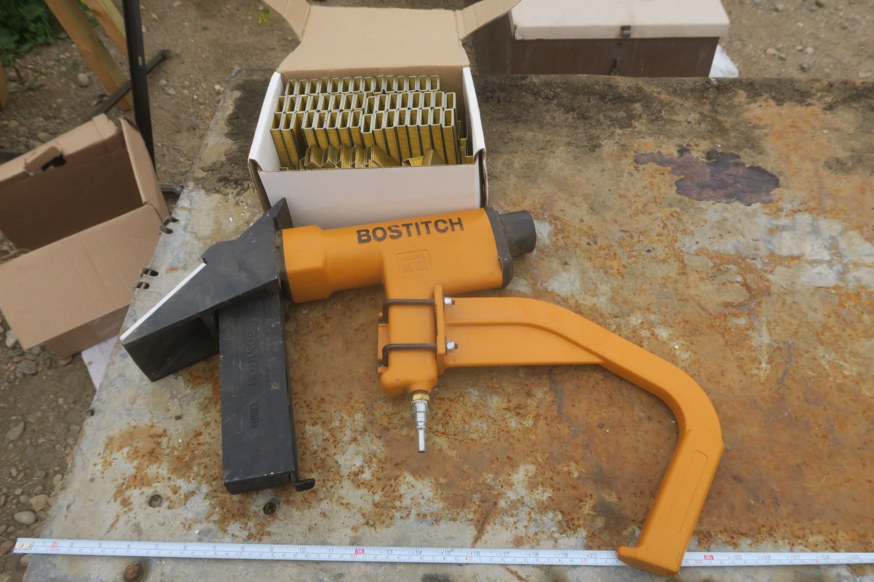 bostitch MIII roofing stapler and box of staples