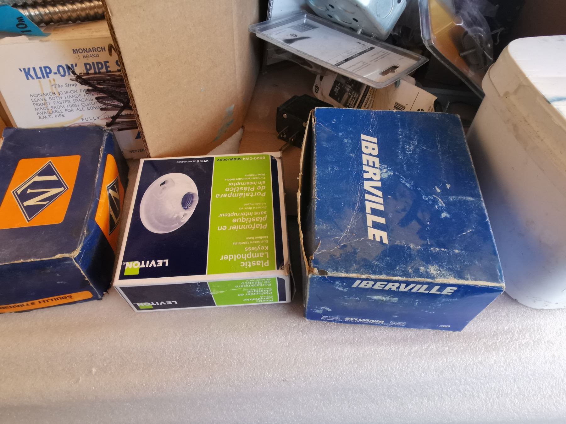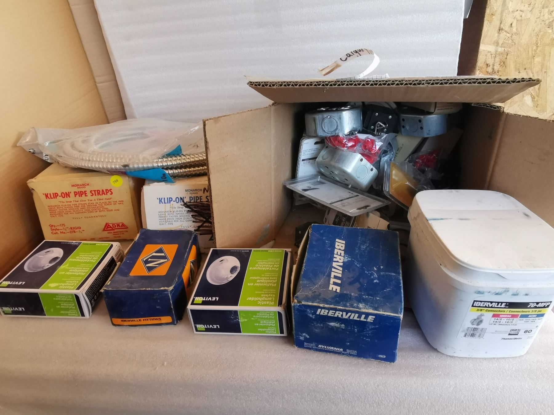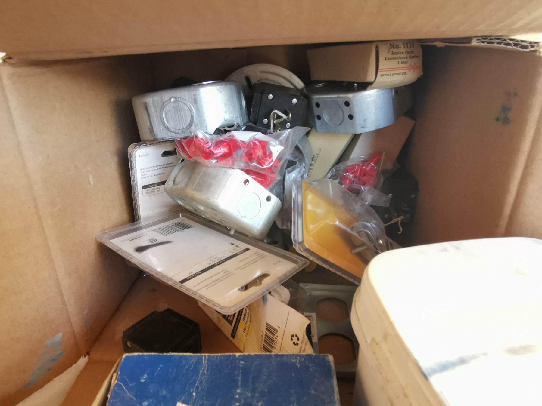box full of electrical repair parts - clips, boxes, cables and more