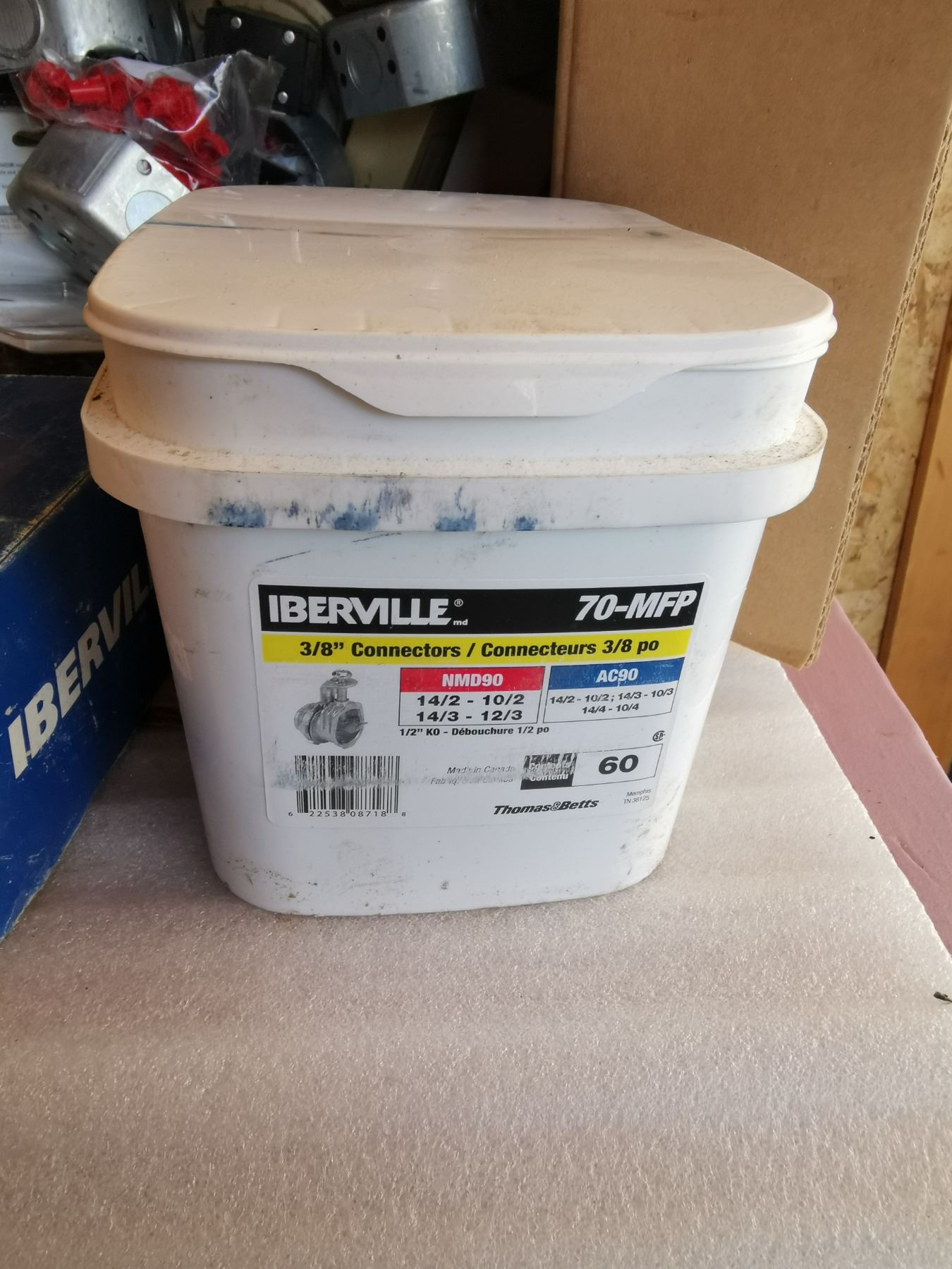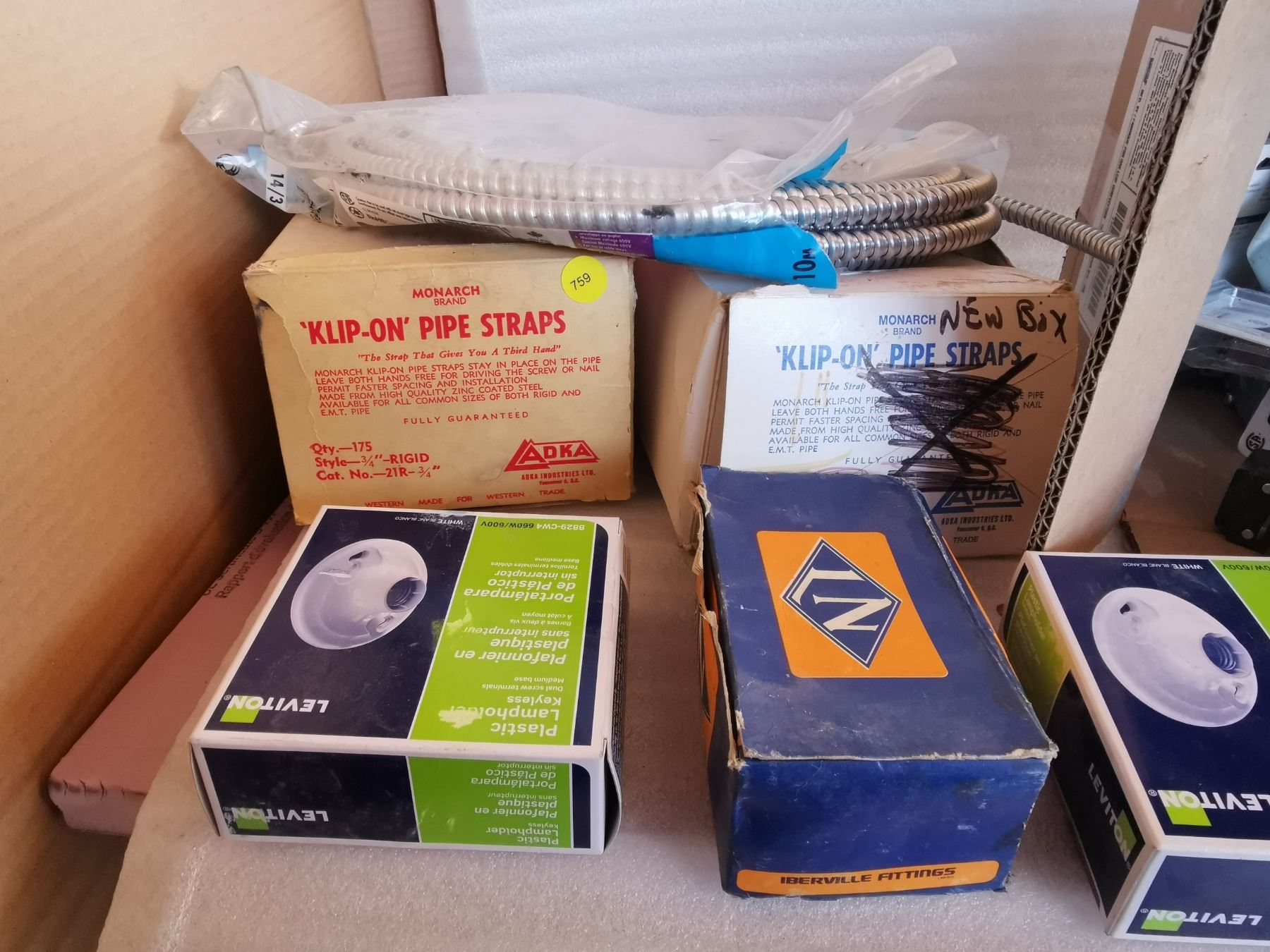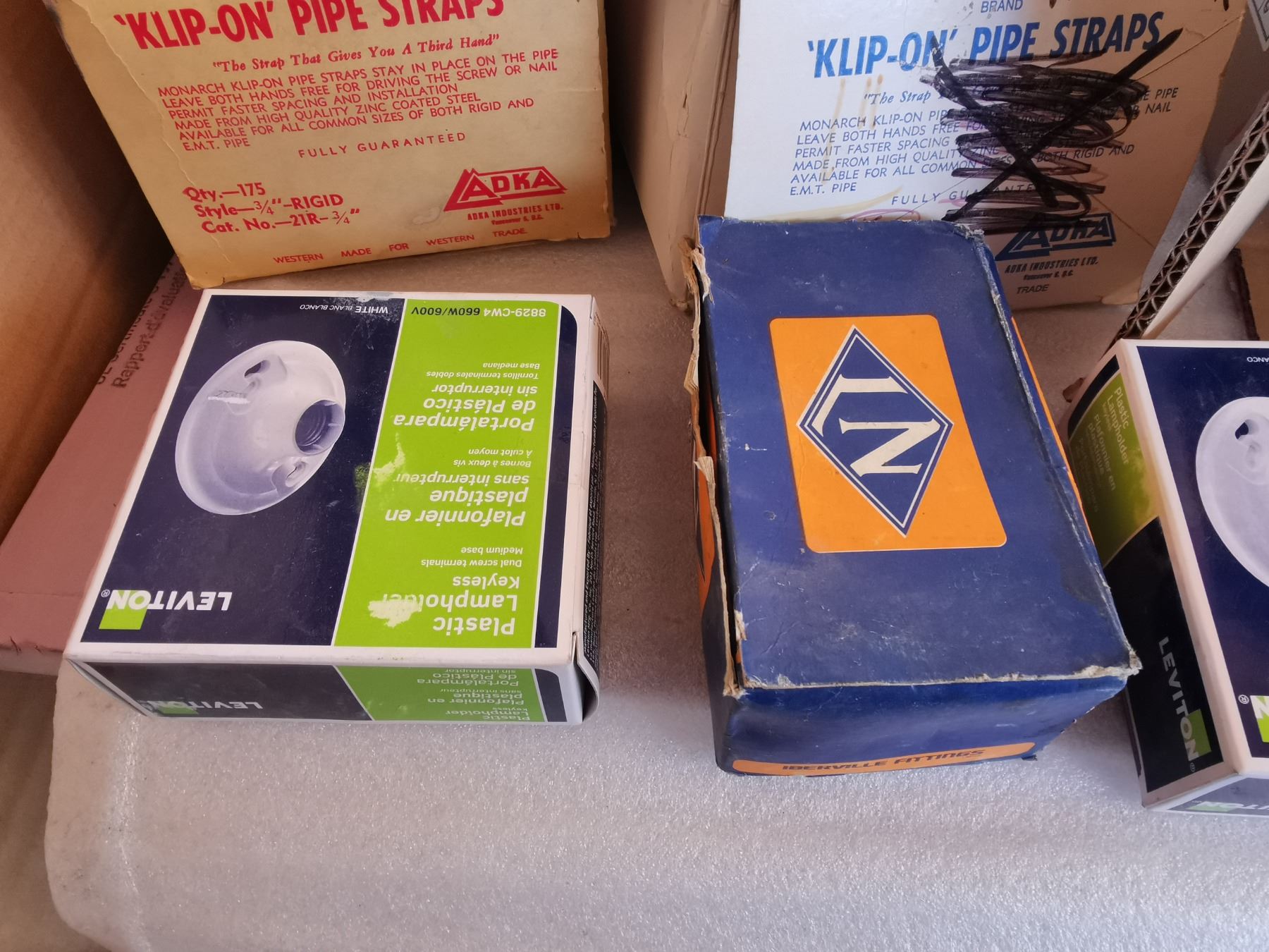 box full of electrical repair parts - clips, boxes, cables and more