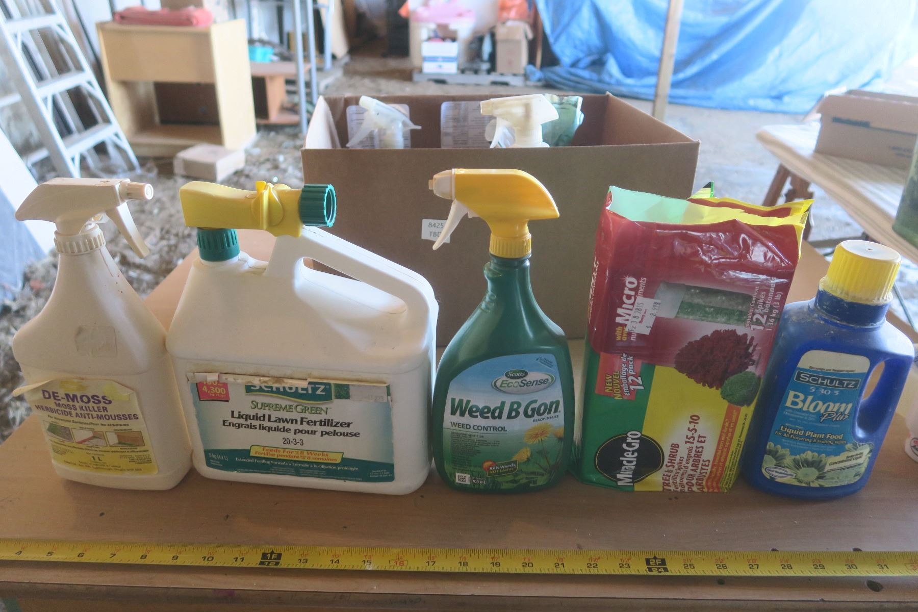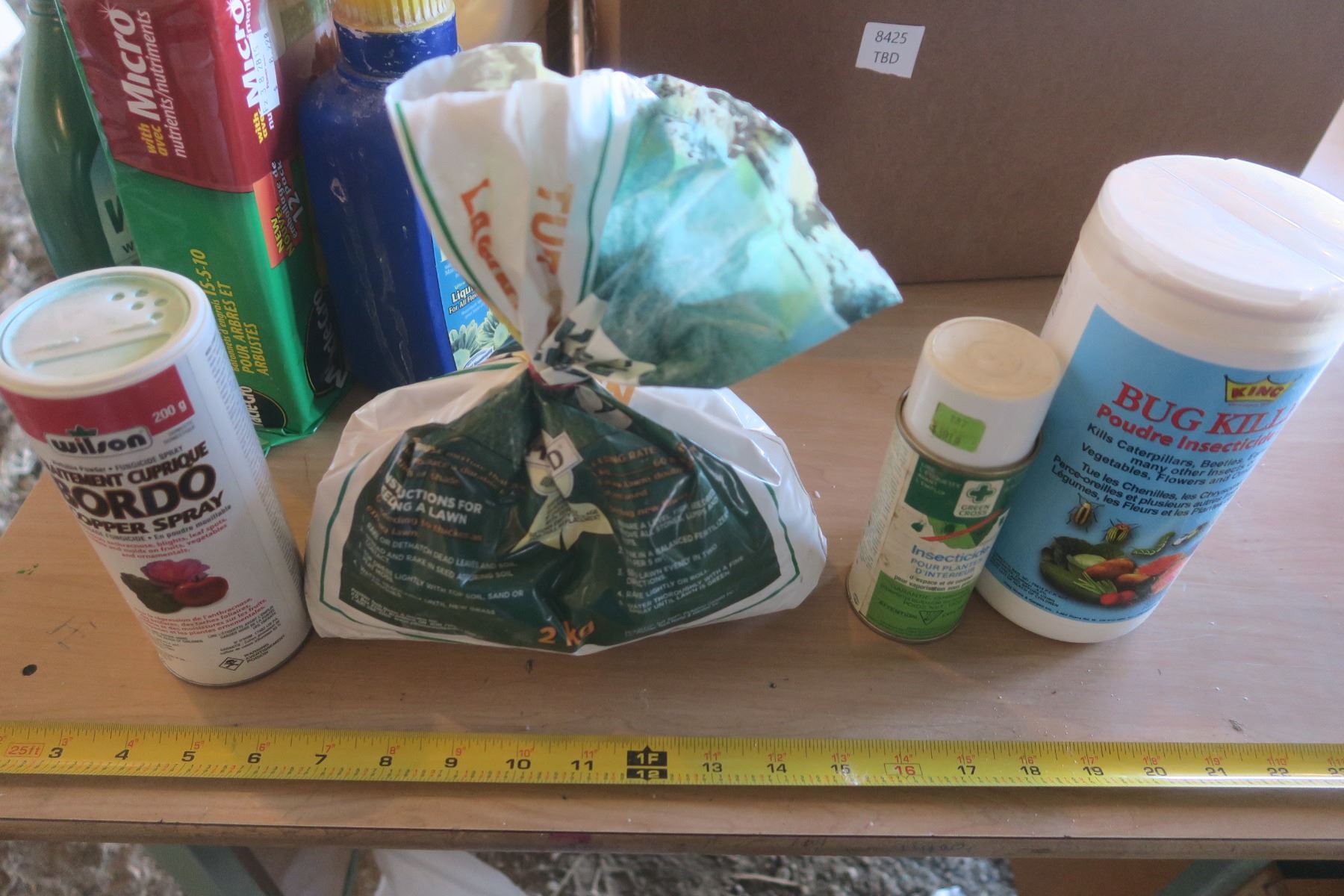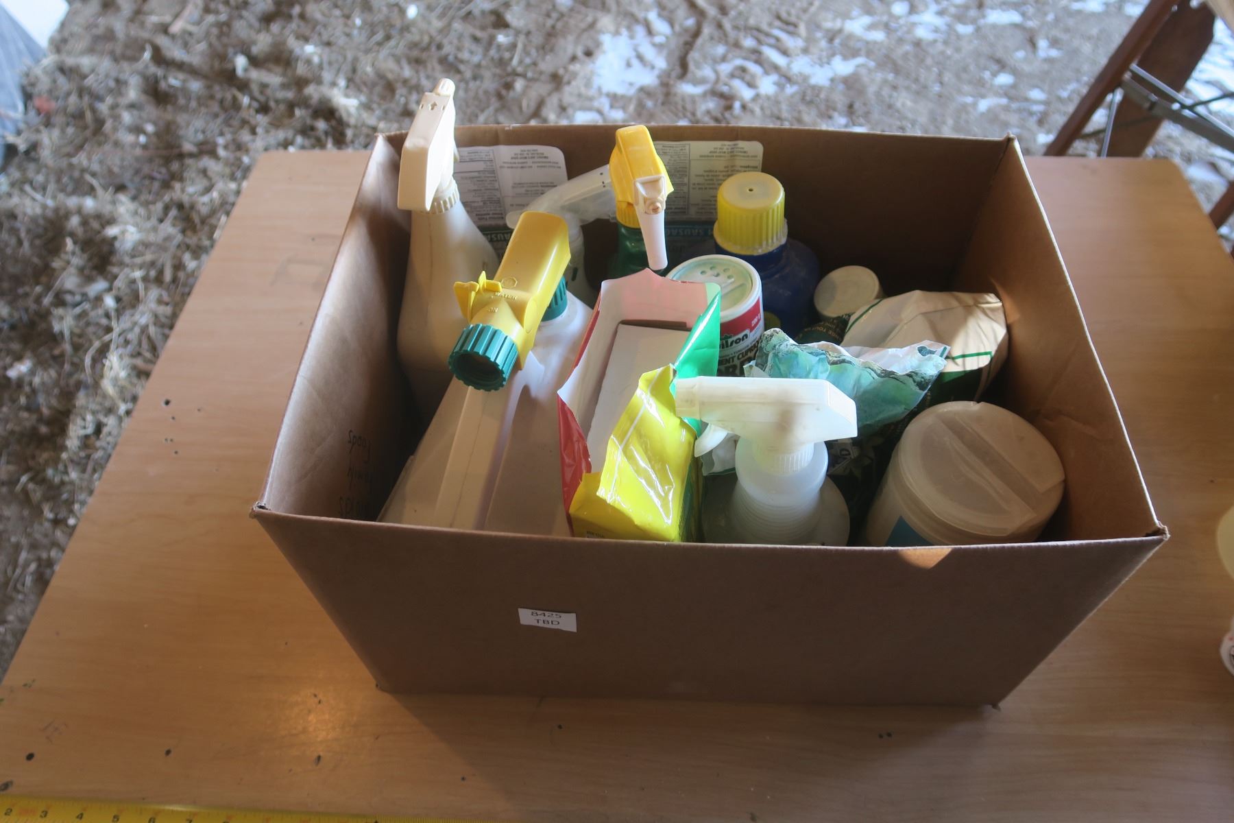 box of insecticides, grass seed, fertilizer, fungicide, etc.