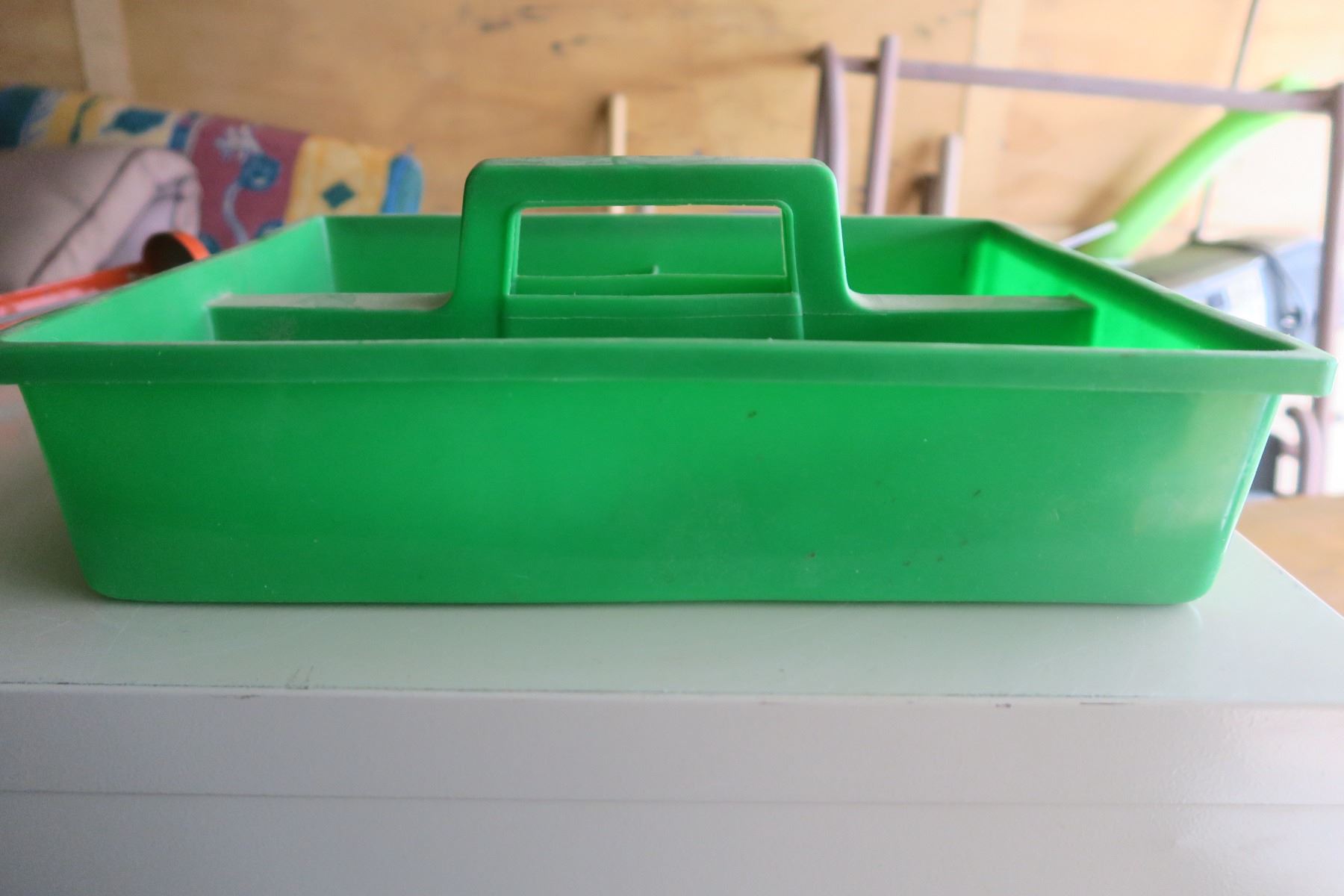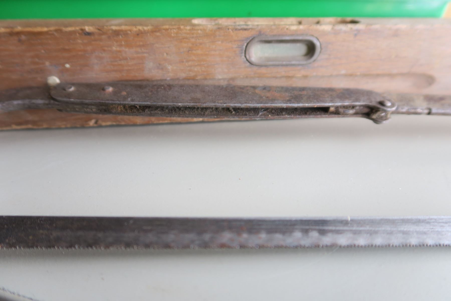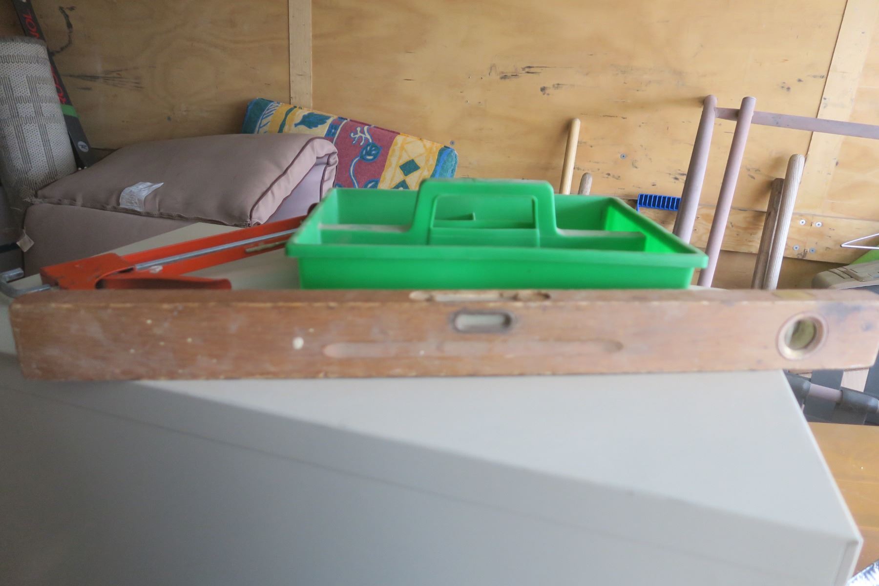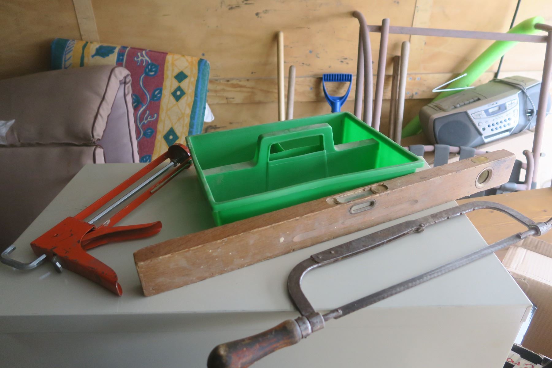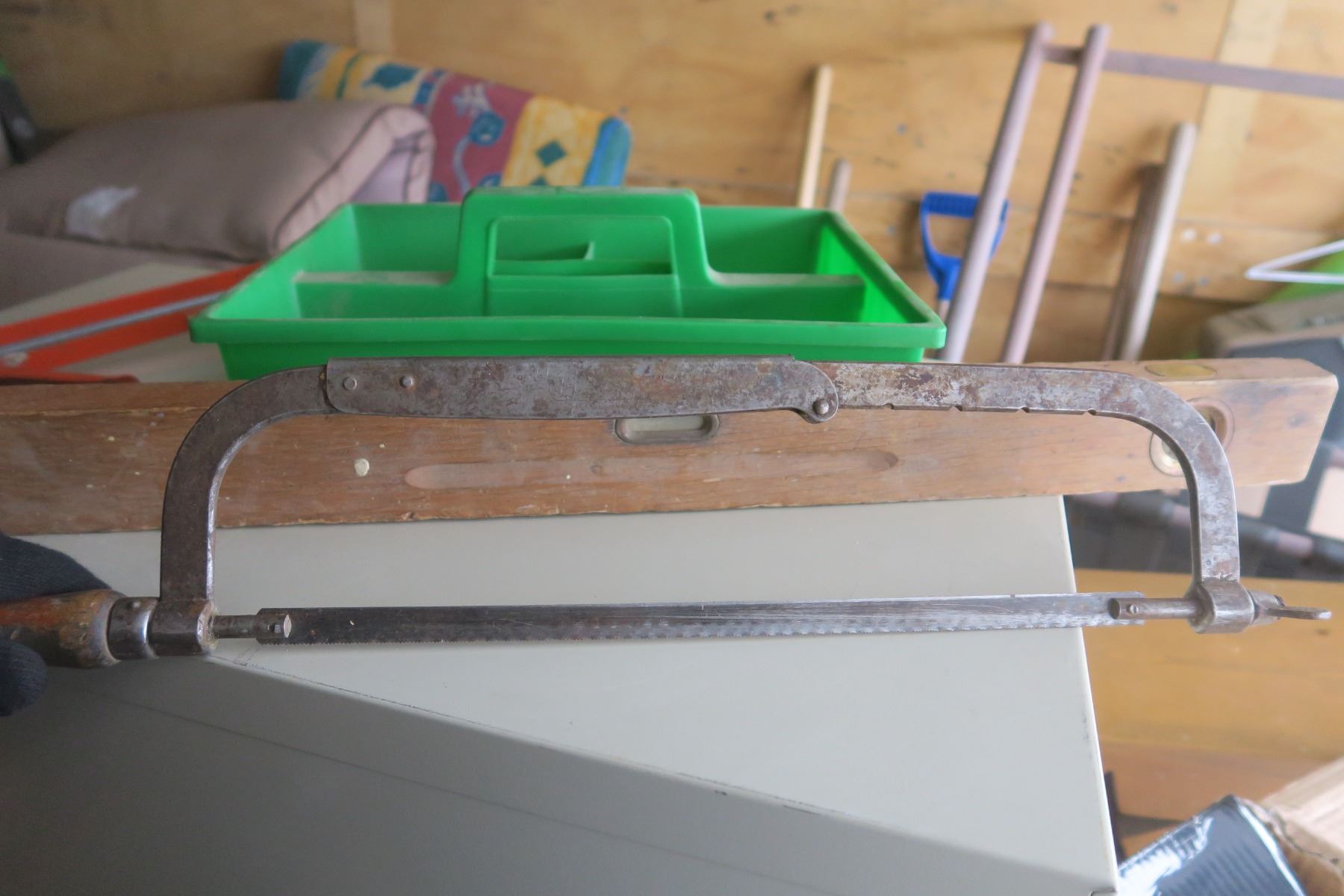 box of misc tools, caulk guns,green trey, antique OAK level, vintage hacksaw