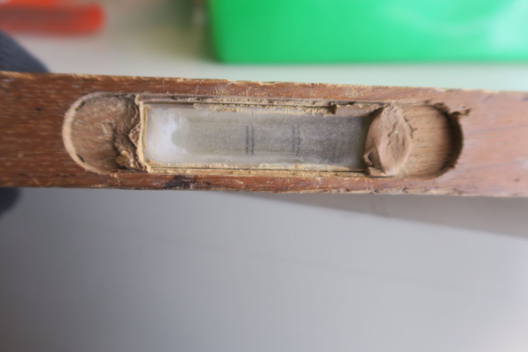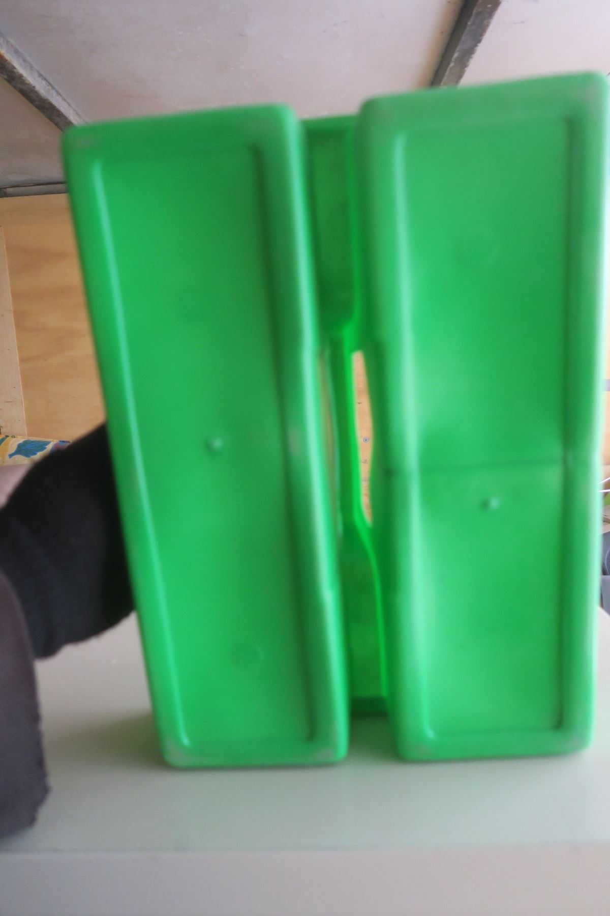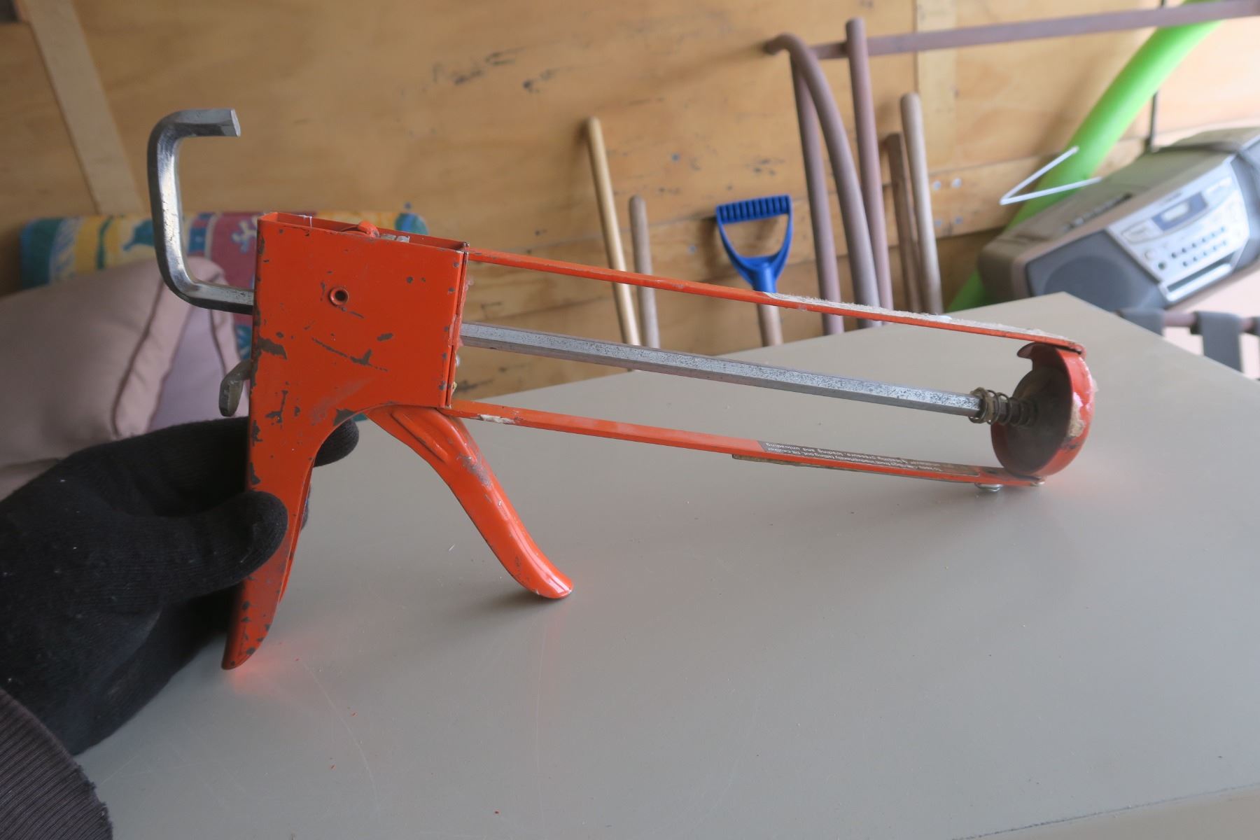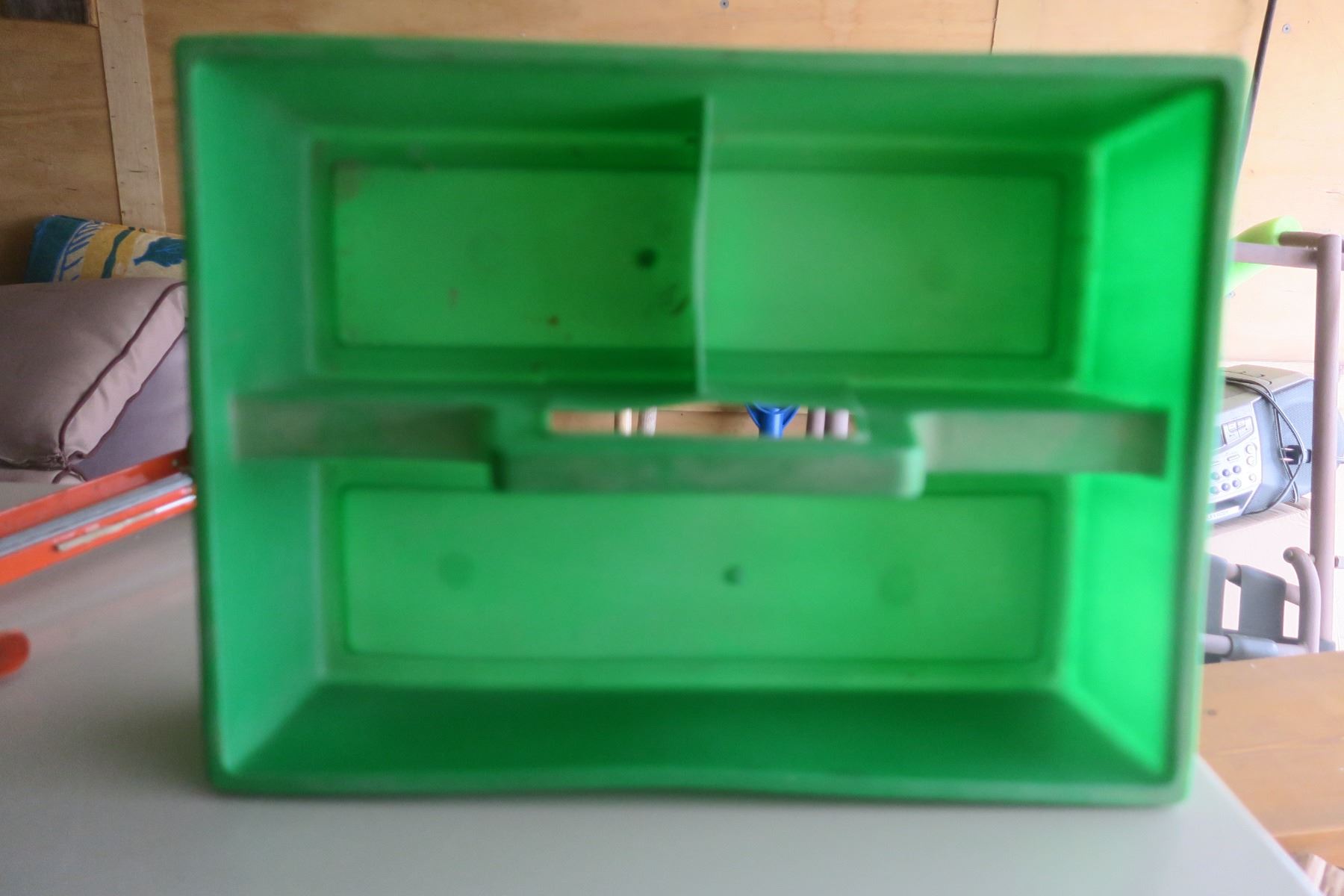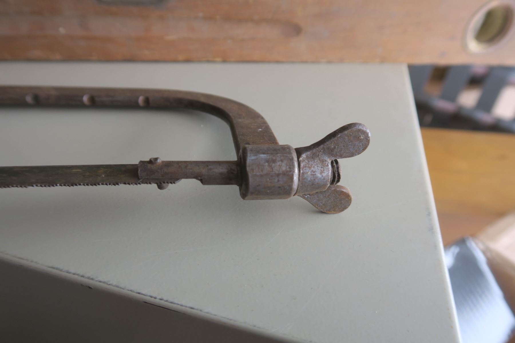 box of misc tools, caulk guns,green trey, antique OAK level, vintage hacksaw