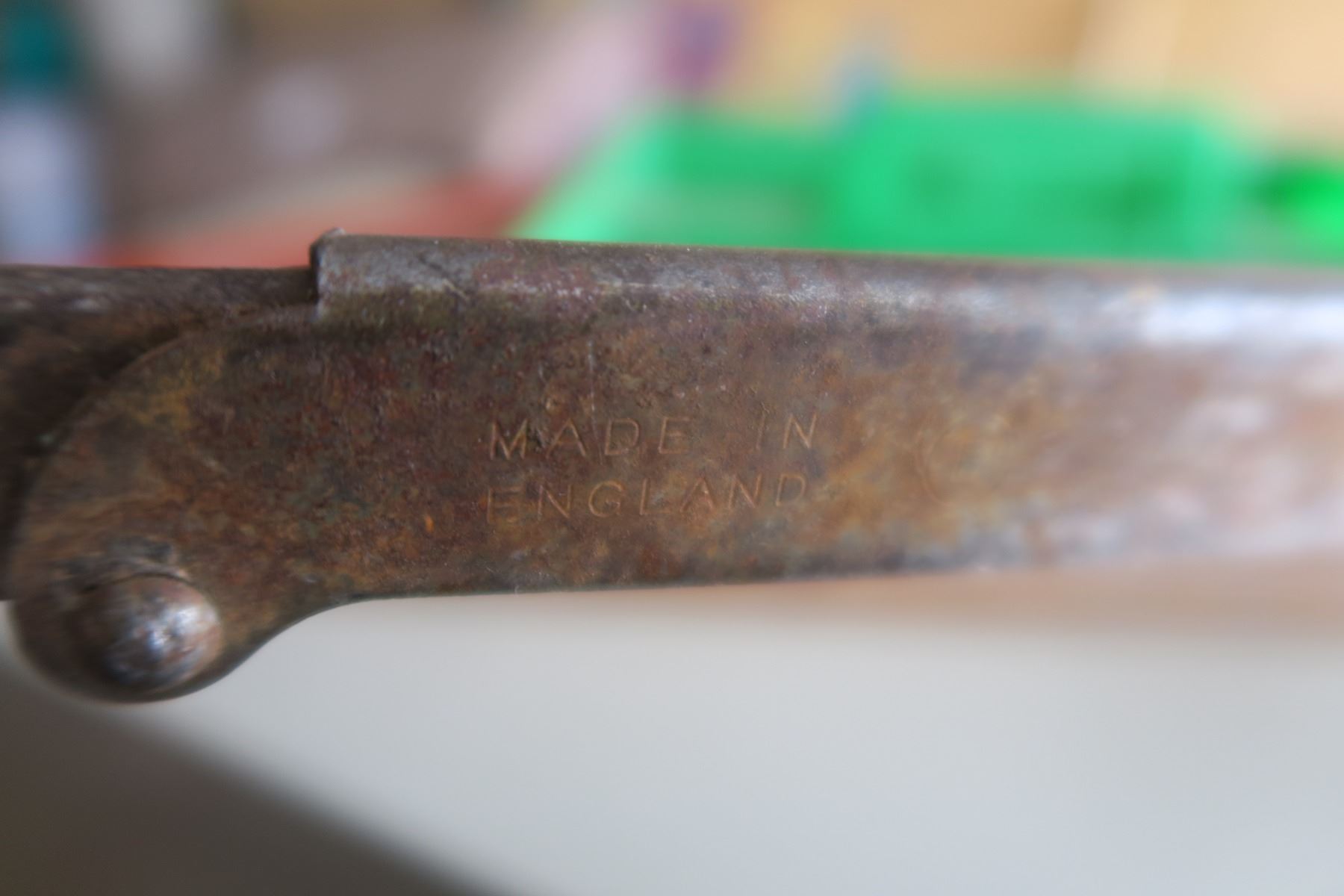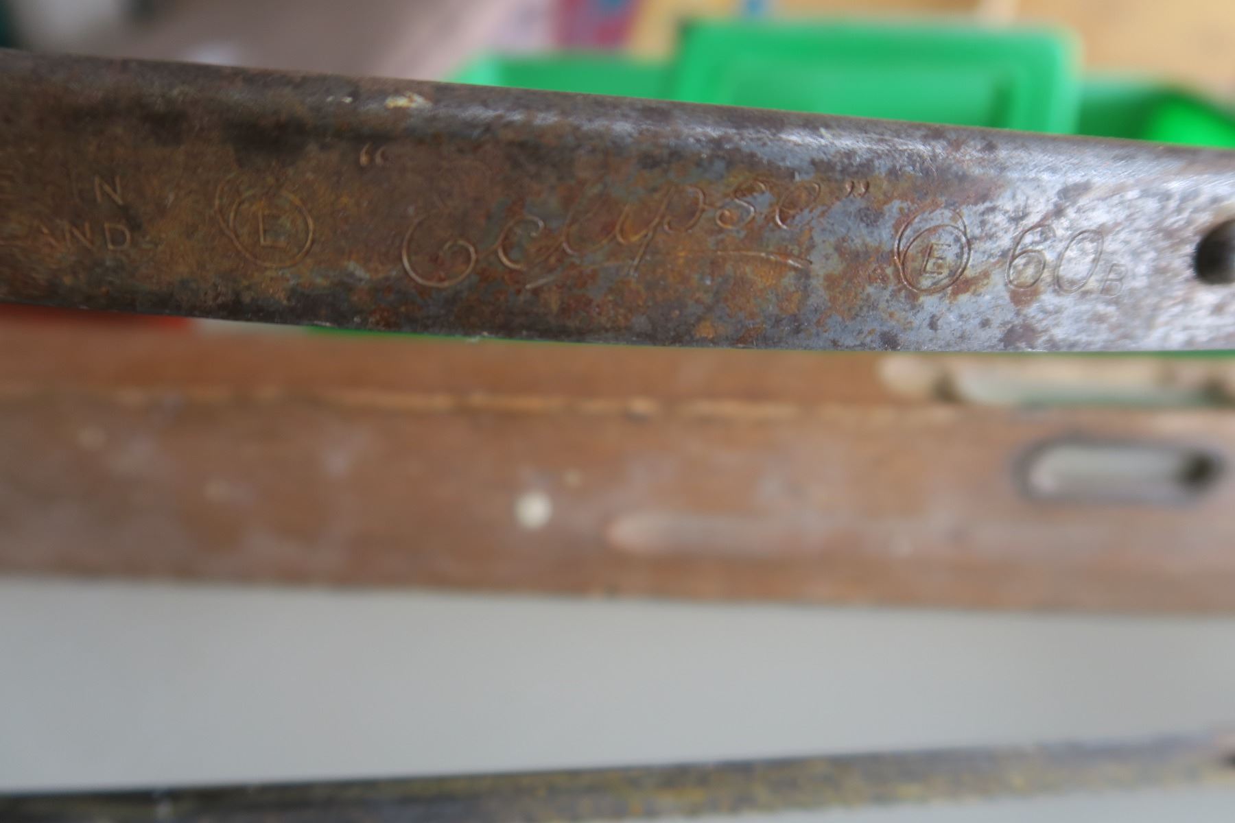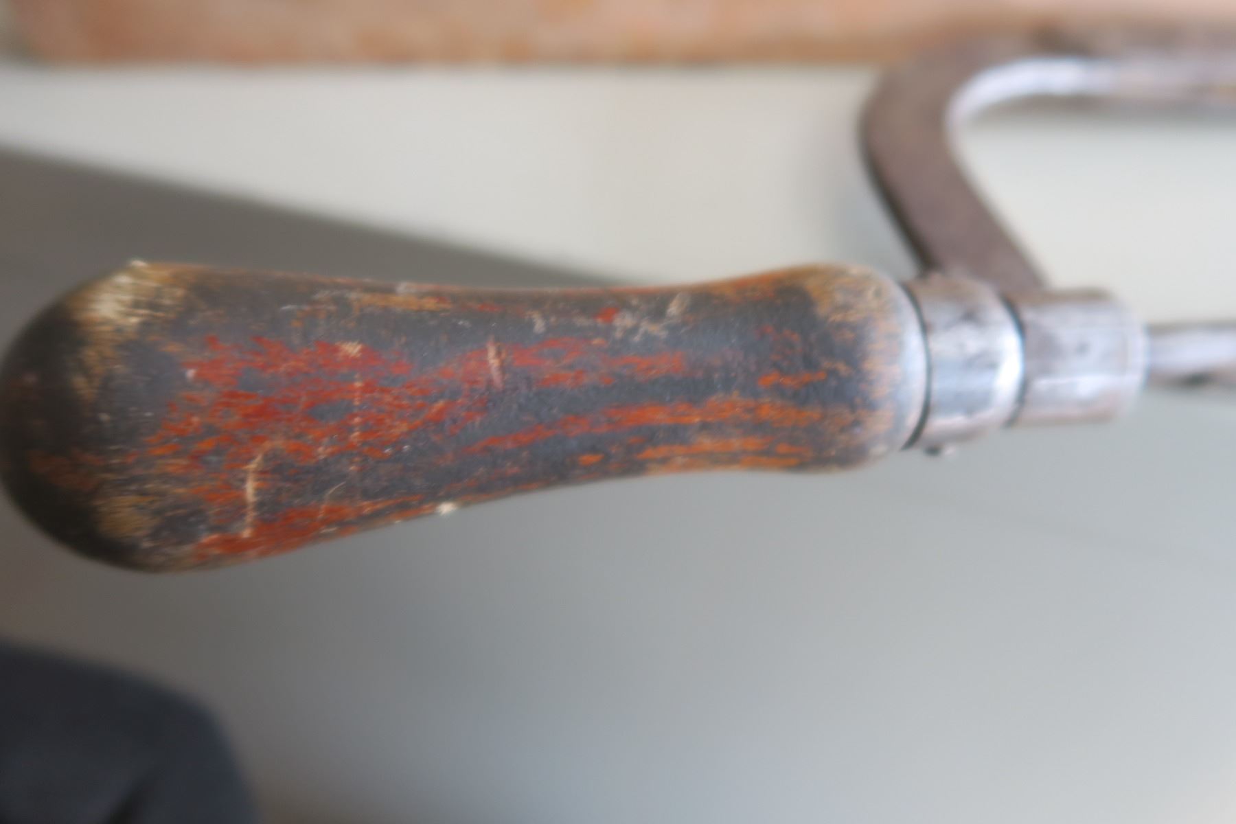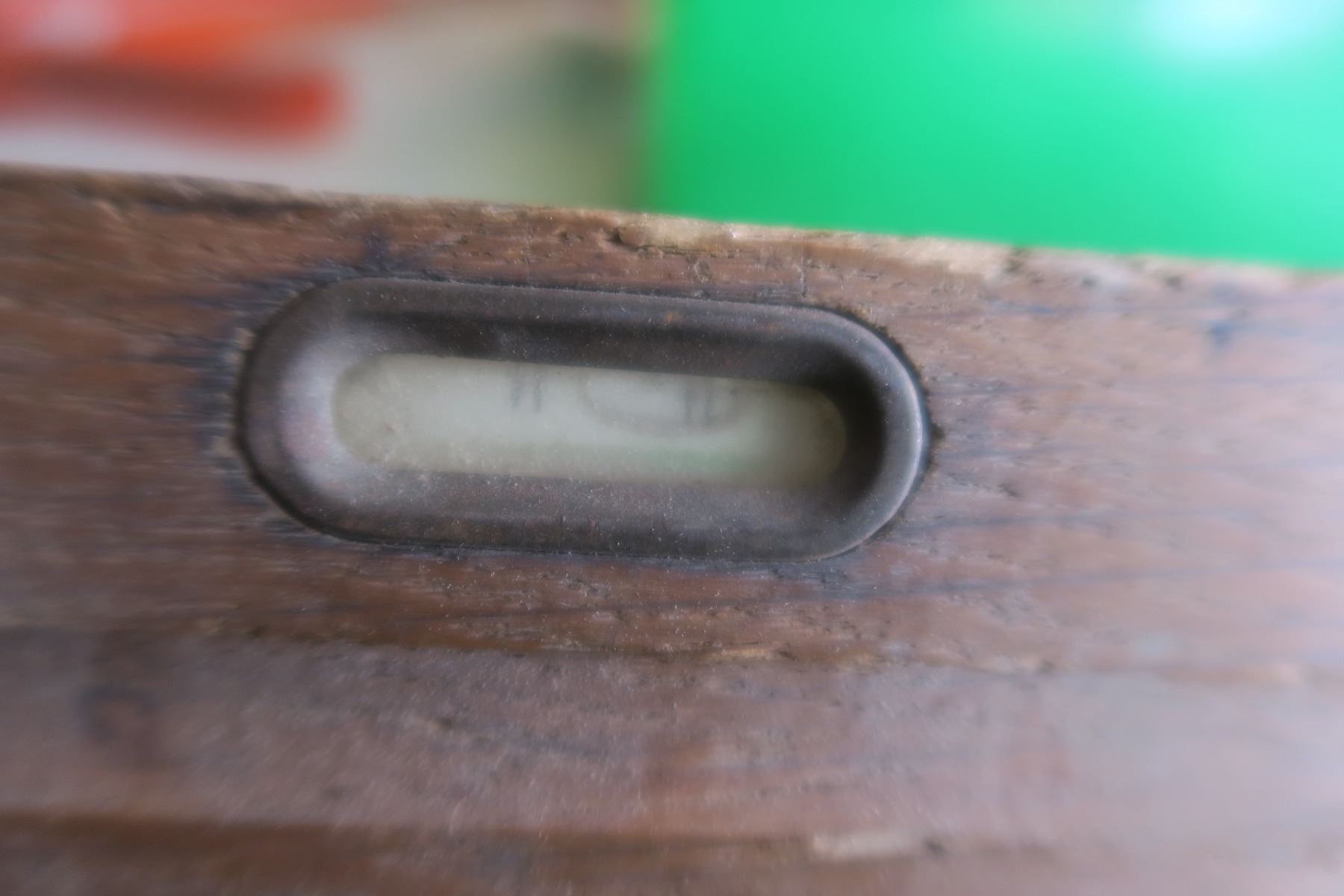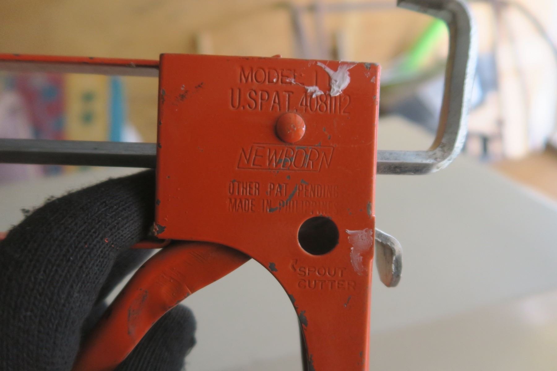box of misc tools, caulk guns,green trey, antique OAK level, vintage hacksaw