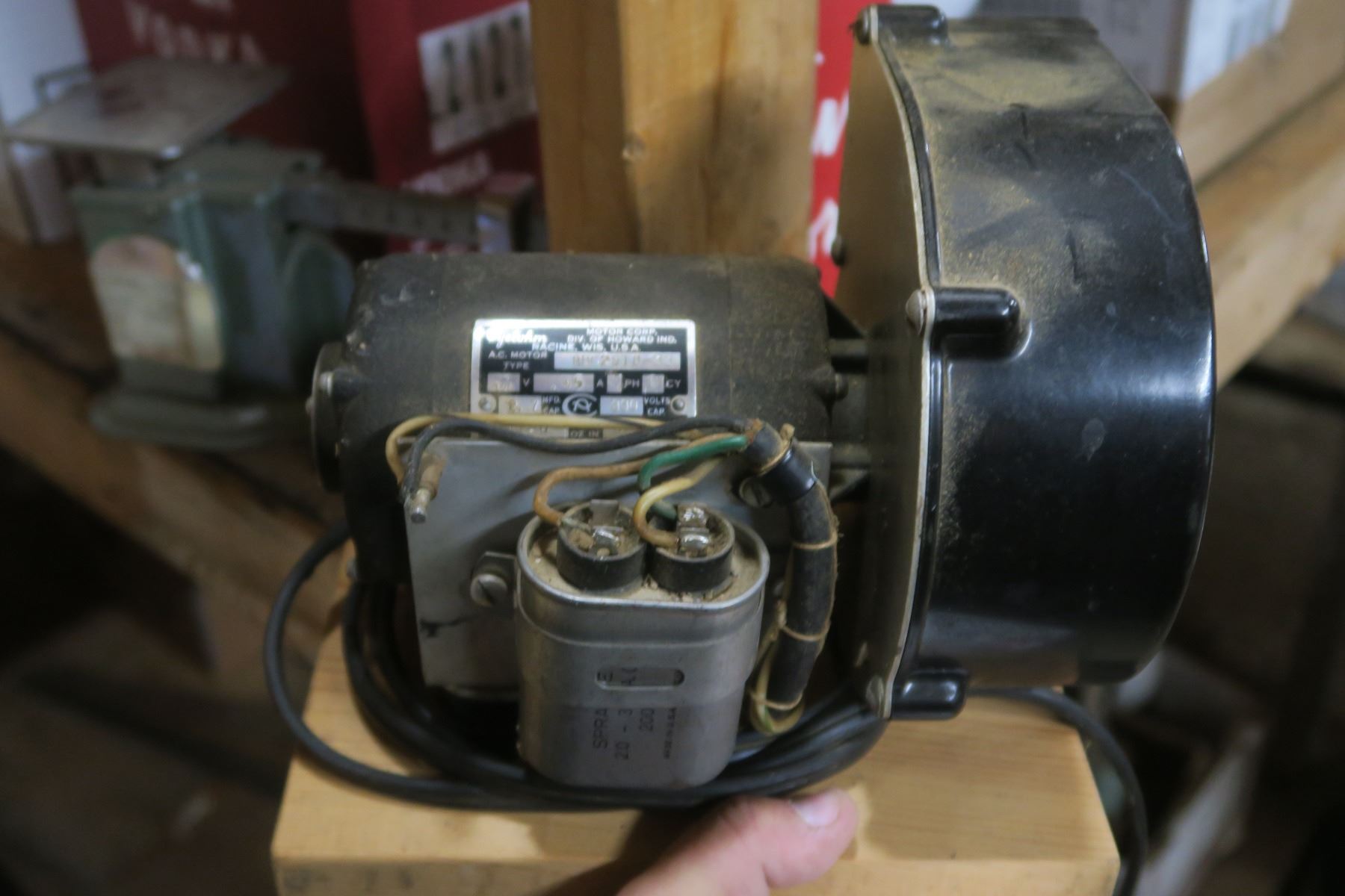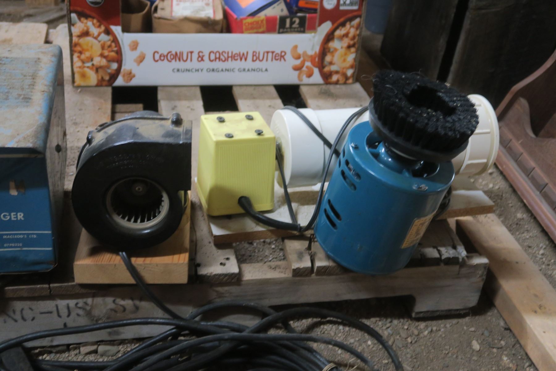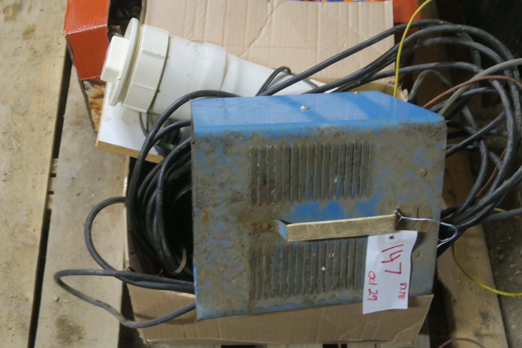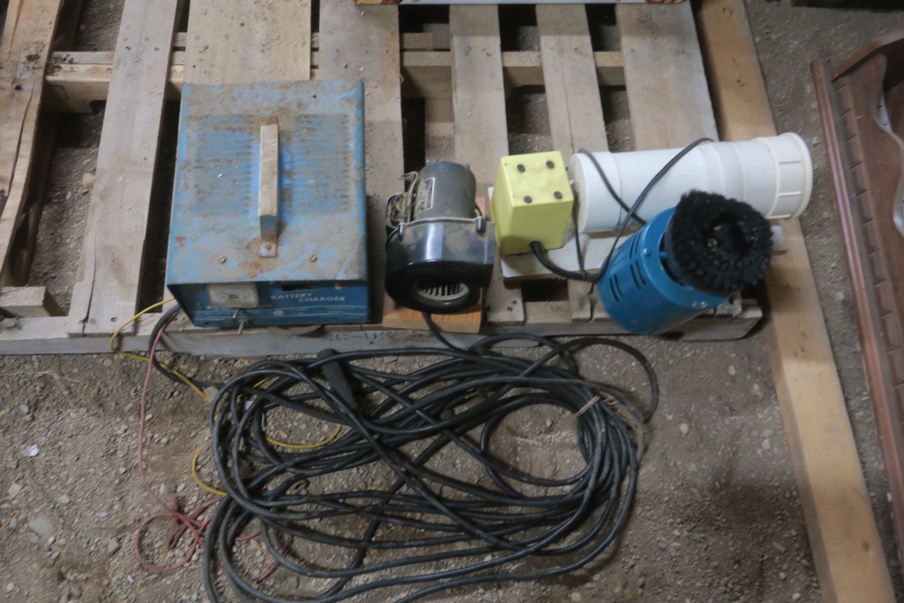 box of other items, motor, homemade trmbler, blower with motor, older battery charger ( untested)