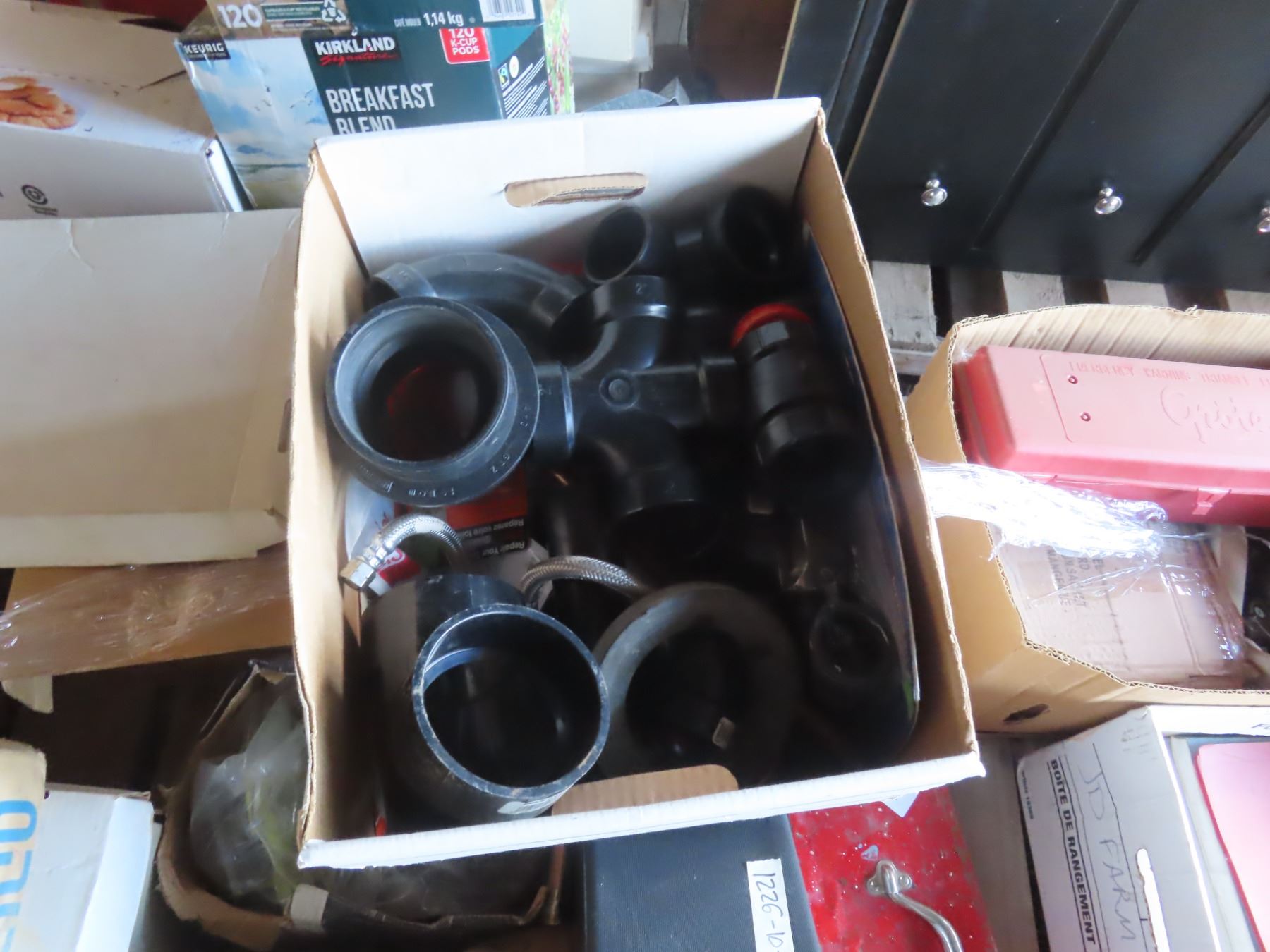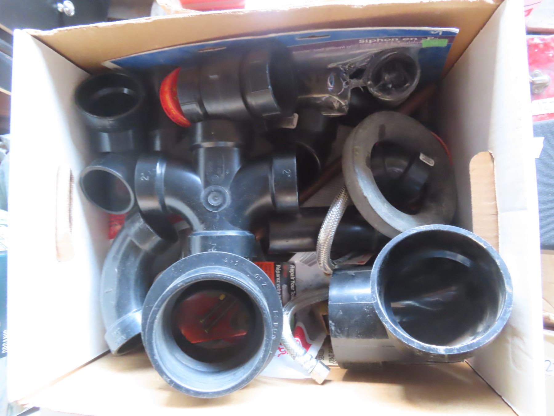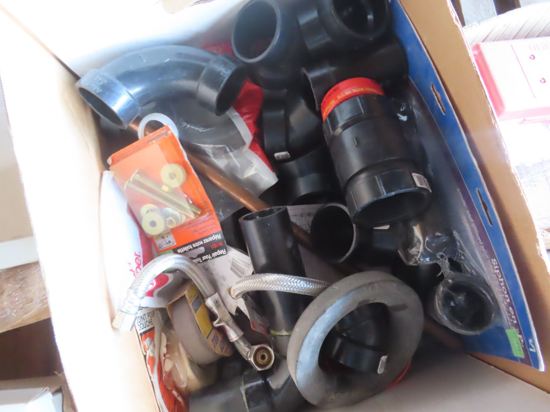 box of pvc piping and assorted hardware