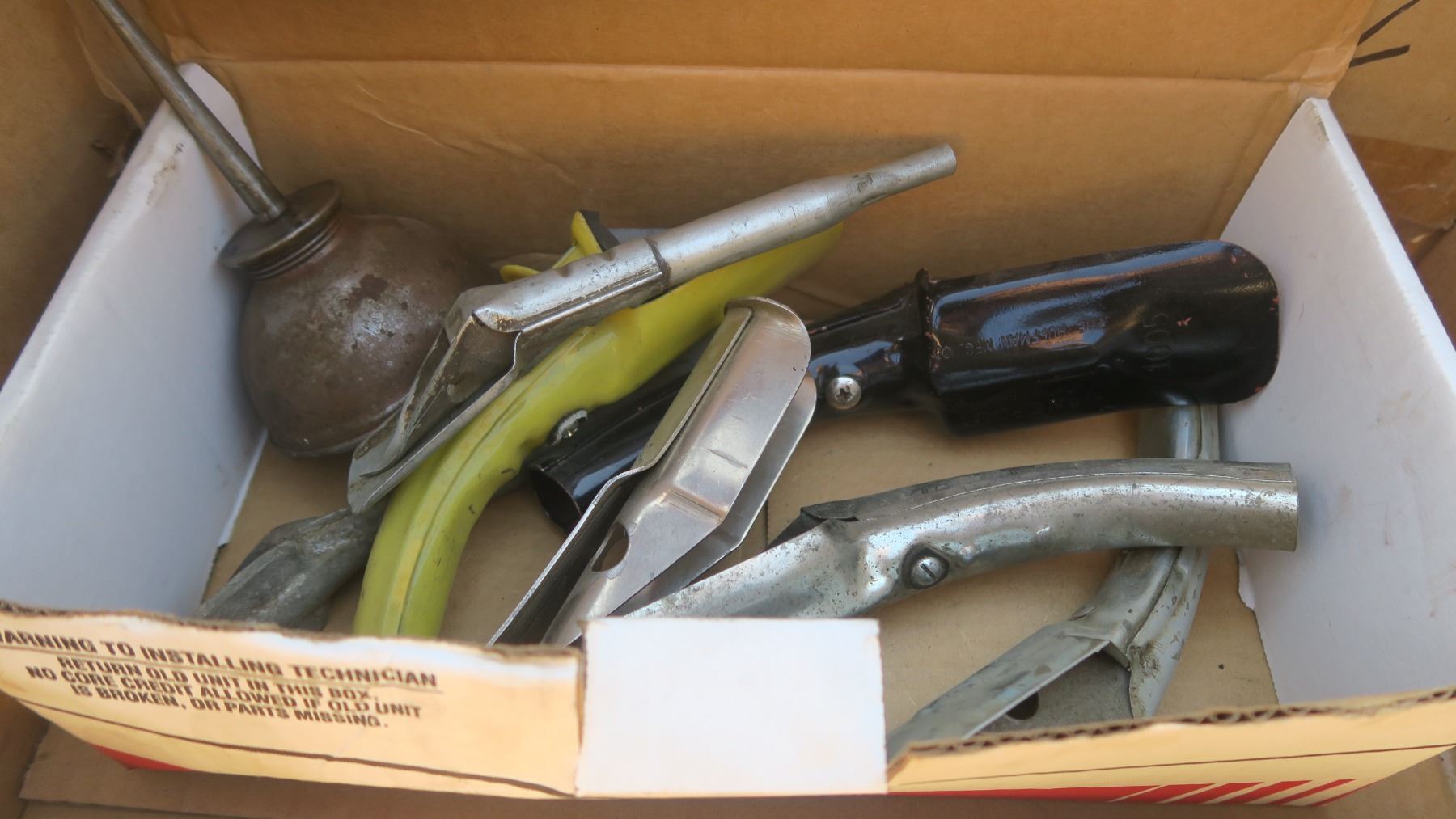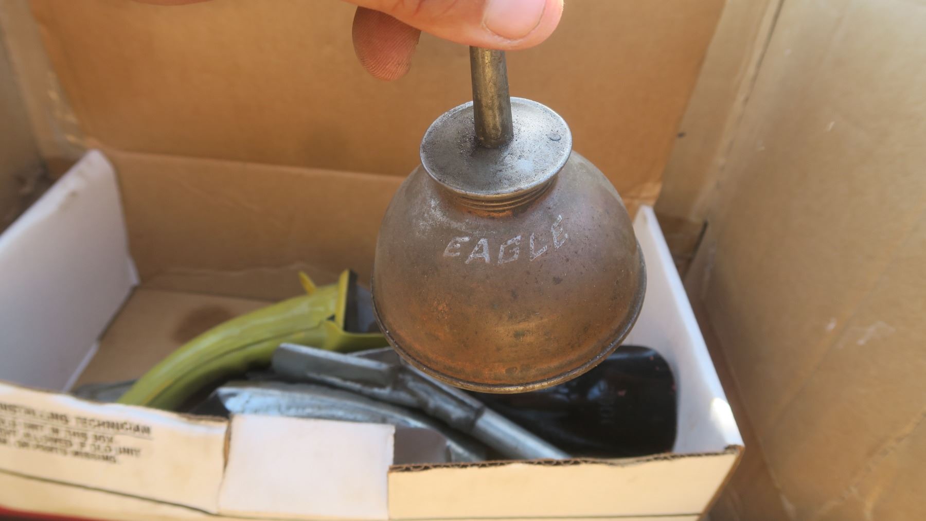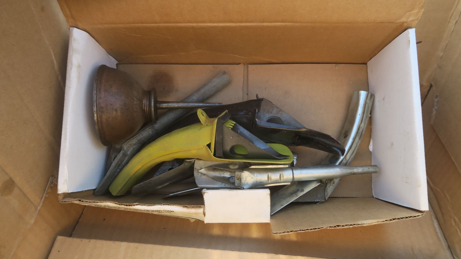 box of spouts and a small oiling can.