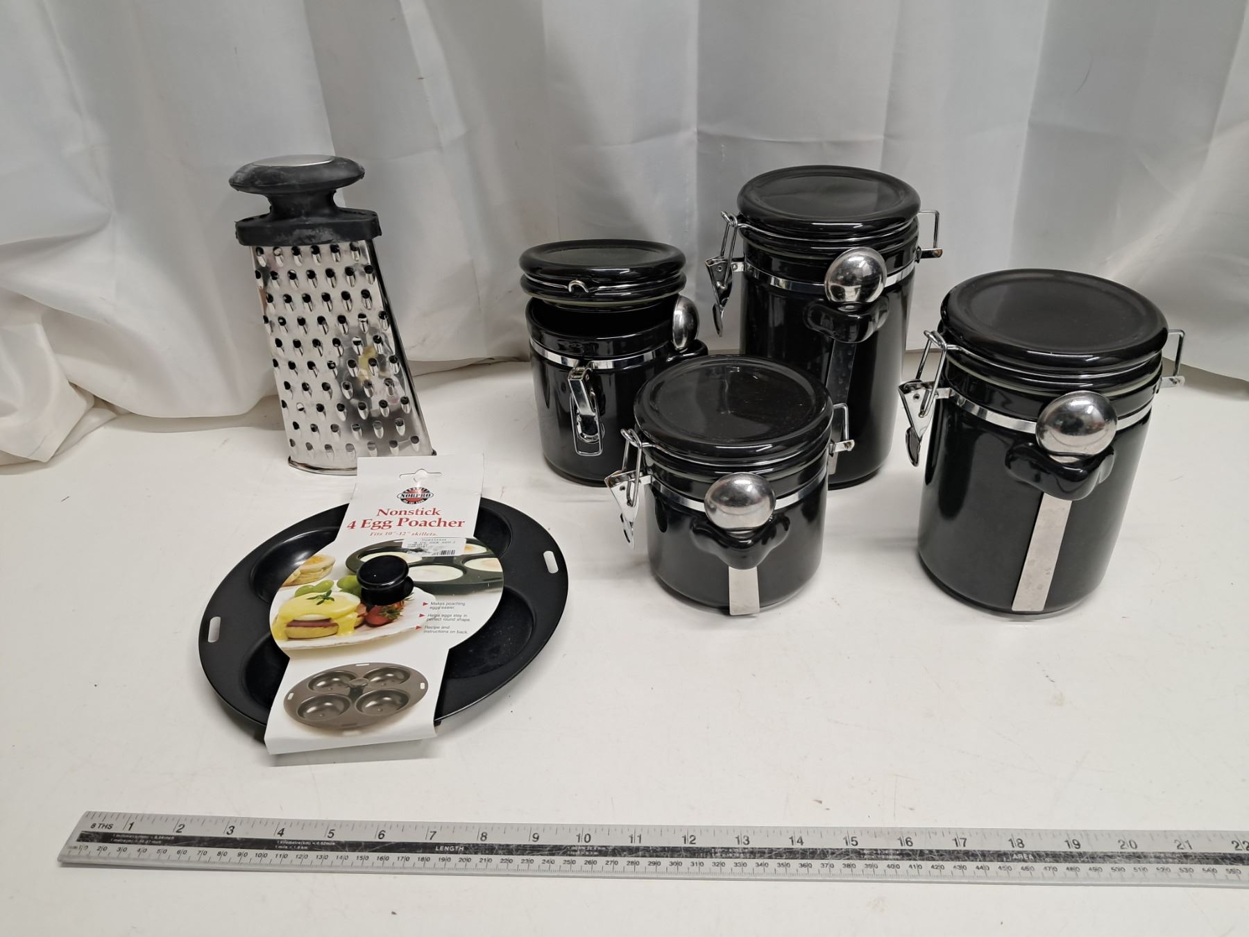 "canaster, egg poacher, grater"