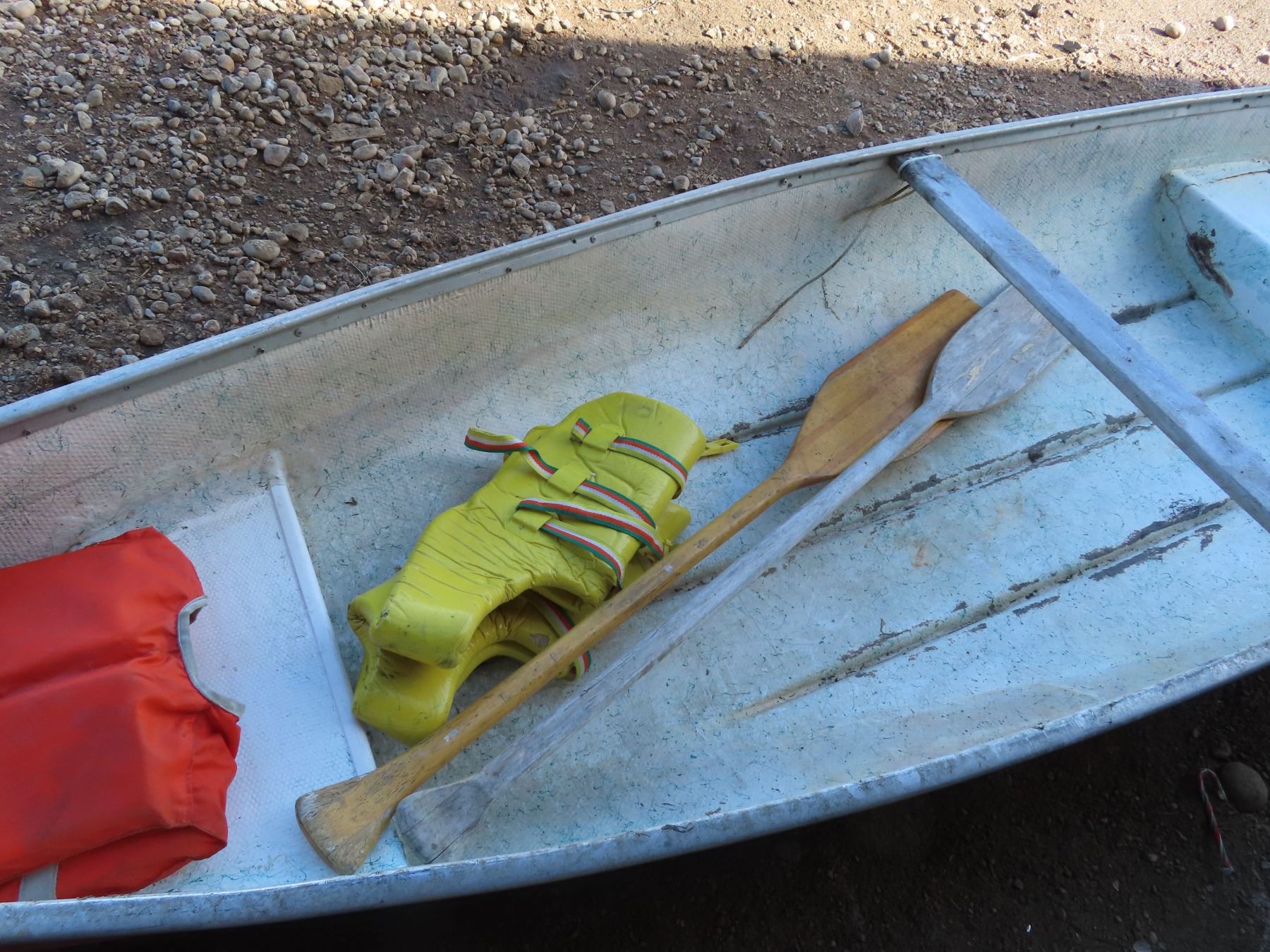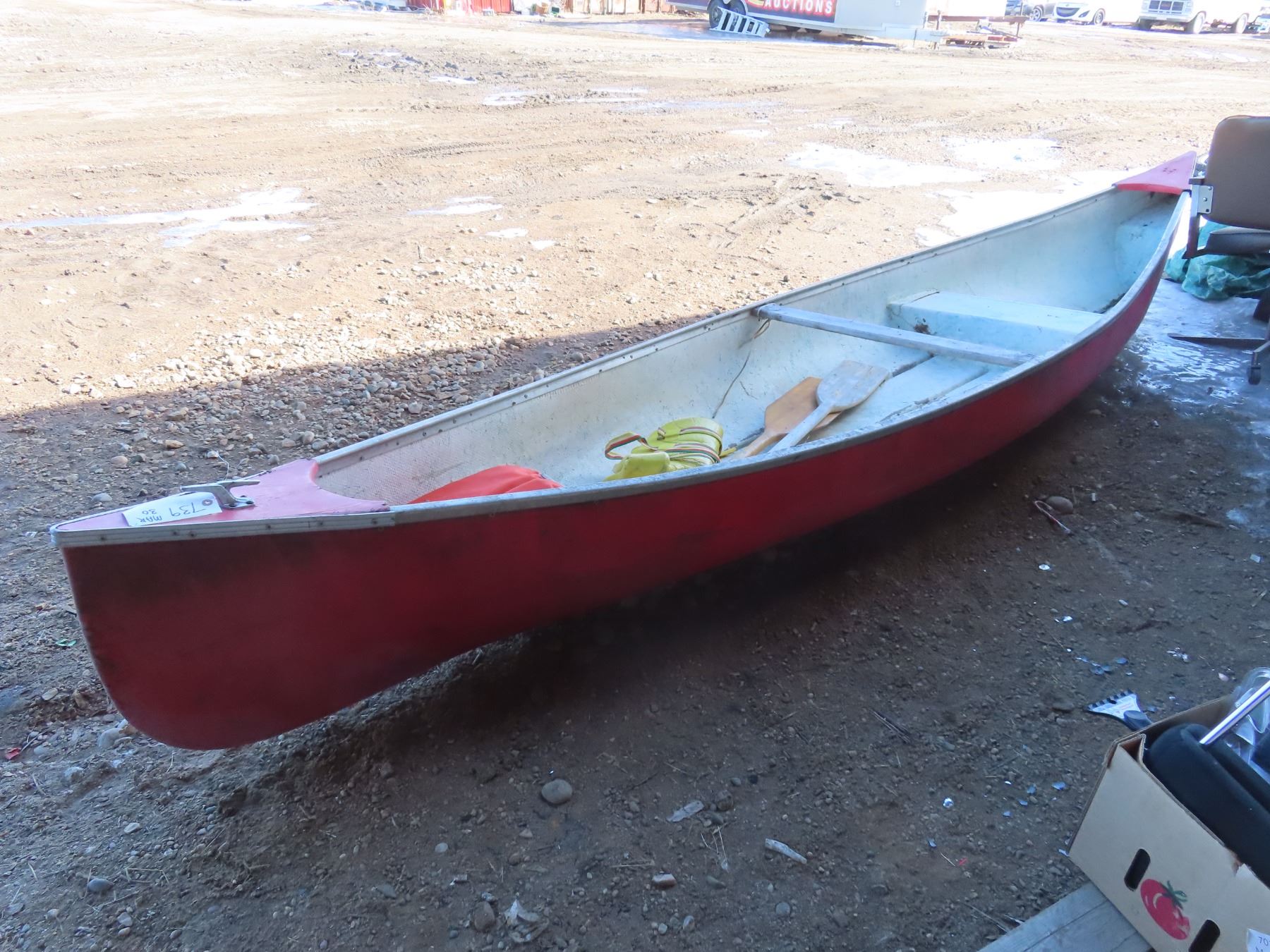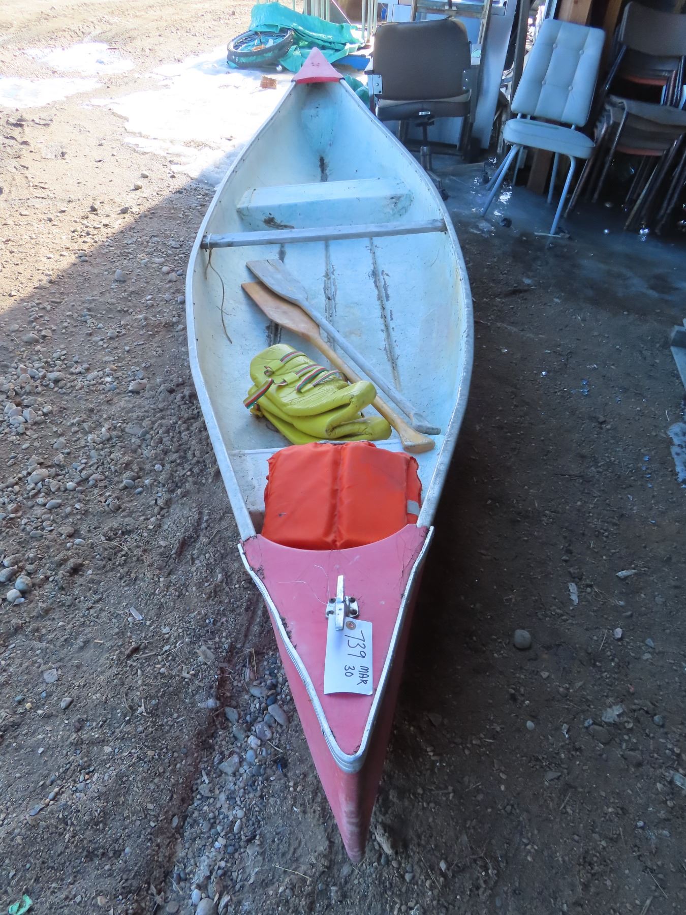 canoe with paddles and life jackets , no leaks sun faded but good condition
