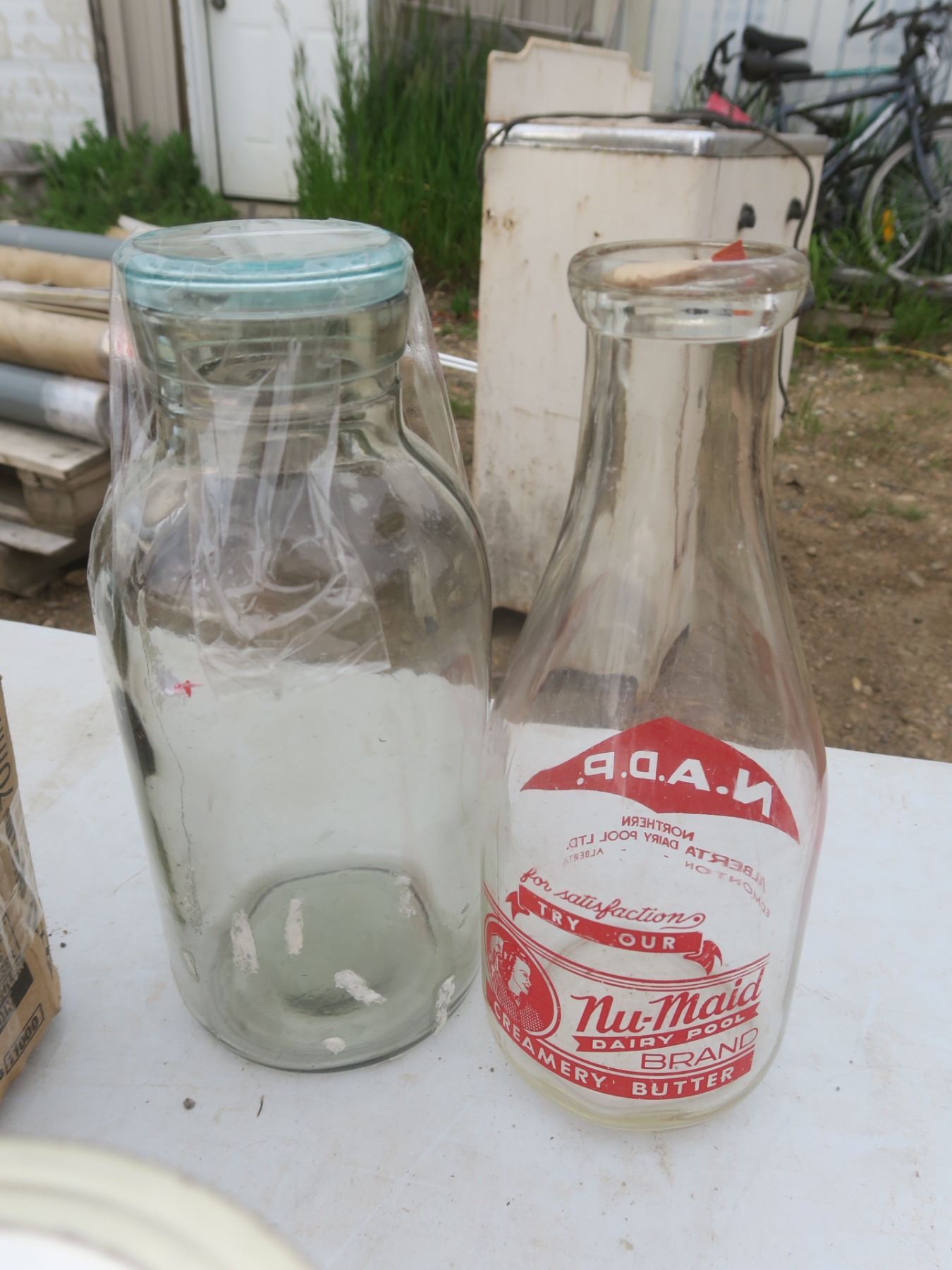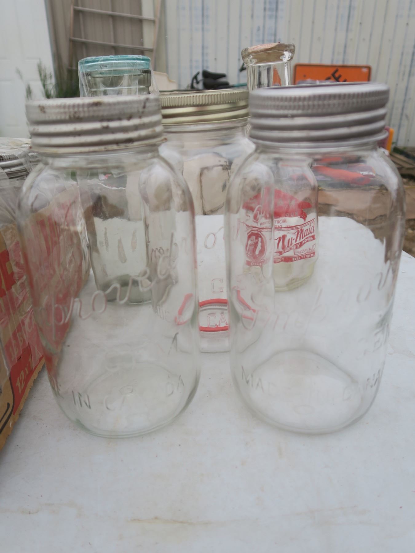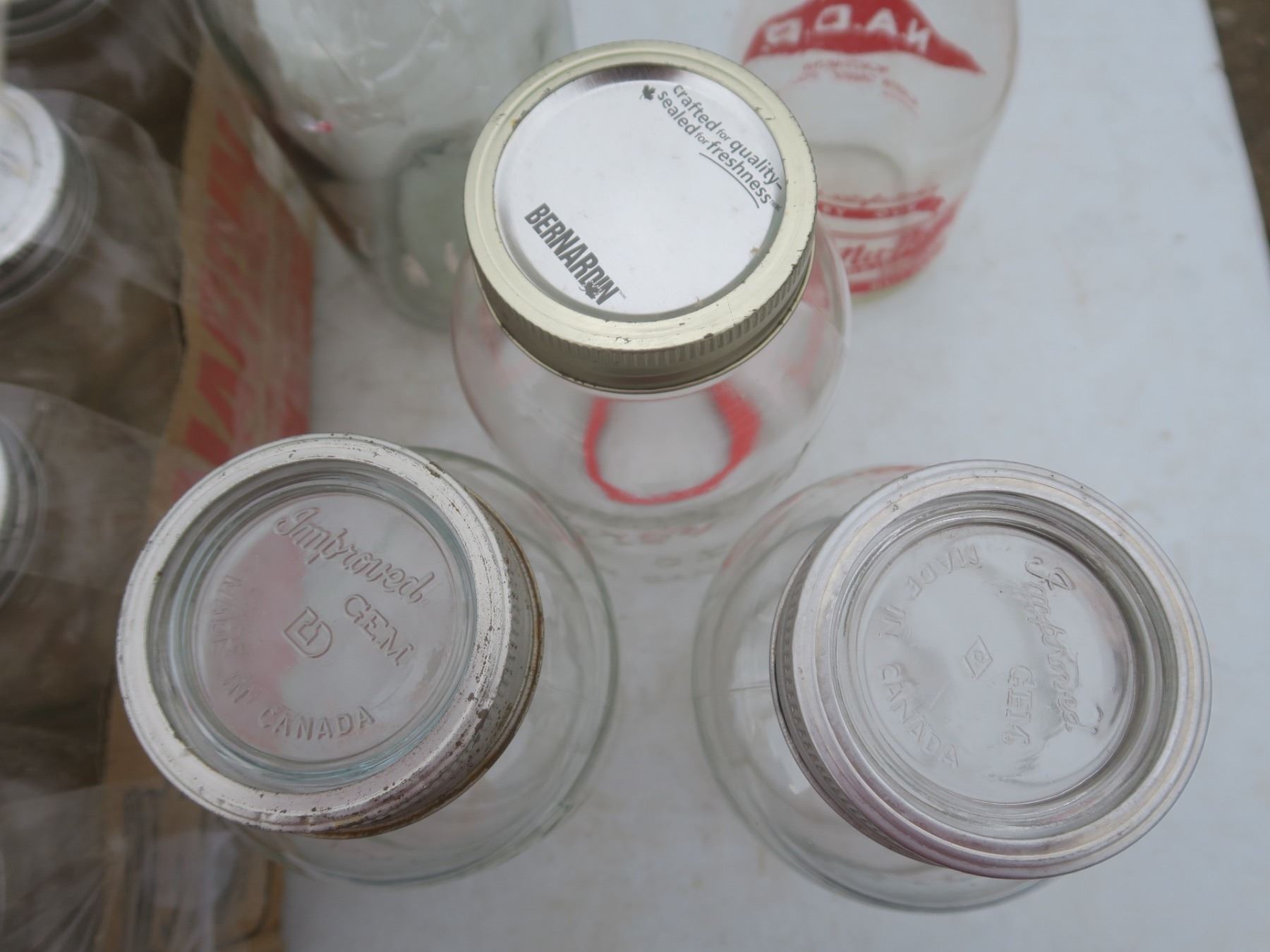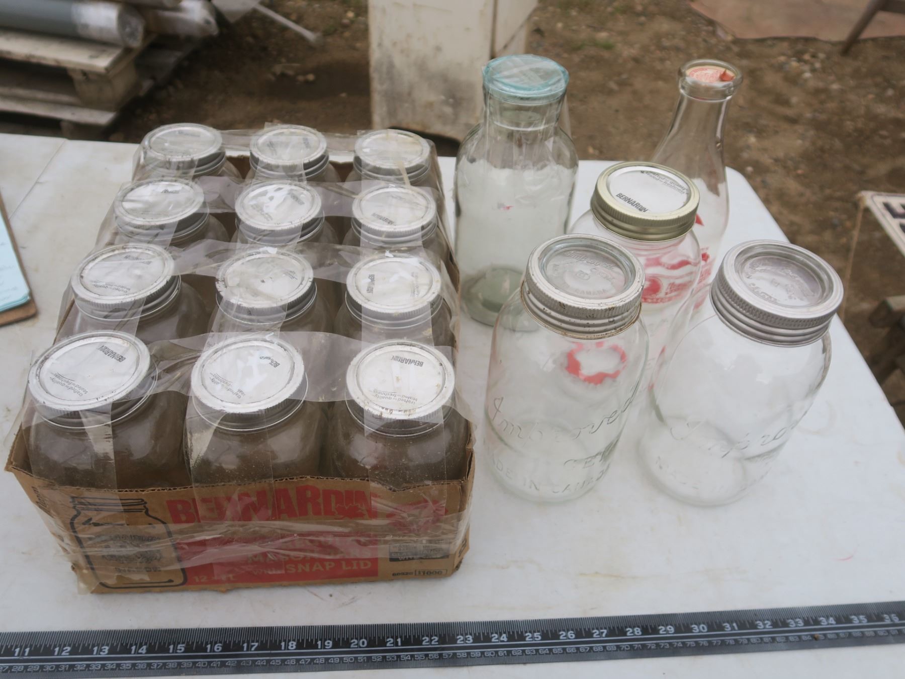 case of Bernardian 1L canning jars, 2 vintage milk jugs and other vintage jars