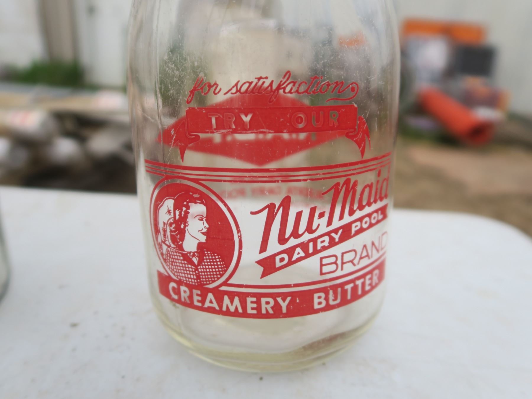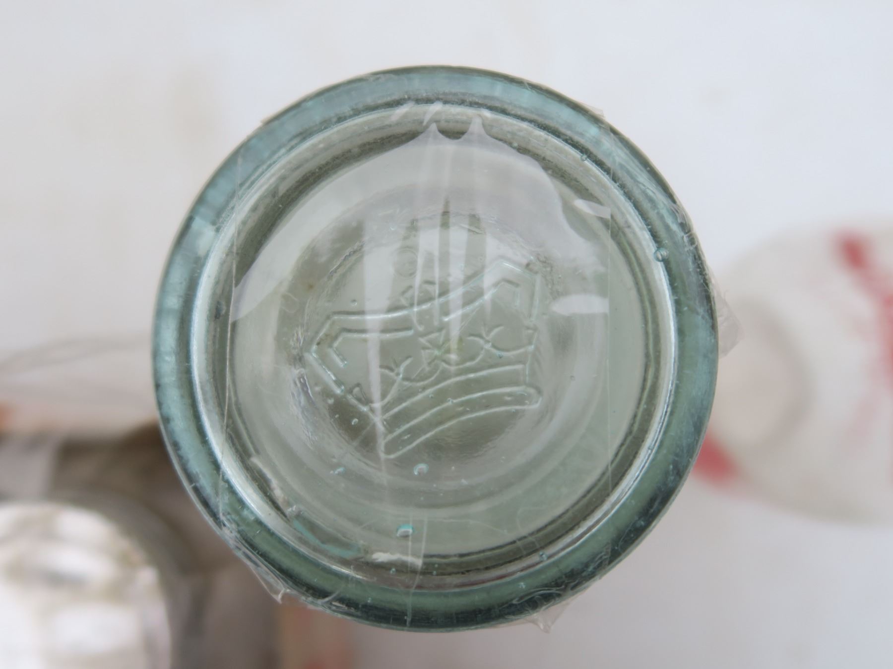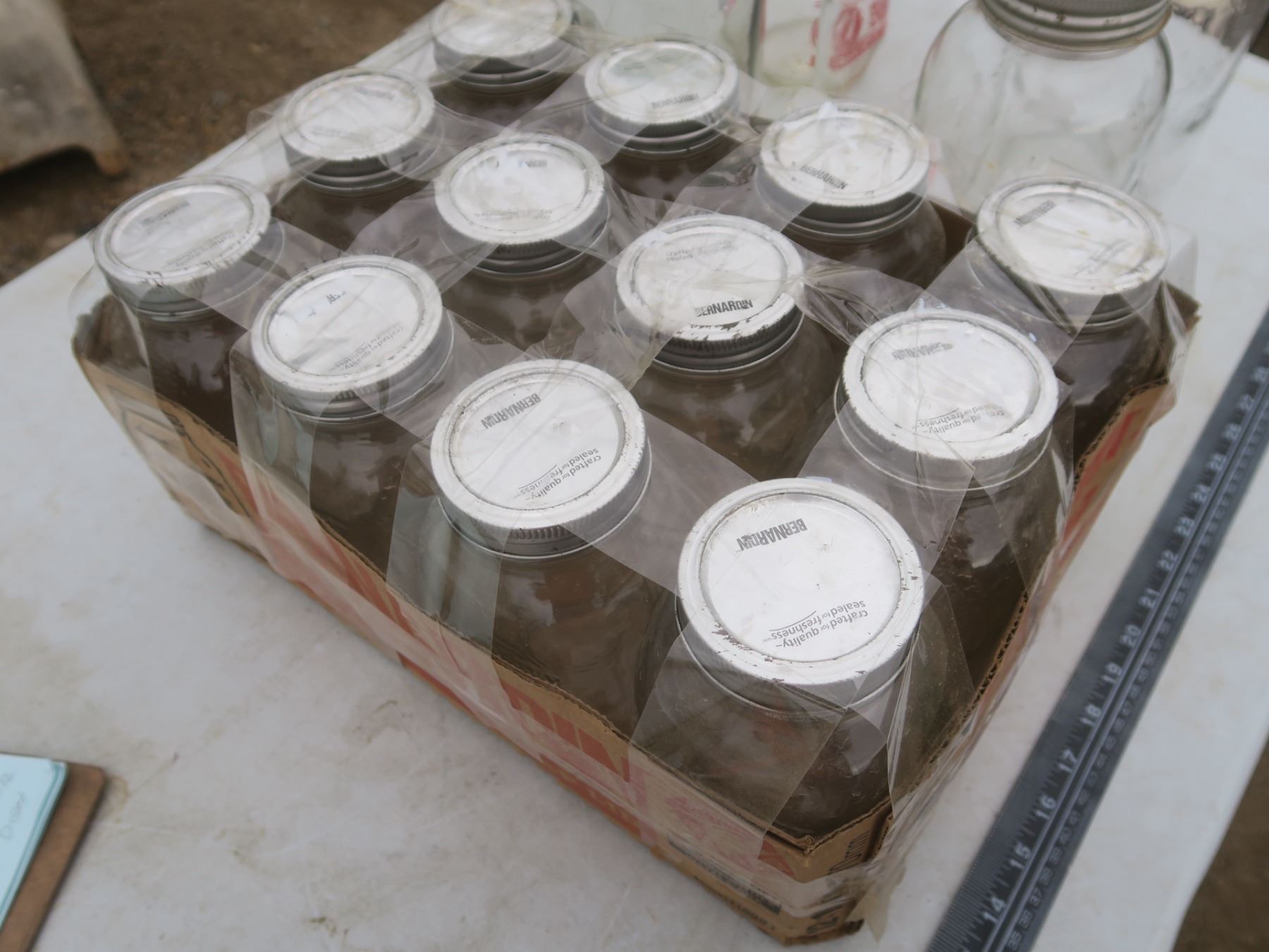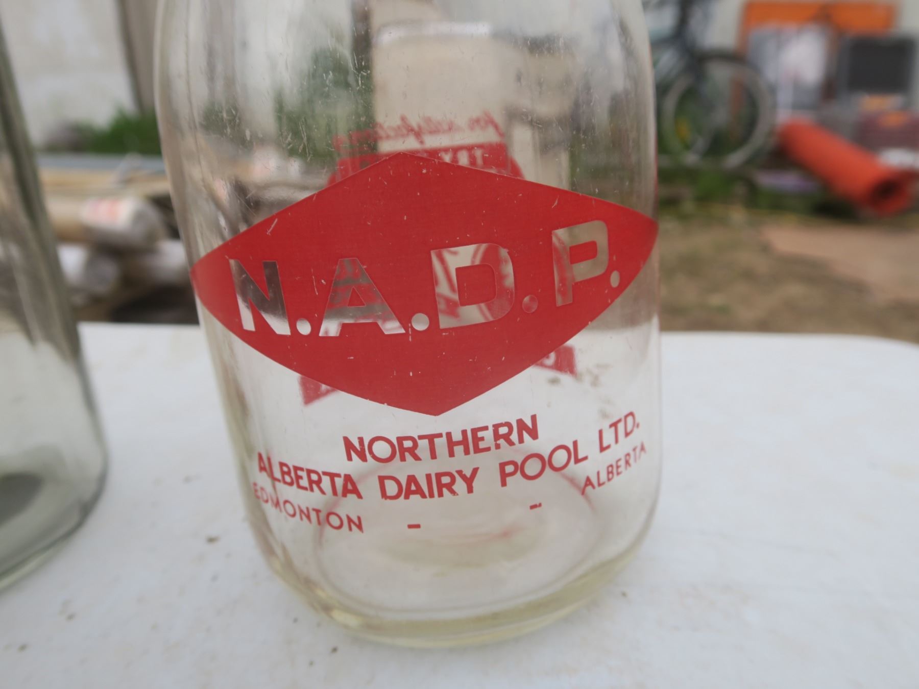 case of Bernardian 1L canning jars, 2 vintage milk jugs and other vintage jars
