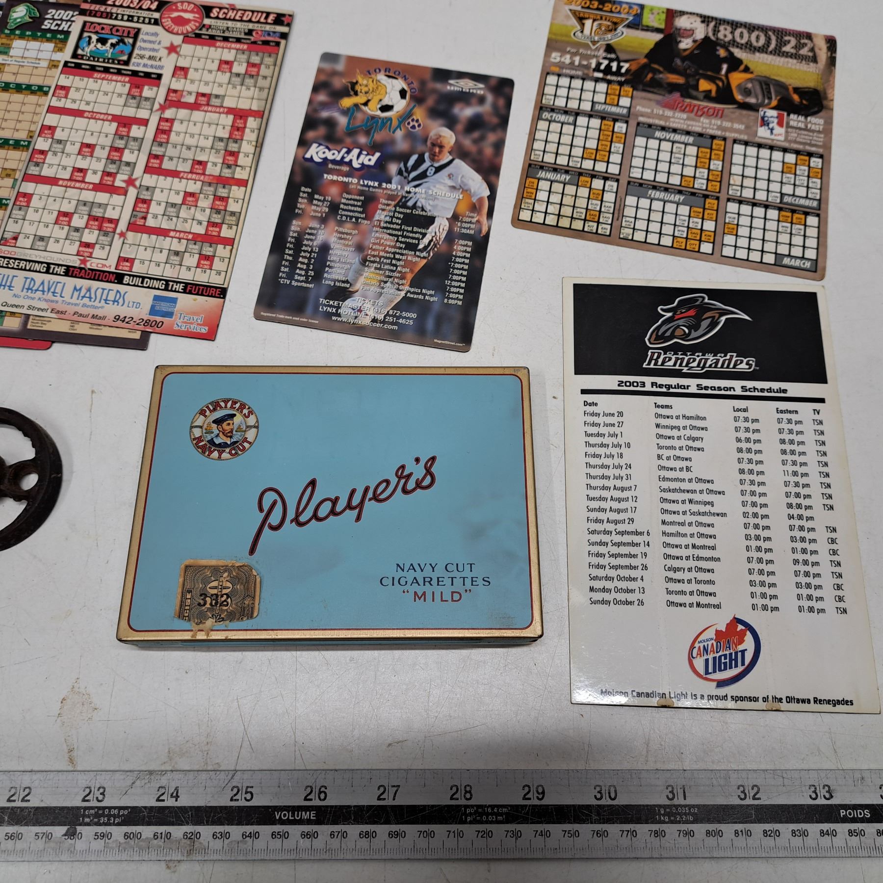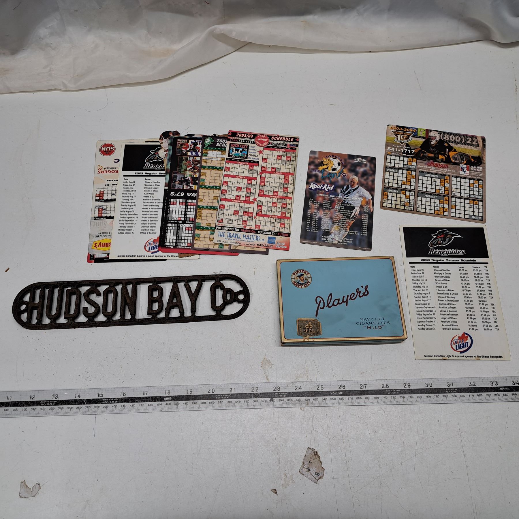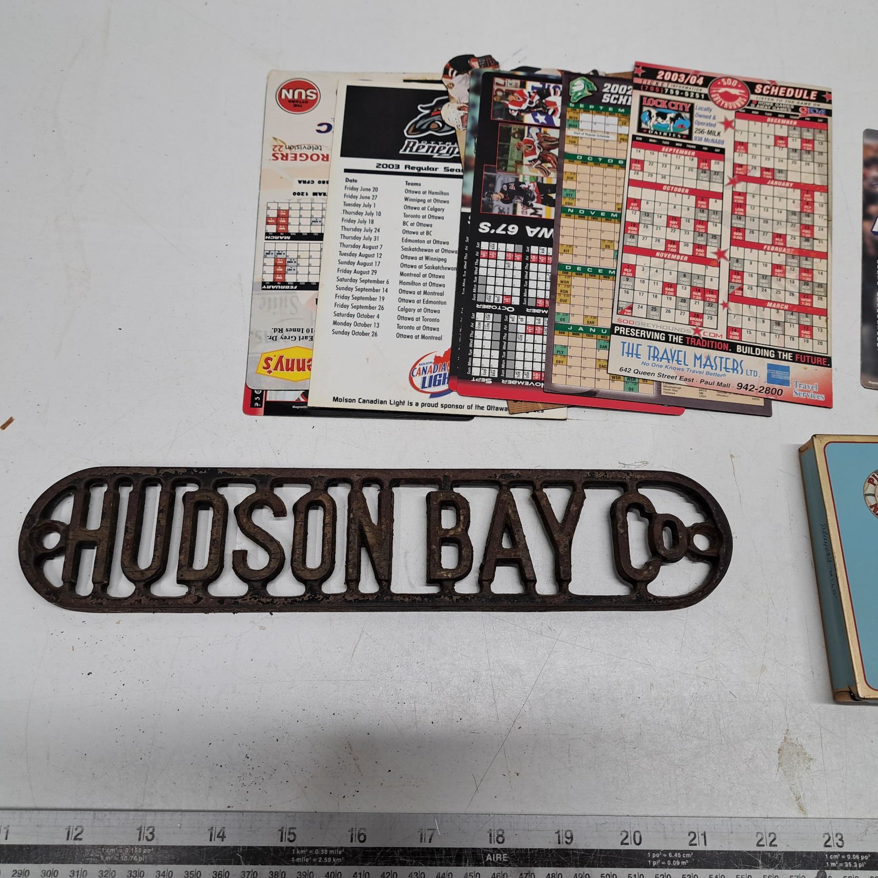 cast iron hudson bay sign , players empty tin, and sports magnets for fridge