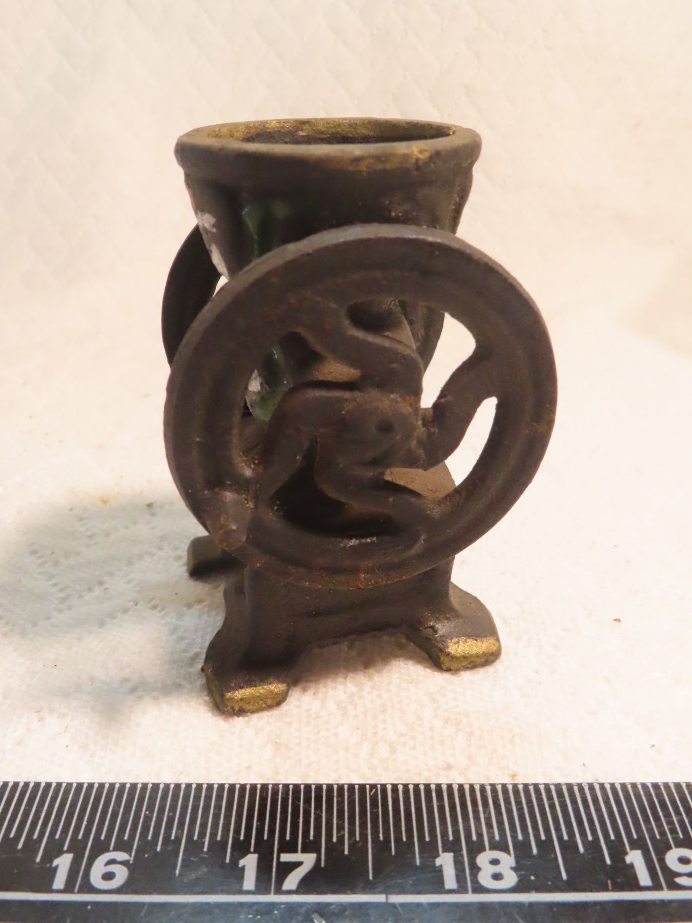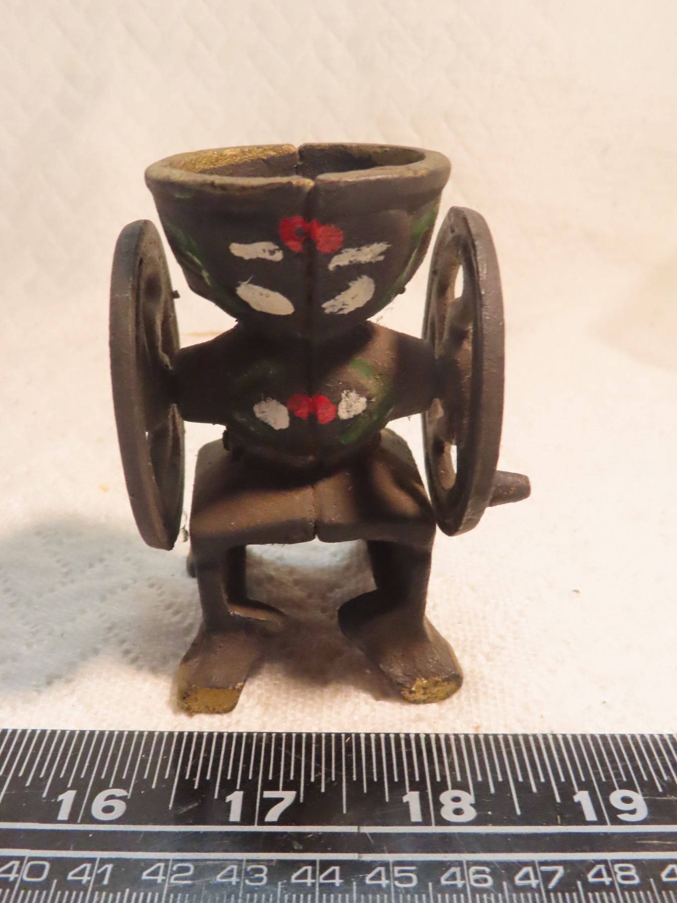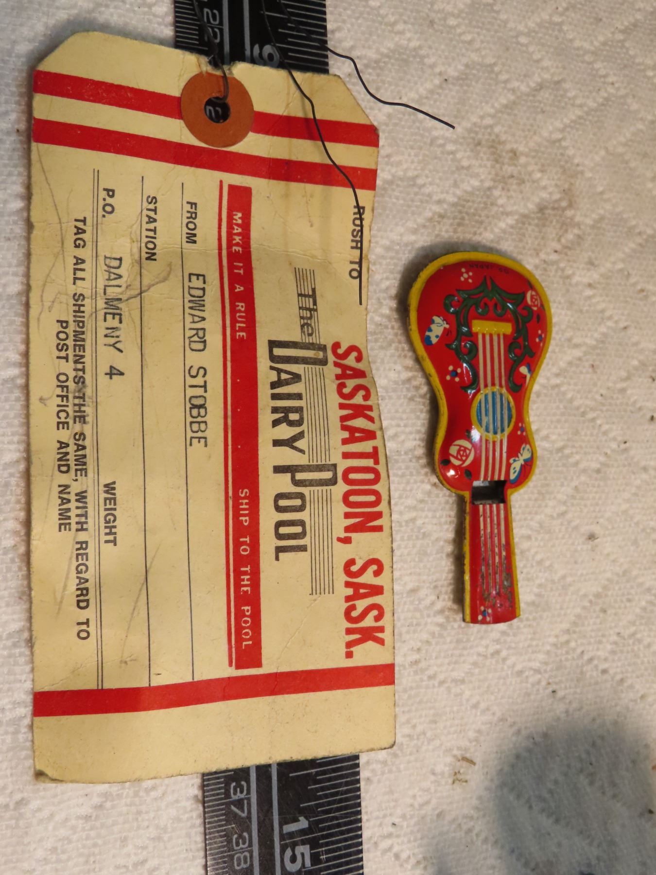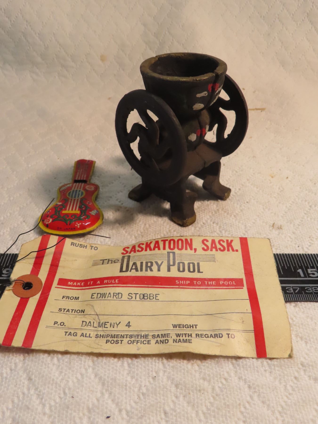 cast mill figurine, tin guitar, Sask dairy pool tag