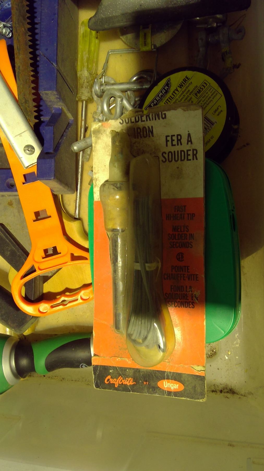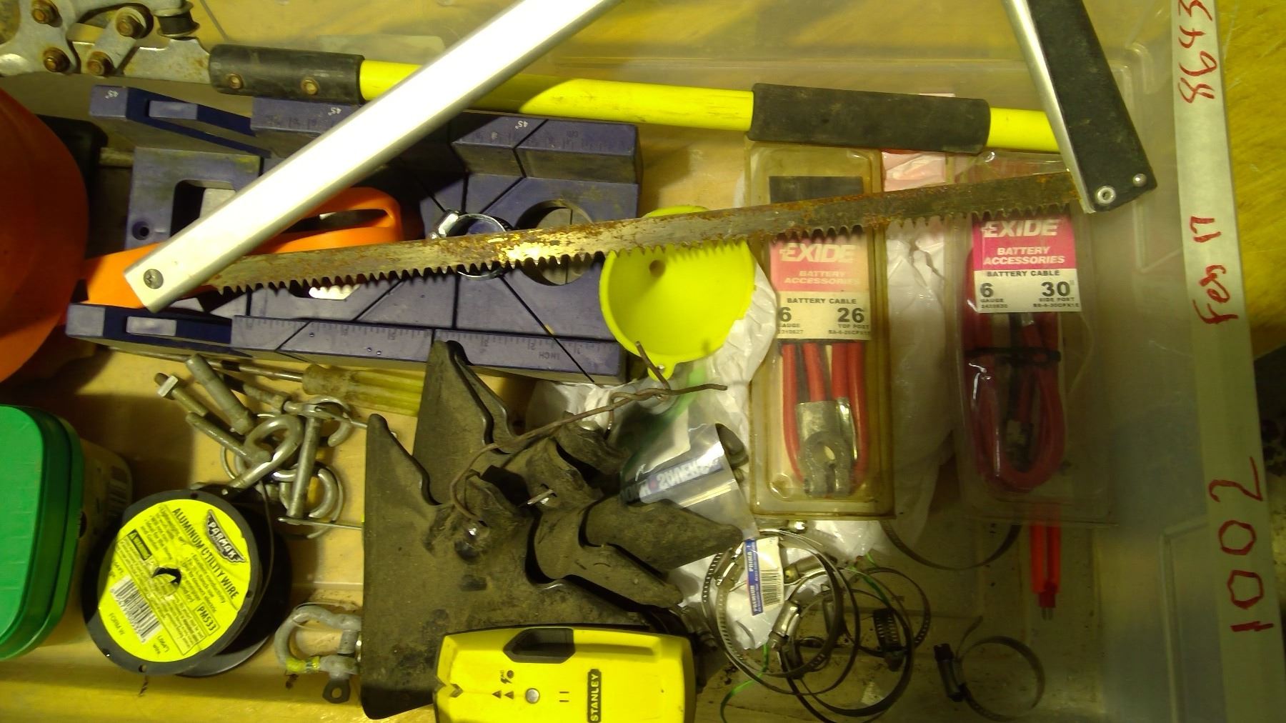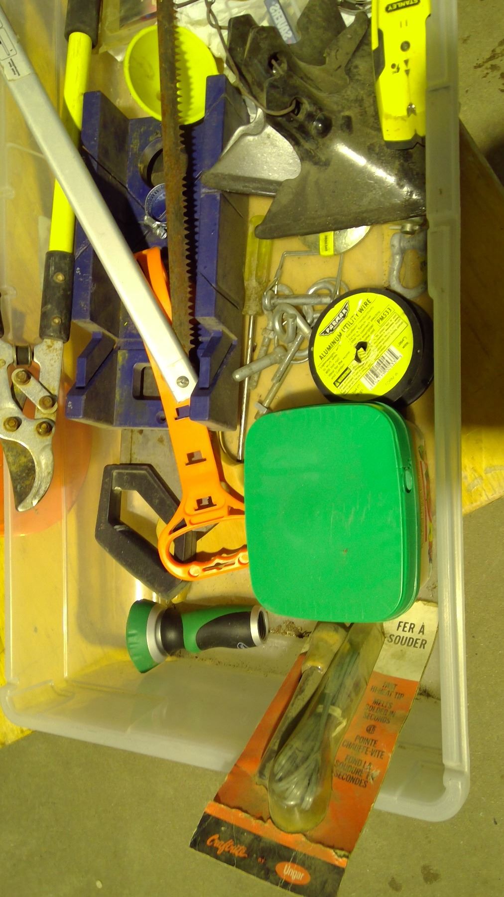 clamps, saw, pruner, funnel, soldering iron, cables and misc. in tub
