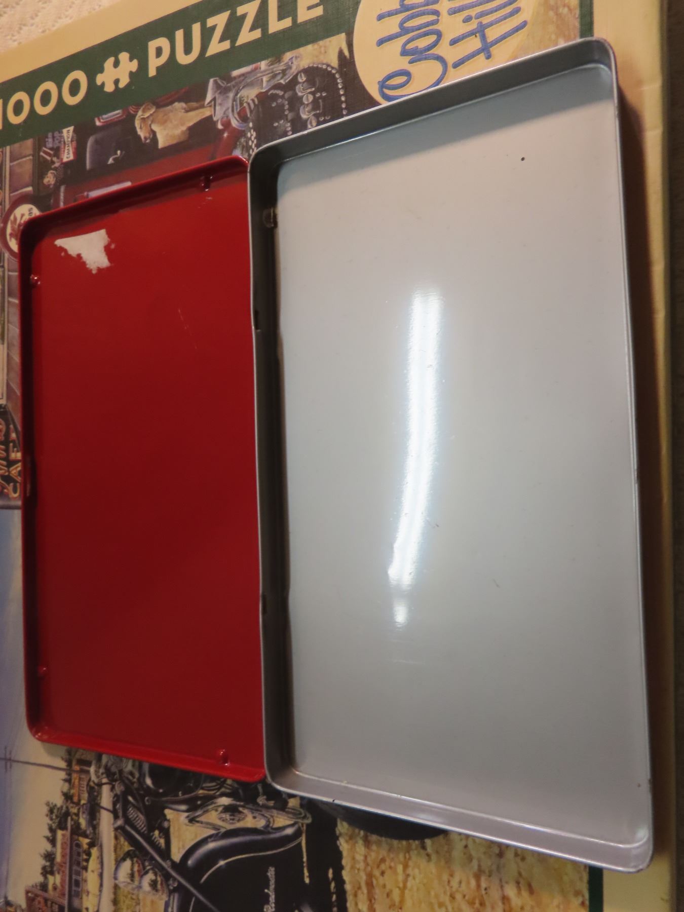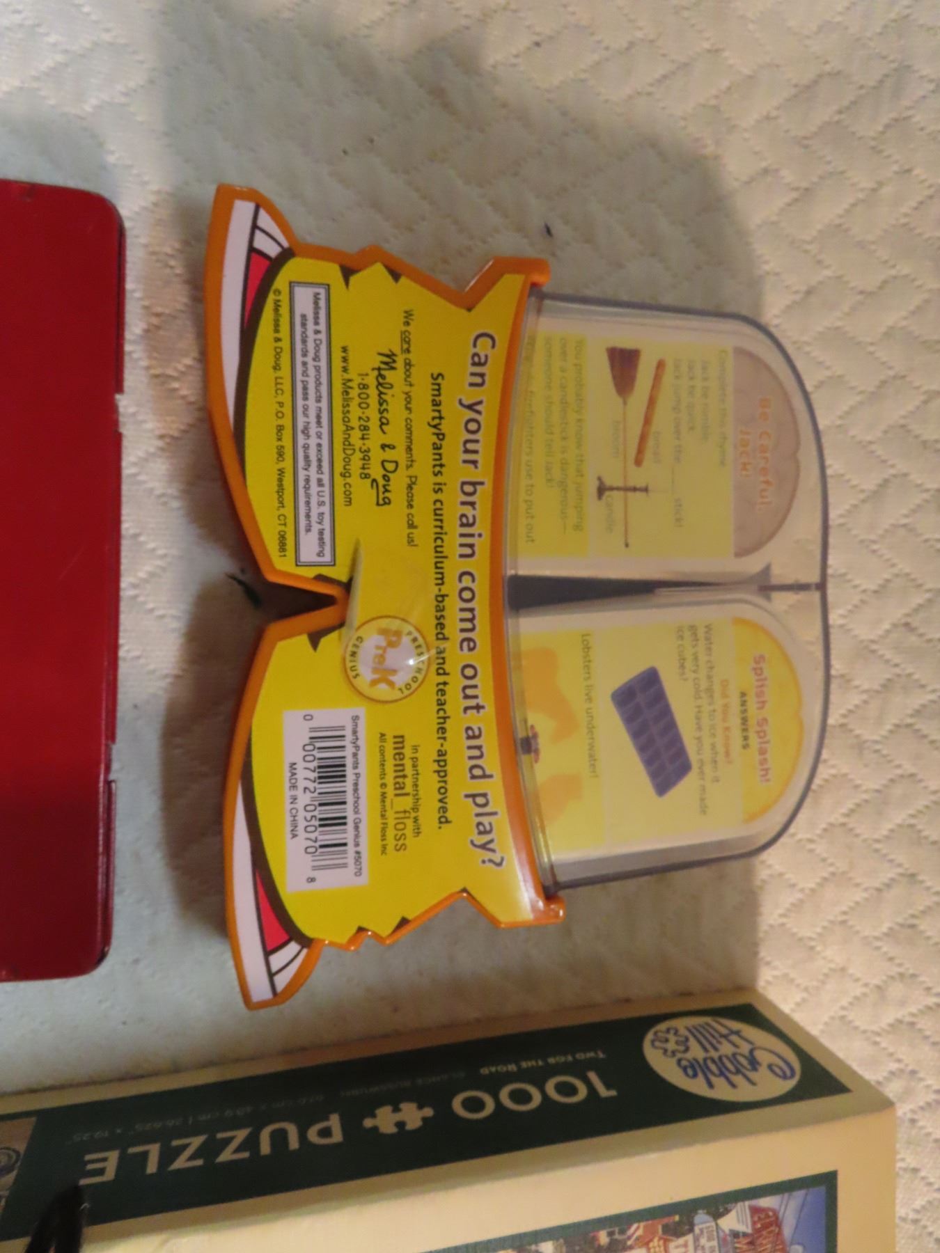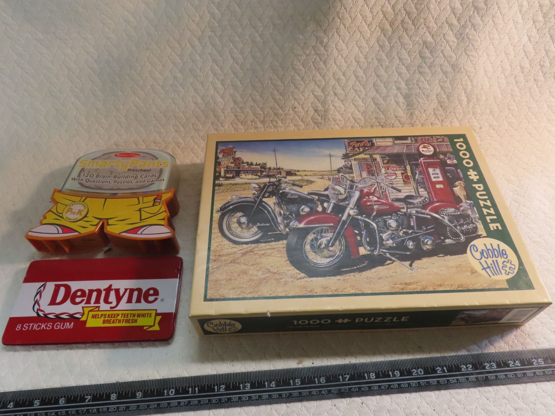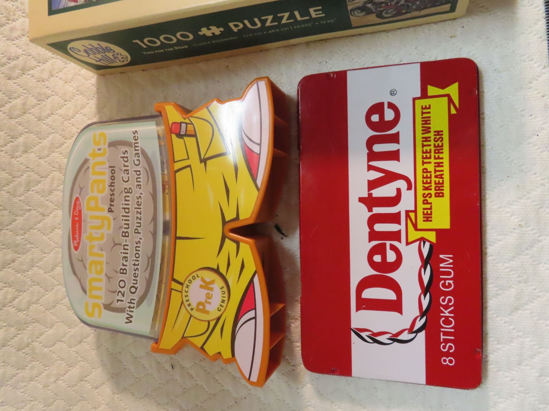 cobble hill puzzle, vintage Dentyne tin, smarty pants card game