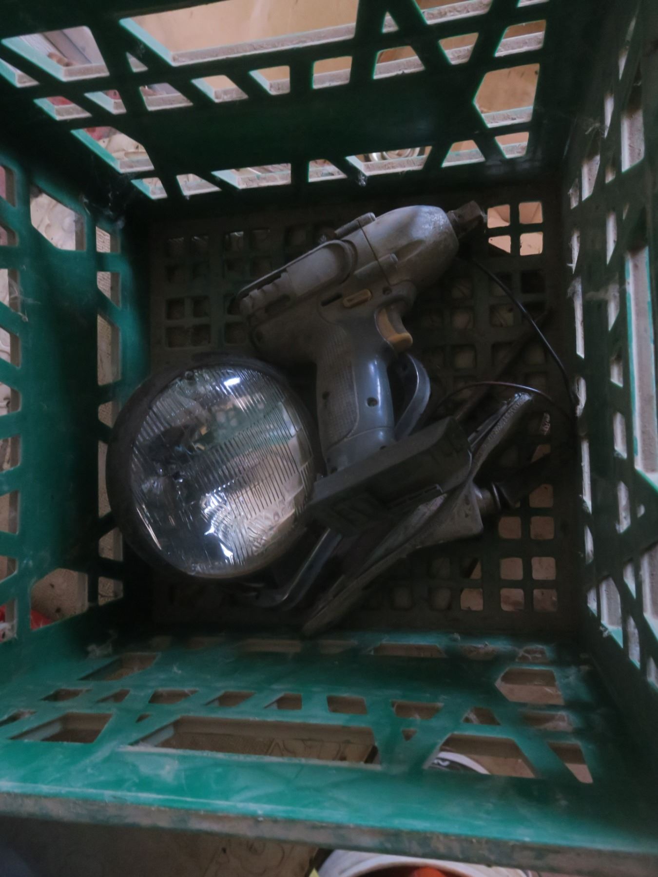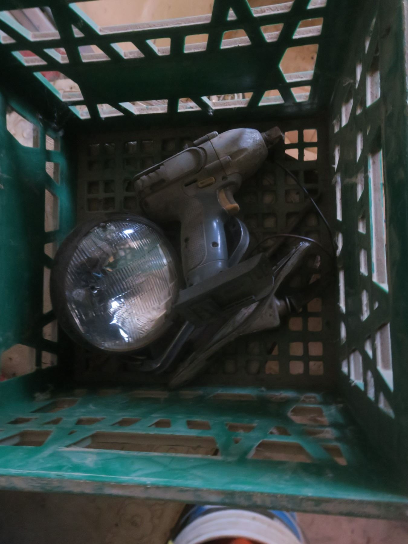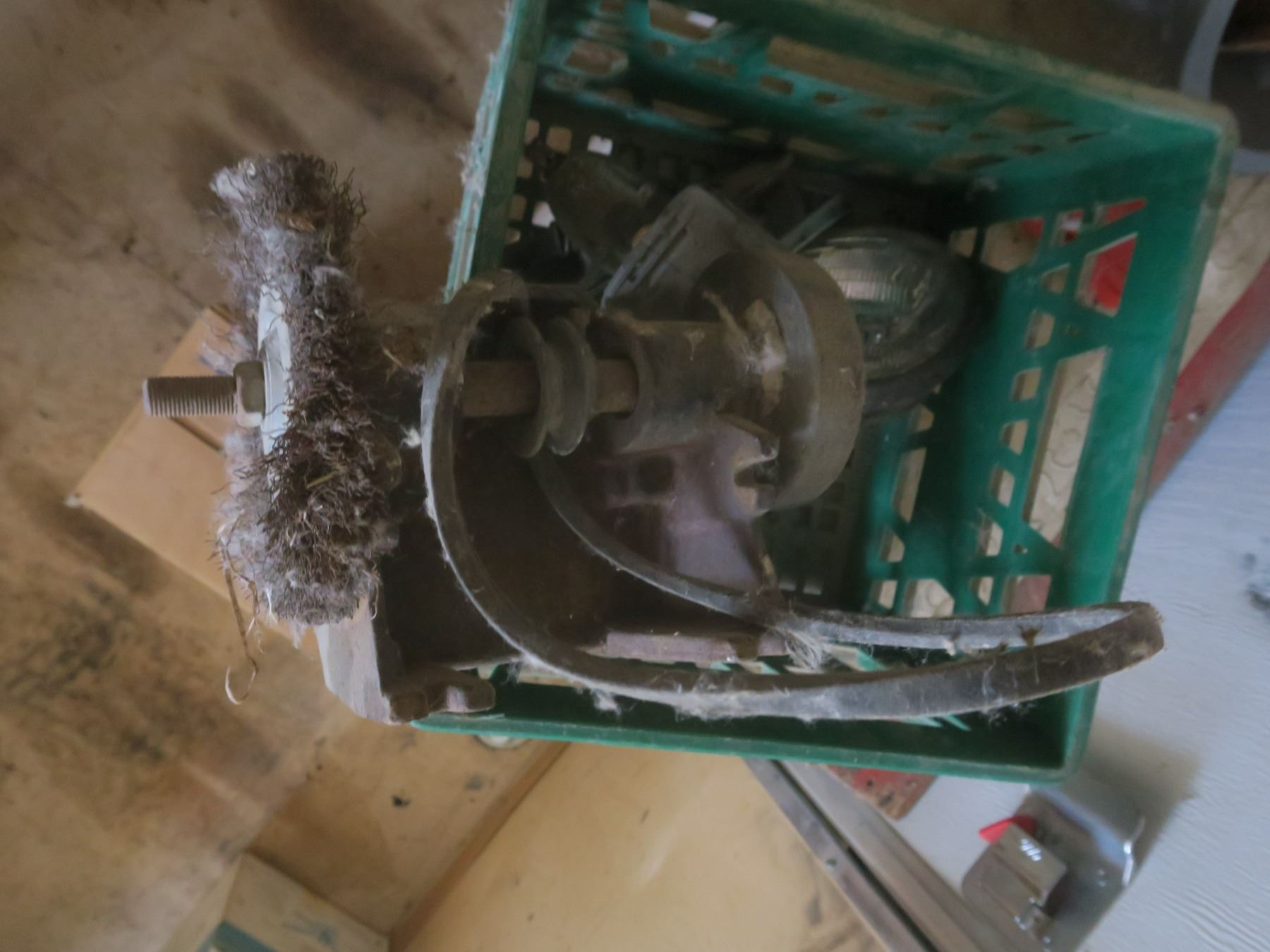 crate with grinder and assorted hardware