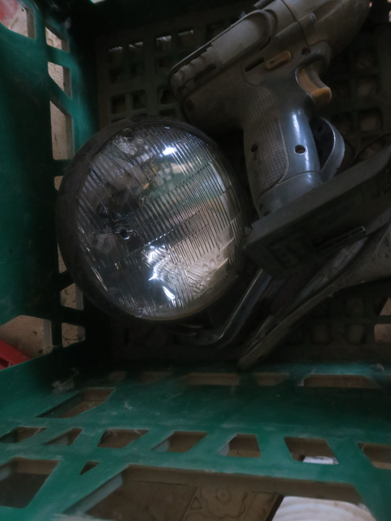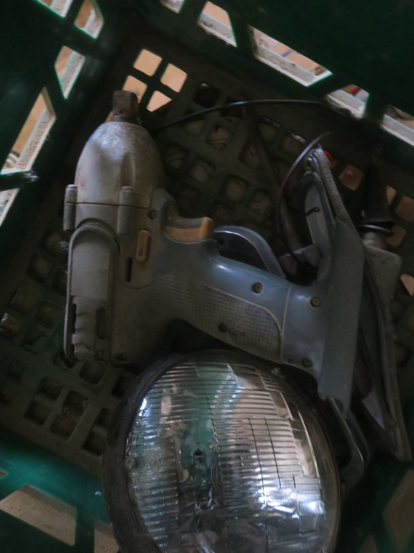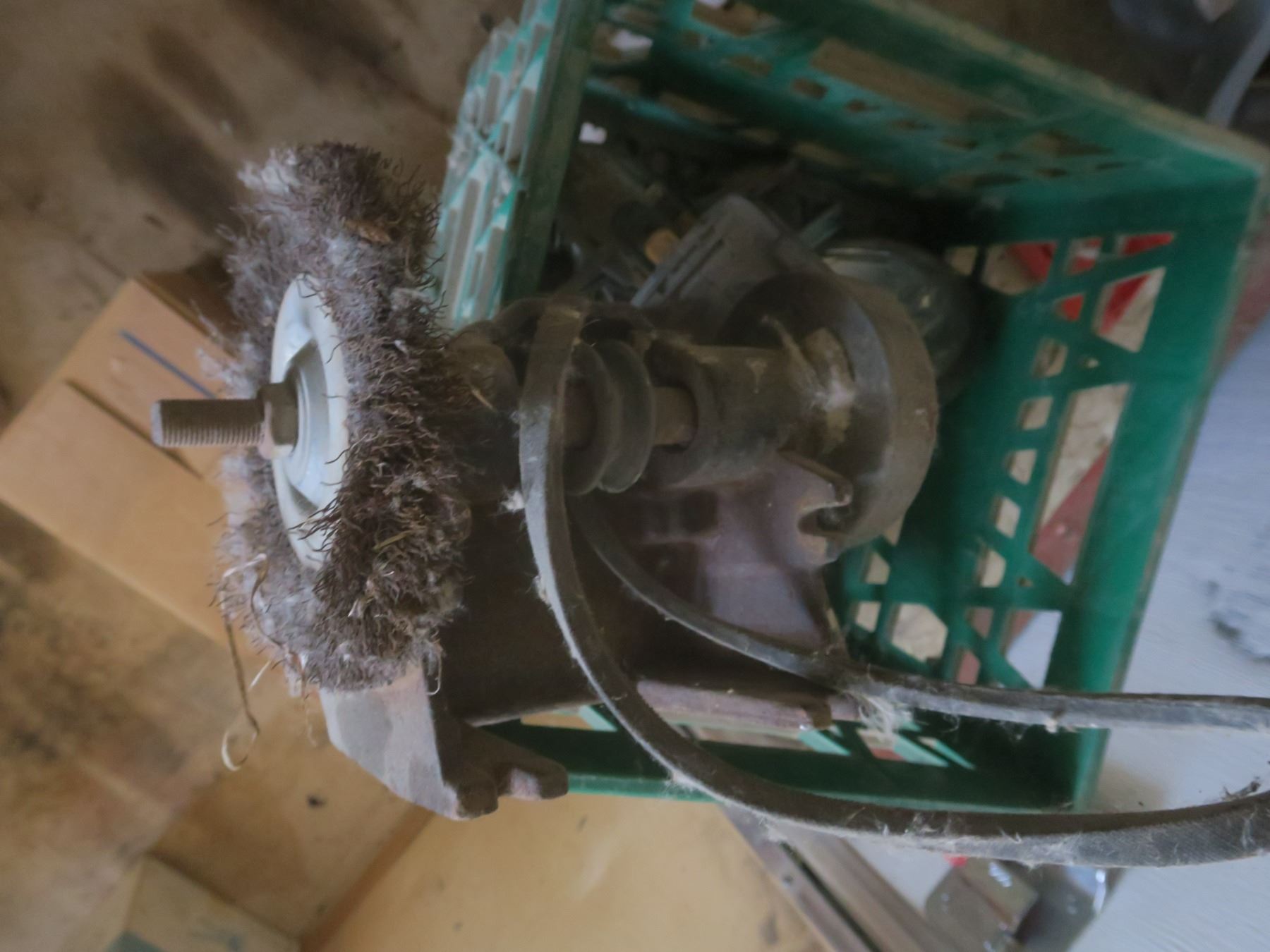 crate with grinder and assorted hardware