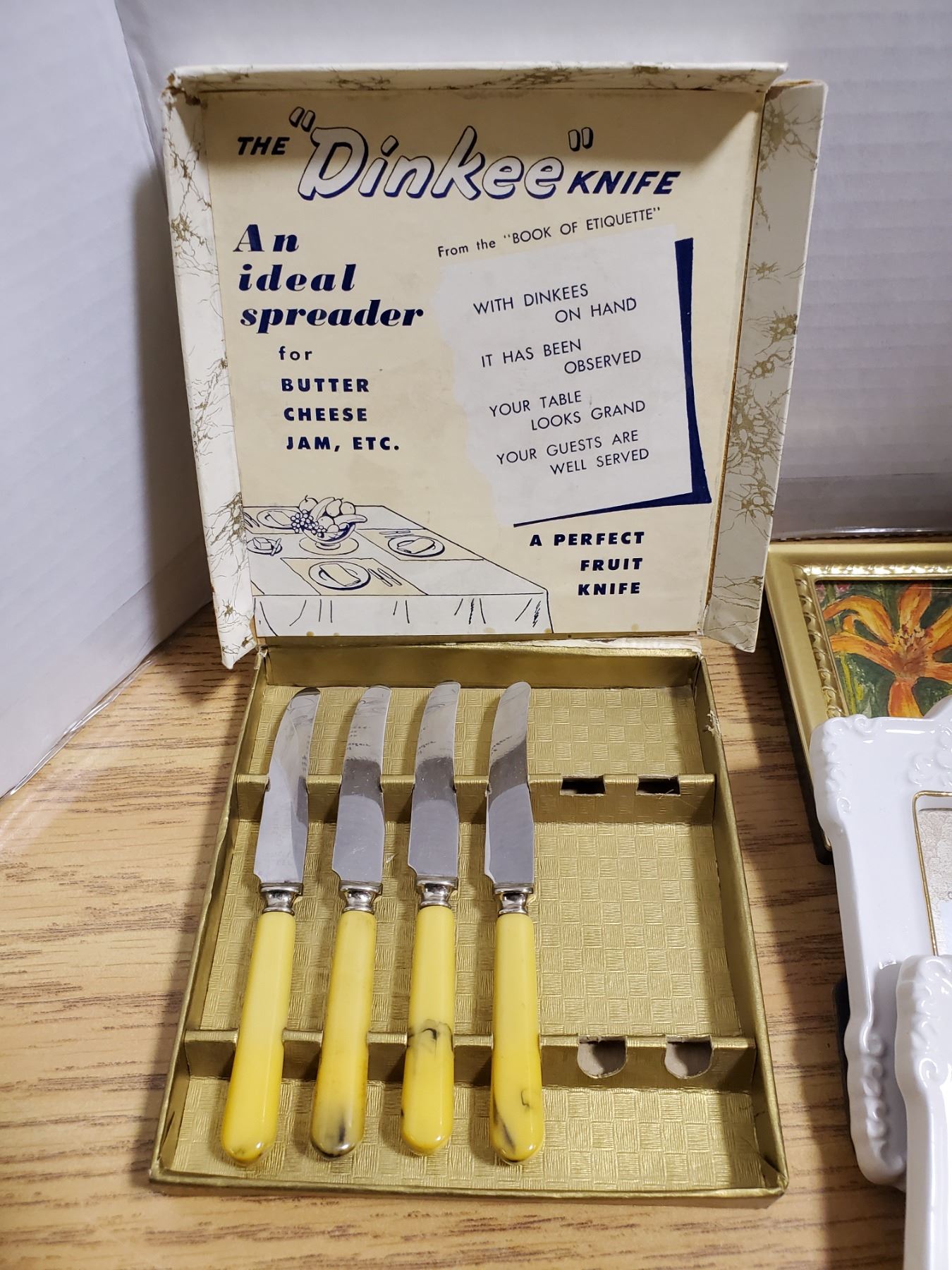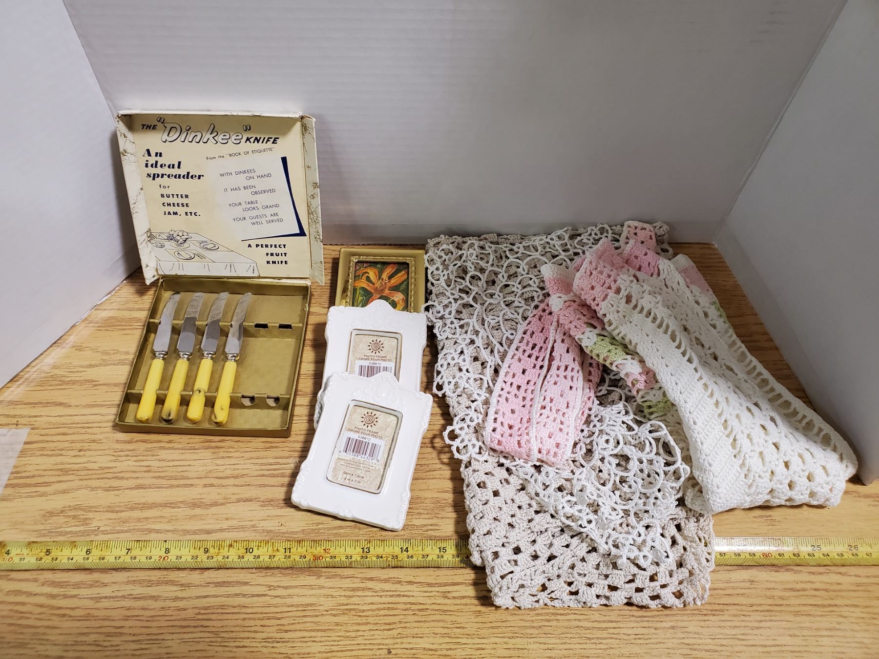 crochet apron & others w/ 3 picture frames & "dinkee knives"