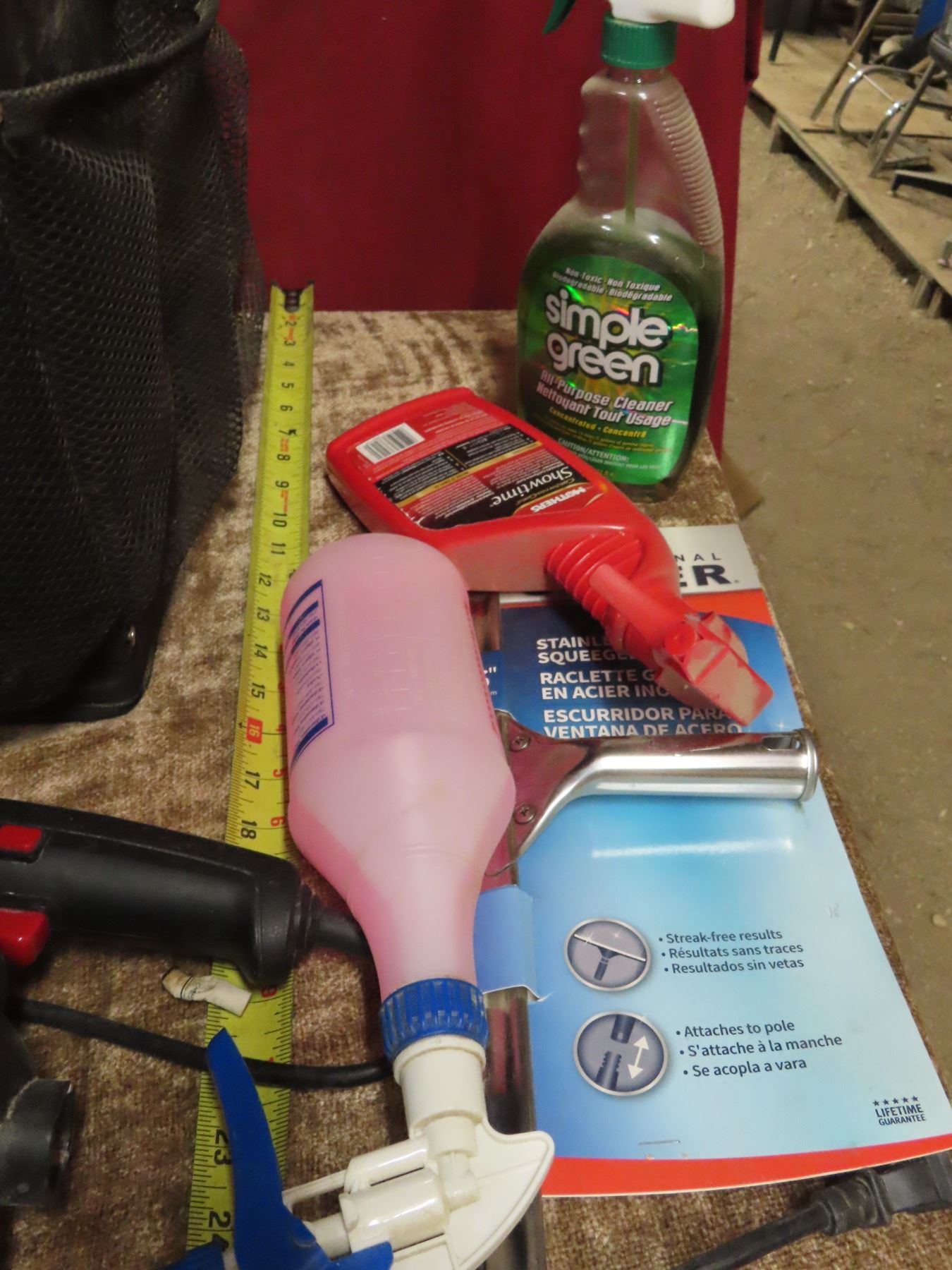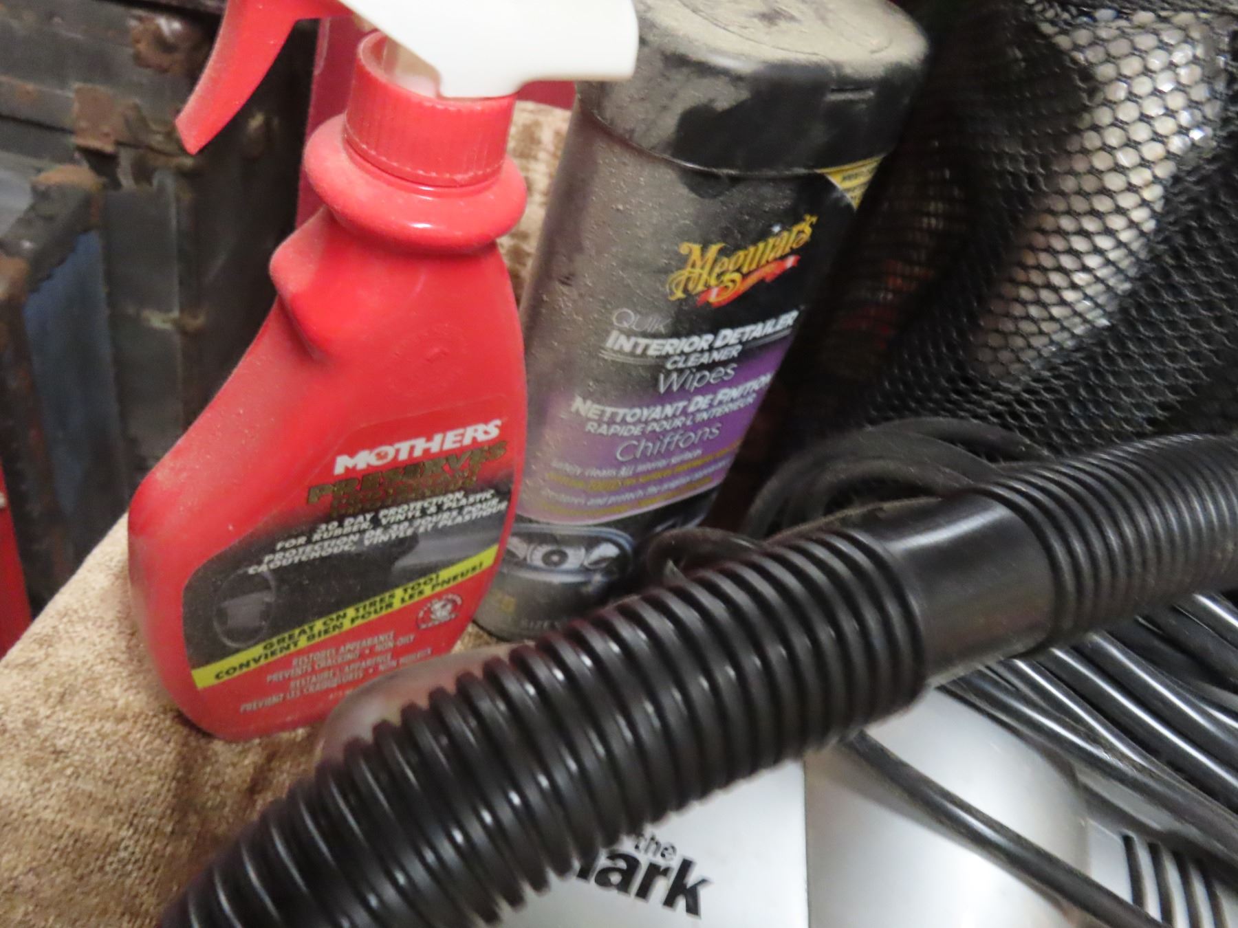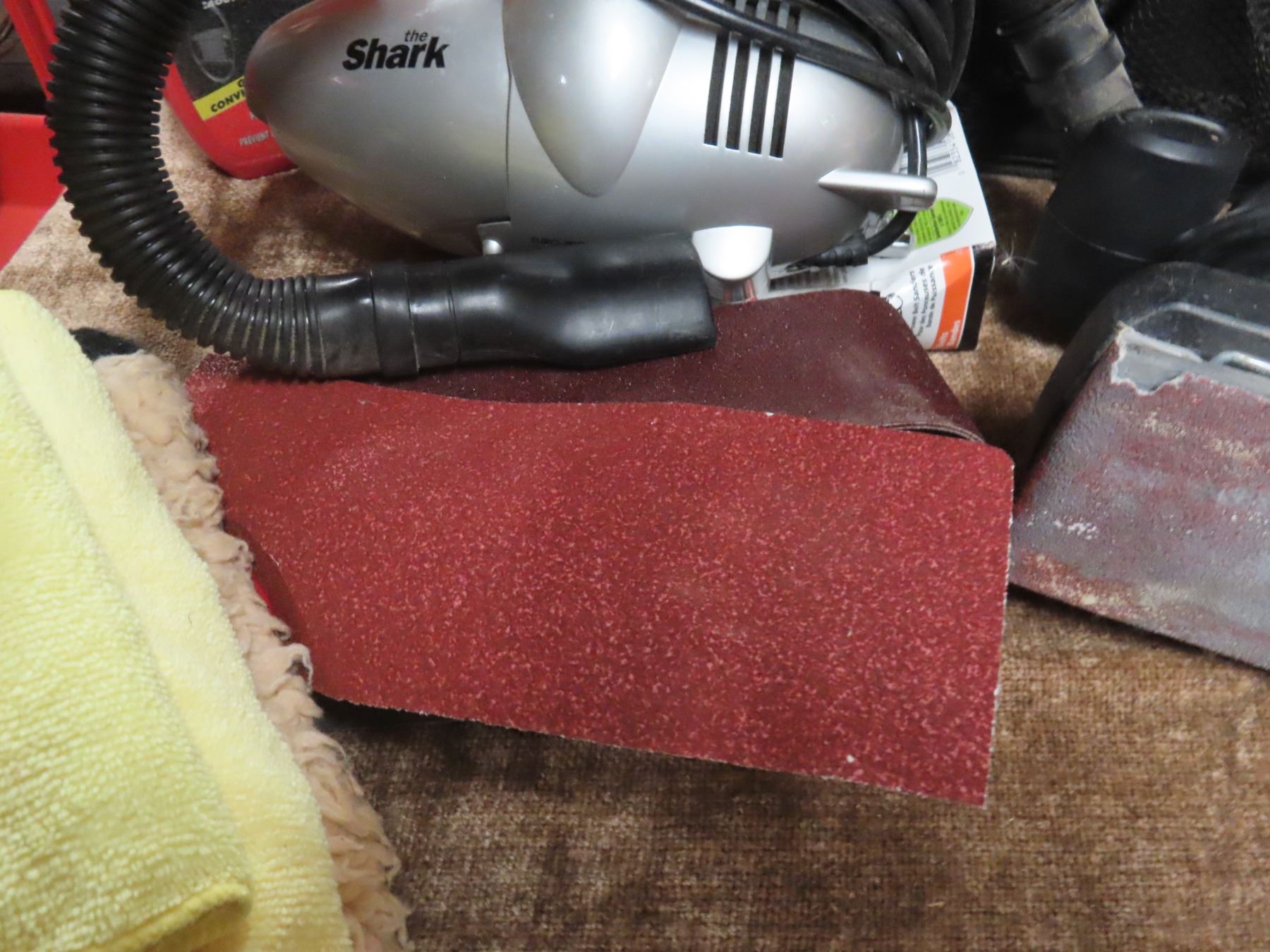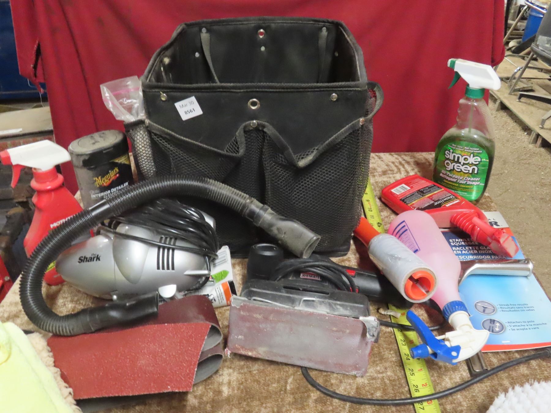 detailing lot with cleaners , cloths and brushes , job mate sander
